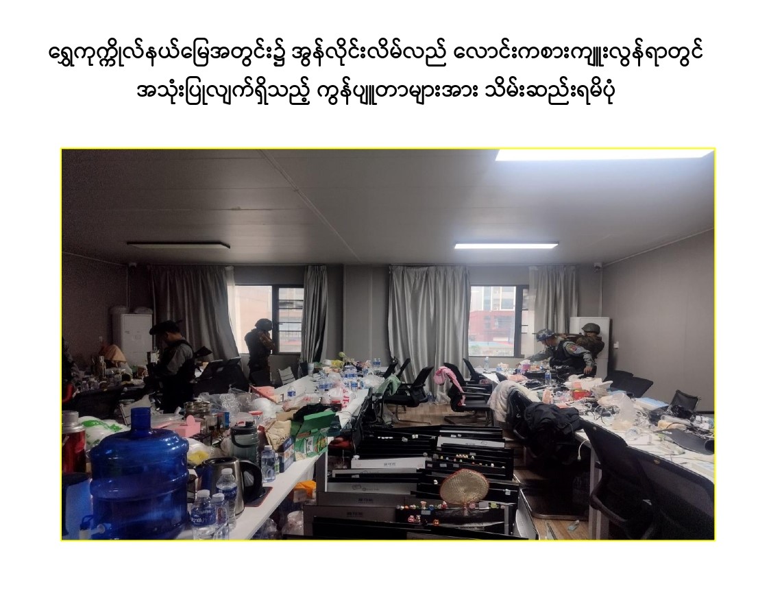 မြန်မာနိုင်ငံအစိုးရအနေဖြင့် နိုင်ငံတကာနှင့် တစ်ကမ္ဘာလုံးကိုအန္တရာယ်ပေးနေသည့် online လိမ်လည်မှုများ၊ online လောင်းကစားမှုများတိုက်ဖျက်ရေးလုပ်ငန်းစဉ်များကို အမျိုးသားရေးတာဝန်တစ်ရပ်အနေဖြင့် အလေးထား တိုက်ဖျက်ဆောင်ရွက်လျက်ရှိသည်။
