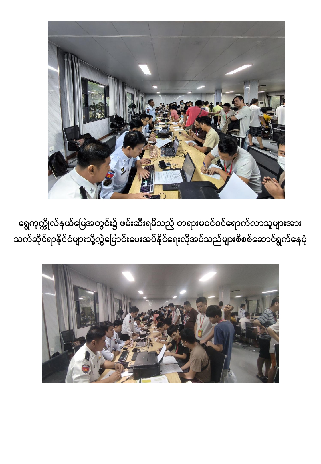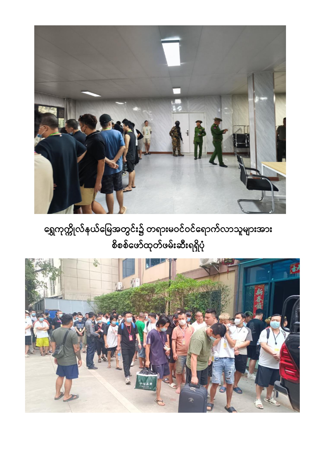 ထိုသို့ ဖော်ထုတ်ထိန်းသိမ်းနိုင်ခဲ့သည့် ပြည်ပနိုင်ငံသားများကို မြဝတီမြို့နယ်၊ ပူလွဲပူ ကျေးရွာအုပ်စု၊ ရွှေကုက္ကိုလ်မြိုင်ကျေးရွာအတွင်း လုံထင်းဝန်းရှိ အဆောက်အဦ၌ ထိန်း သိမ်းထားရှိပြီး တရားမဝင်ပြည်ပနိုင်ငံသား စစ်ဆေးရေးအဖွဲ့မှ စစ်ဆေးခဲ့ရာ ပြည်ပ နိုင်ငံ သား ၂၀၀ ဦးကို စစ်ဆေးနိုင်ခဲ့ပြီး သက်ဆိုင်ရာနိုင်ငံများသို့ အမြန်ဆုံး ပြန်လည် လွှဲပြောင်း ပေးနိုင်ရေးအတွက် ဌာနဆိုင်ရာပူးပေါင်းအဖွဲ့များ၏ လိုအပ်သည့် ကိုယ်ရေးအချက် အလက်များနှင့် မှတ်တမ်းများစာရင်းကောက်ယူခြင်းလုပ်ငန်းများ ဆောင်ရွက်ပေးလျက်ရှိ သည်။