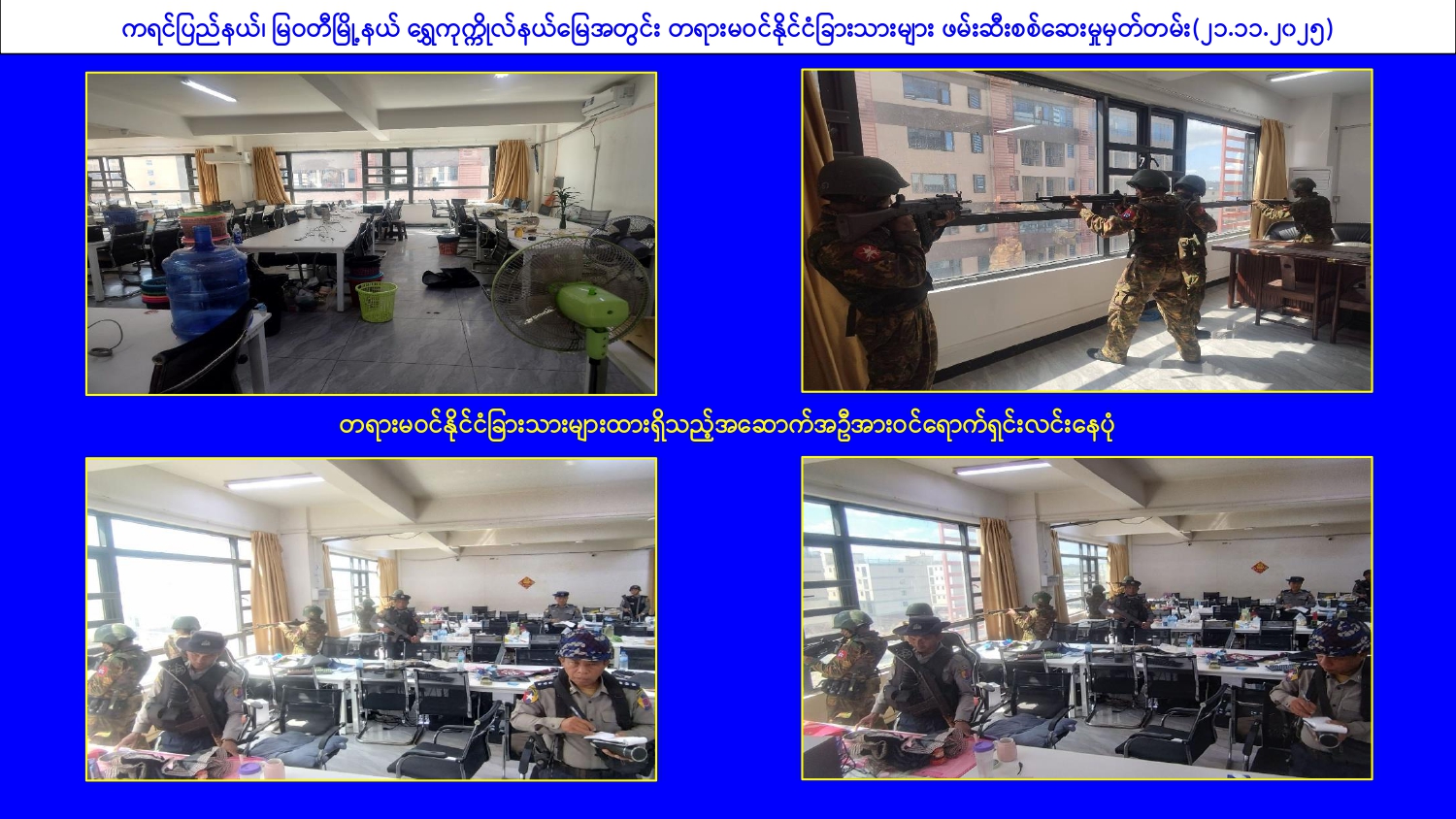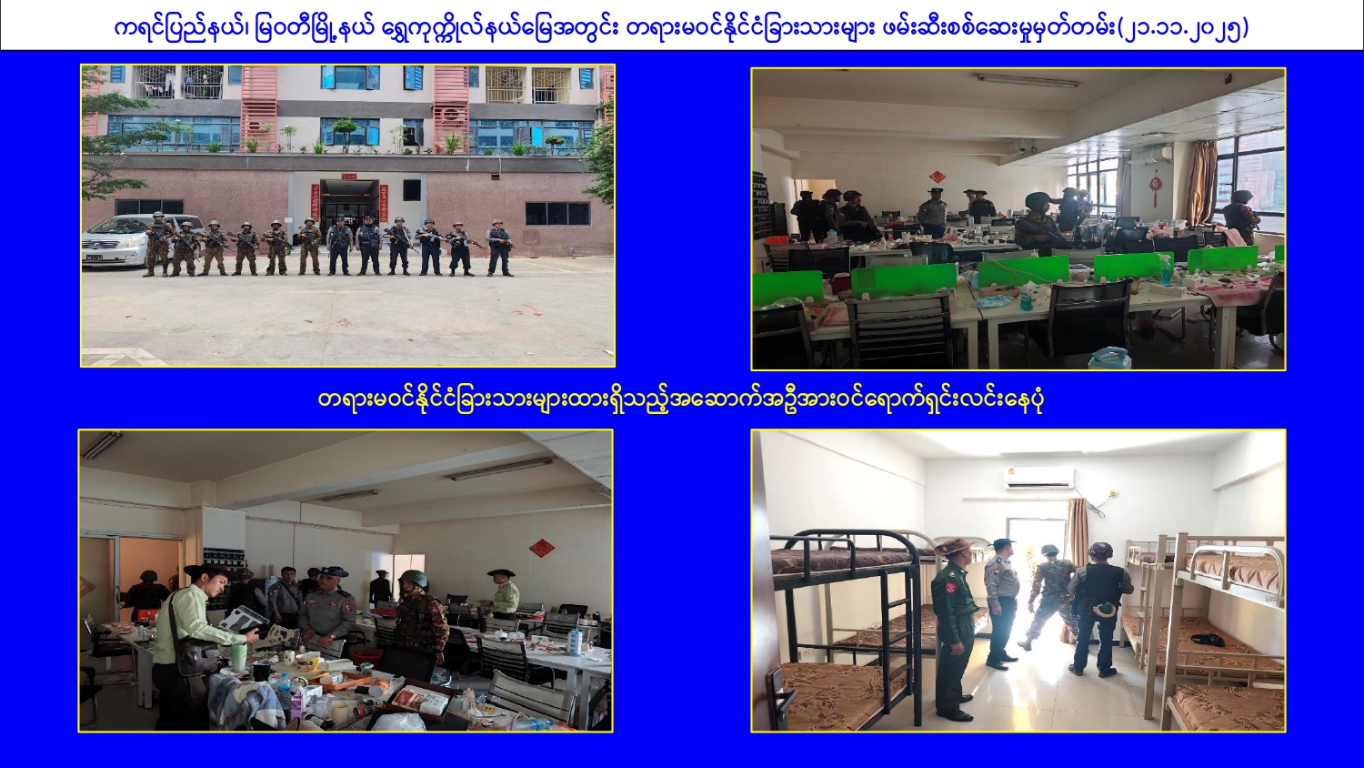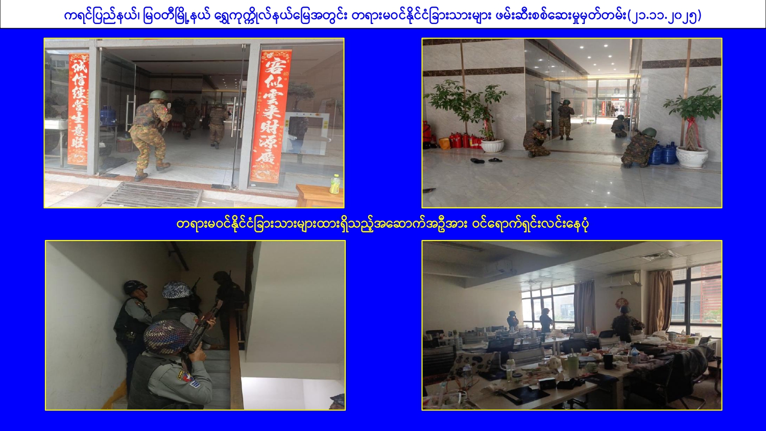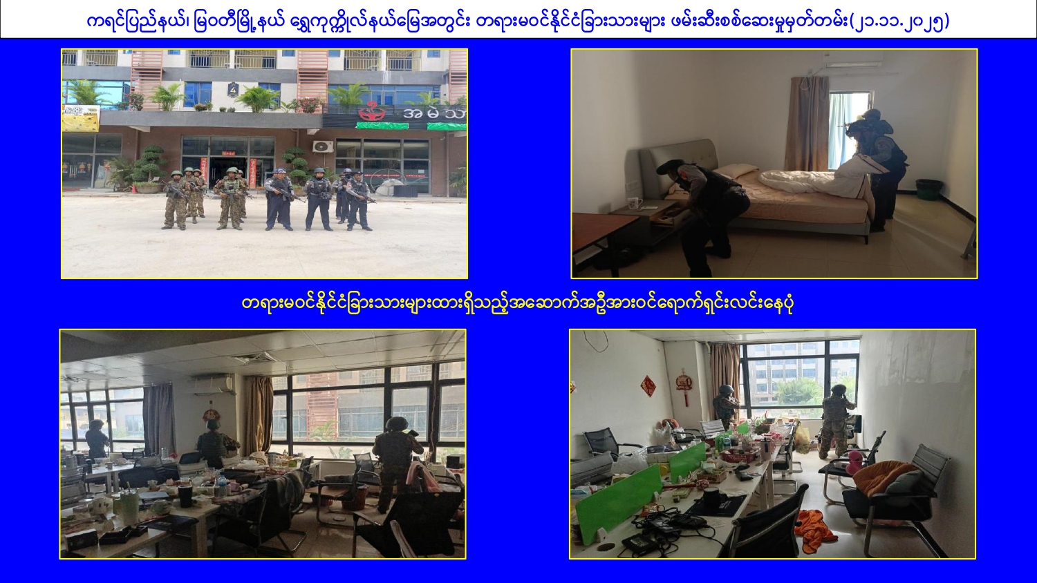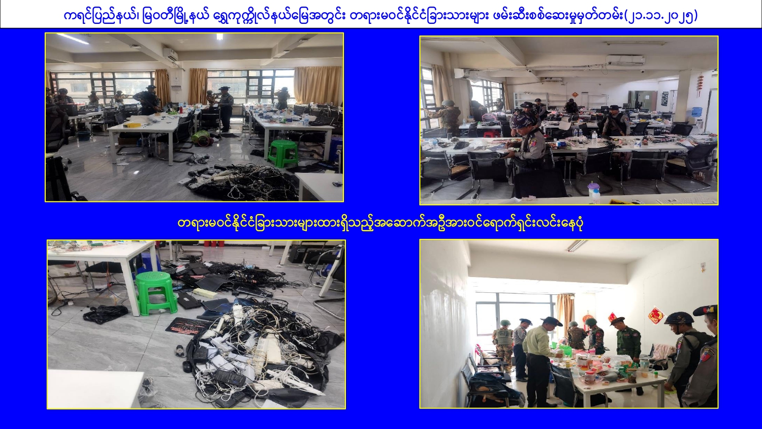 မြန်မာနိုင်ငံအစိုးရအနေဖြင့် နိုင်ငံတကာနှင့် တစ်ကမ္ဘာလုံးကိုအန္တရာယ်ပေးနေသည့် online လိမ်လည်မှုများ၊ online လောင်းကစားမှုများတိုက်ဖျက်ရေးလုပ်ငန်းစဉ်များကို အမျိုးသားရေးတာဝန်တစ်ရပ်အနေဖြင့် အလေးထားတိုက်ဖျက်ဆောင်ရွက်လျက်ရှိပြီး Online လိမ်လည်လောင်းကစားမှုများကို အများဆုံး အခြေချလုပ်ကိုင်လျက်ရှိကြသည့် ရွှေကုက္ကိုလ်နယ်မြေနှင့် KK Park နယ်မြေများ၌ လုံခြုံရေးတပ်ဖွဲ့ဝင်များ၊ အုပ်ချုပ်ရေး အဖွဲ့အစည်းများအပါအဝင် အဖွဲ့စုံပါဝင်သည့် ပူးပေါင်းစစ်ဆင်ရေးအဖွဲ့များဖြင့် ဝင်ရောက် ရှင်းလင်းခြင်း၊ တရားမဝင်အဆောက်အအုံများအား ဖြိုချဖျက်ဆီးခြင်းများ ဆက်လက် ဆောင်ရွက်လျက်ရှိရာ ယနေ့အထိ မြဝတီ-မဲထော်သလေး (KK Park) နယ်မြေအတွင်းရှိ တရားမဝင်အဆောက်အအုံ ၁၉၆ လုံးကို စနစ်တကျ ဖြိုချဖျက်ဆီးခဲ့ပြီး ရွှေကုက္ကိုလ် နယ်မြေအတွင်း၌ Online လောင်းကစားမှုနှင့် လိမ်လည်မှုများ ကျူးလွန်ခဲ့သည့် ပြည်ပ နိုင်ငံသား ၃၅၁ ဦးကိုထပ်မံ ဖော်ထုတ် ထိန်းသိမ်းနိုင်ခဲ့ကြောင်း သိရှိရသည်။