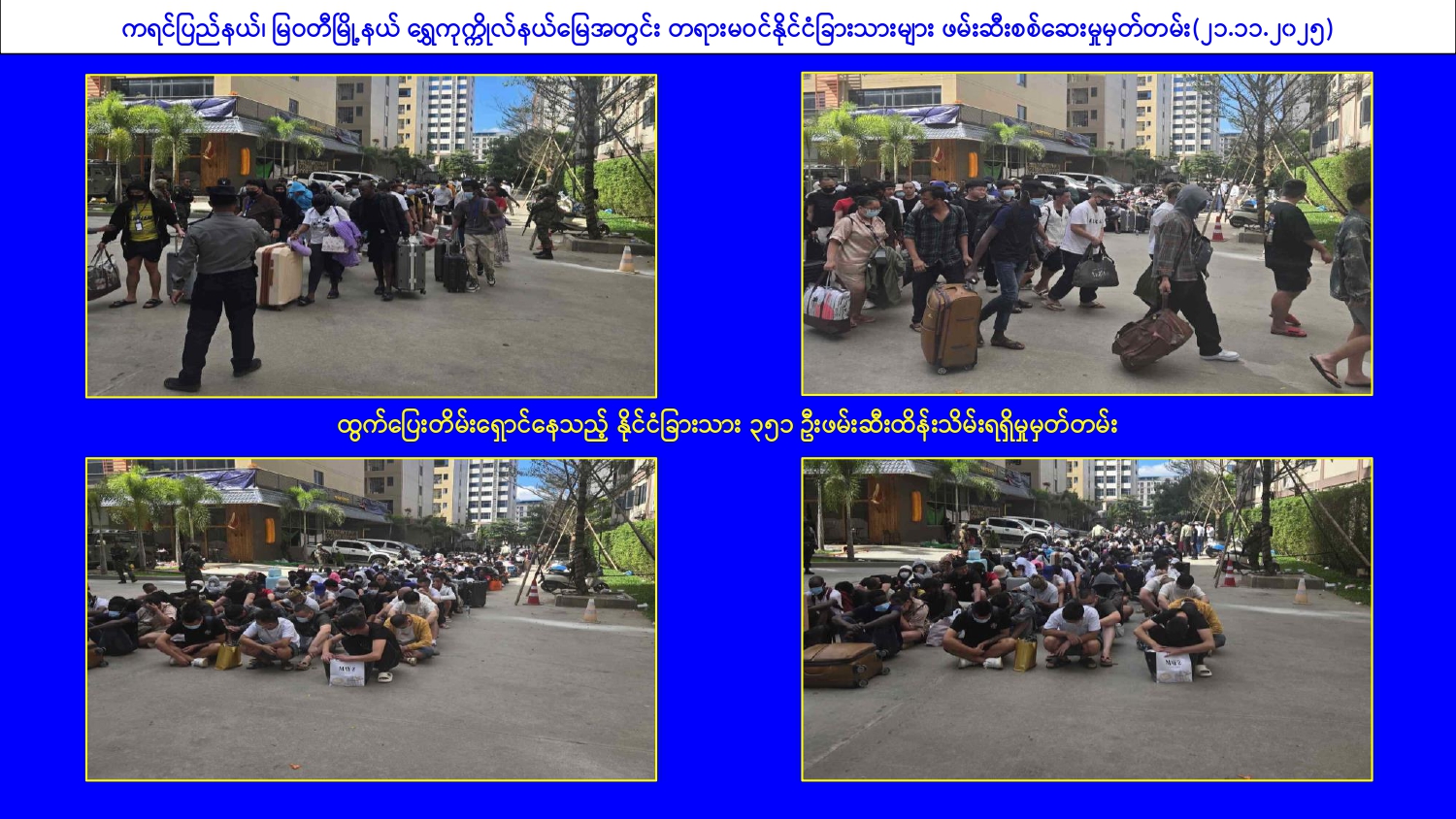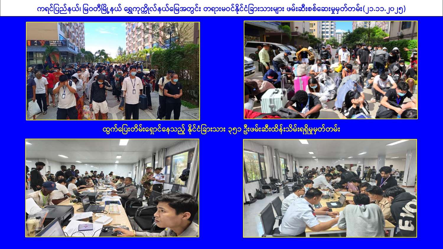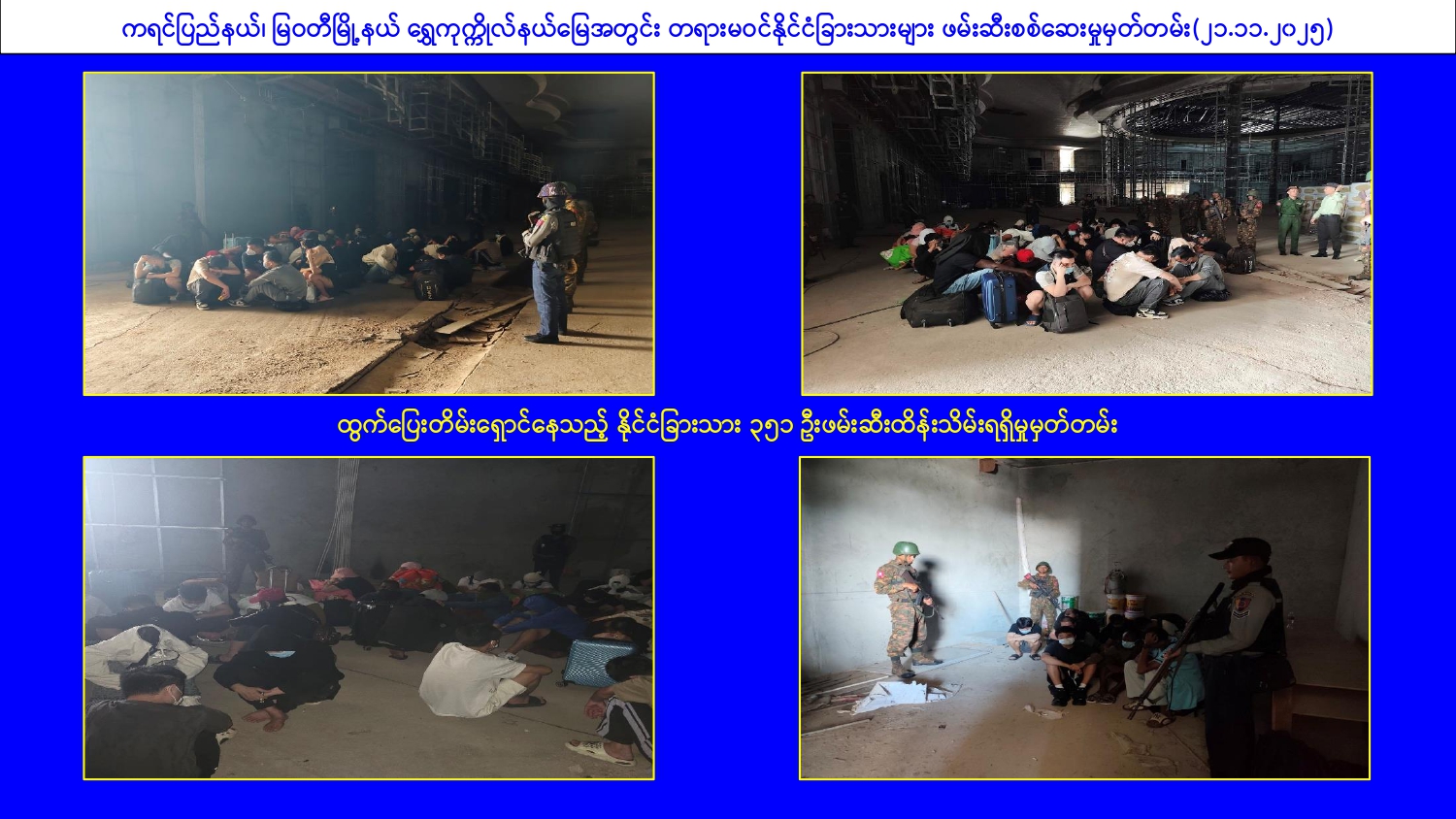 ၂၀၂၅ ခုနှစ်၊ ဇန်နဝါရီလ ၃၀ ရက်မှ နိုဝင်ဘာလ ၂၁ ရက်အထိ မြန်မာနိုင်ငံ အတွင်းသို့ တရားမဝင် ဝင်ရောက်လာသည့် ပြည်ပနိုင်ငံသား စုစုပေါင်း ၁၂၂၀၇ ဦး ထိန်းသိမ်းနိုင်ခဲ့ကာ ၁၁၆၄၀ ဦးကို စစ်ဆေးခဲ့ပြီး ၎င်းတို့အနက်မှ ၉၉၇၈ ဦးကို ထိုင်းနိုင်ငံမှတစ်ဆင့် သက်ဆိုင်ရာနိုင်ငံများသို့ ဥပဒေ လုပ်ထုံး လုပ်နည်းများနှင့်အညီ စနစ်တကျ ပြည်နှင်လွှဲပြောင်းပေးခဲ့ပြီး ကျန်ရှိသည့် ပြည်ပနိုင်ငံသား ၂၂၂၉ ဦးကို သက်ဆိုင်ရာနိုင်ငံများသို့ လွှဲပြောင်းပေးရန် အသင့်ဖြစ်နေပြီဖြစ် ကြောင်းနှင့် ၎င်းတို့ကို ကောင်းမွန်စွာ ထိန်းသိမ်းစောင့်ရှောက်ထားရှိကြောင်း သိရှိရသည်။