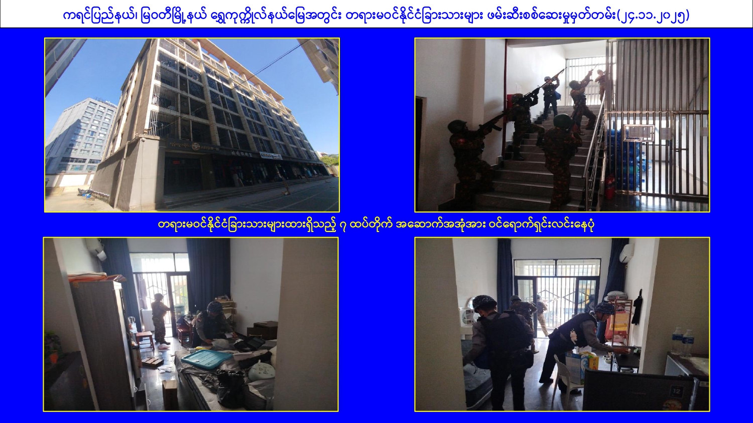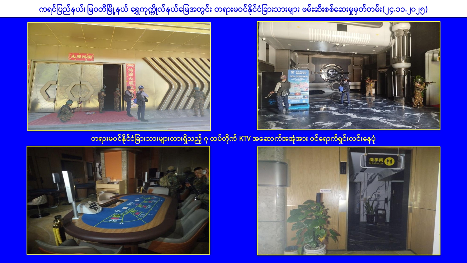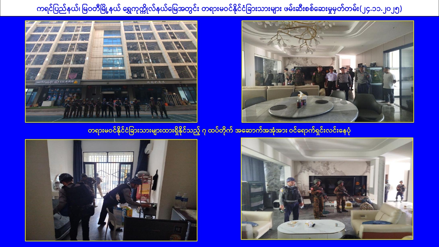 မြန်မာနိုင်ငံအစိုးရအနေဖြင့် online လိမ်လည်မှုများနှင့် online လောင်းကစားမှု များ အများဆုံးအခြေချလုပ်ကိုင်လျက်ရှိကြသည့် ရွှေကုက္ကိုလ်နယ်မြေနှင့် KK Park နယ်မြေများ၌ လုံခြုံရေးတပ်ဖွဲ့ဝင်များ၊ အုပ်ချုပ်ရေးအဖွဲ့အစည်းများအပါအဝင် အဖွဲ့စုံ ပါဝင်သည့် ပူးပေါင်းစစ်ဆင်ရေးအဖွဲ့များဖြင့် ဝင်ရောက်ရှင်းလင်းခြင်း၊ တရားမဝင် အဆောက်အအုံများအား ဖြိုချဖျက်ဆီးခြင်းများ ဆက်လက်ဆောင်ရွက်လျက်ရှိသည်။