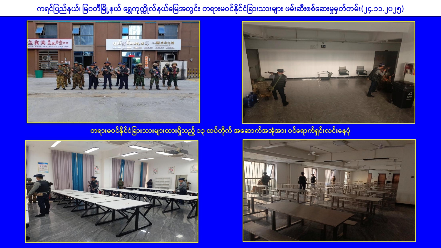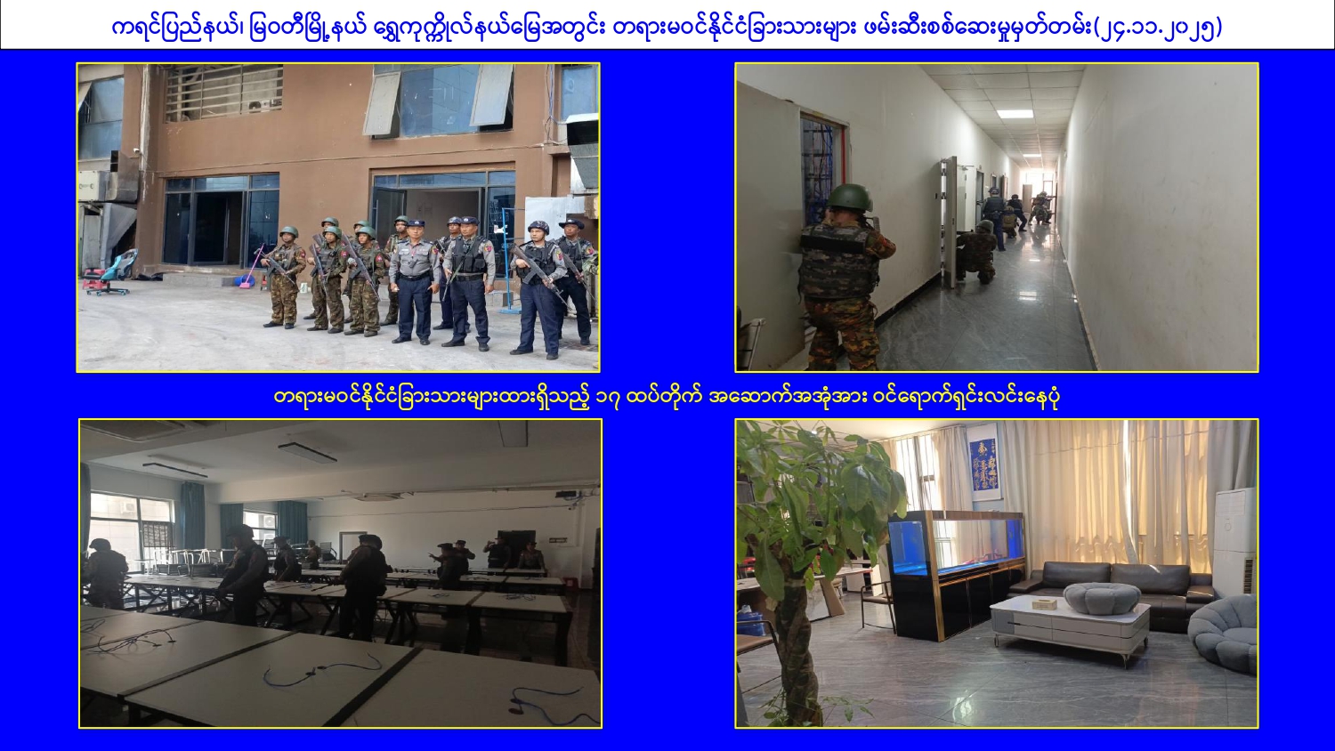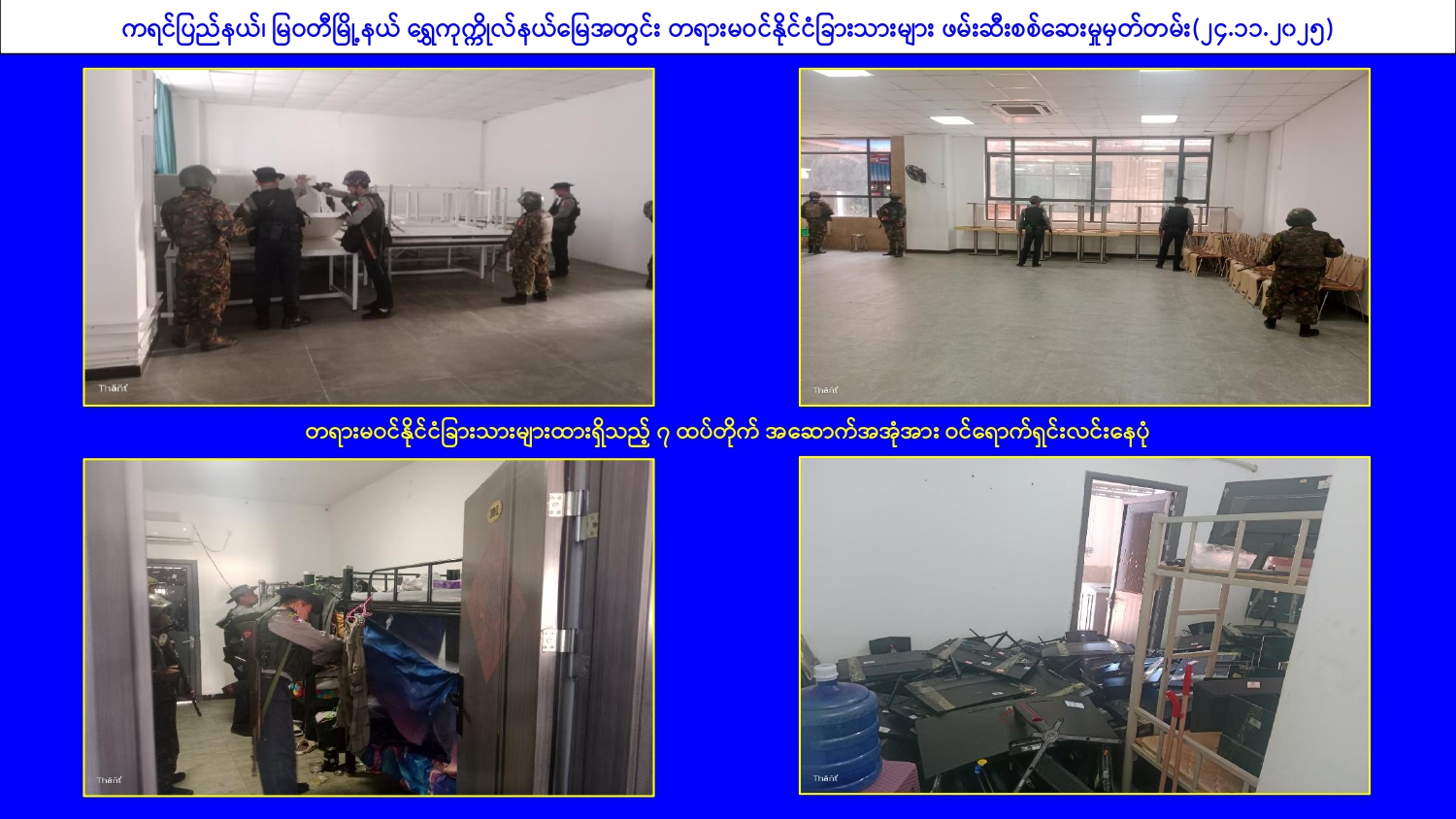 မြန်မာနိုင်ငံအစိုးရအနေဖြင့် online လိမ်လည်မှုများနှင့် online လောင်းကစားမှု များ အများဆုံးအခြေချလုပ်ကိုင်လျက်ရှိကြသည့် ရွှေကုက္ကိုလ်နယ်မြေနှင့် KK Park နယ်မြေများ၌ လုံခြုံရေးတပ်ဖွဲ့ဝင်များ၊ အုပ်ချုပ်ရေးအဖွဲ့အစည်းများအပါအဝင် အဖွဲ့စုံ ပါဝင်သည့် ပူးပေါင်းစစ်ဆင်ရေးအဖွဲ့များဖြင့် ဝင်ရောက်ရှင်းလင်းခြင်း၊ တရားမဝင် အဆောက်အအုံများအား ဖြိုချဖျက်ဆီးခြင်းများ ဆက်လက်ဆောင်ရွက်လျက်ရှိသည်။