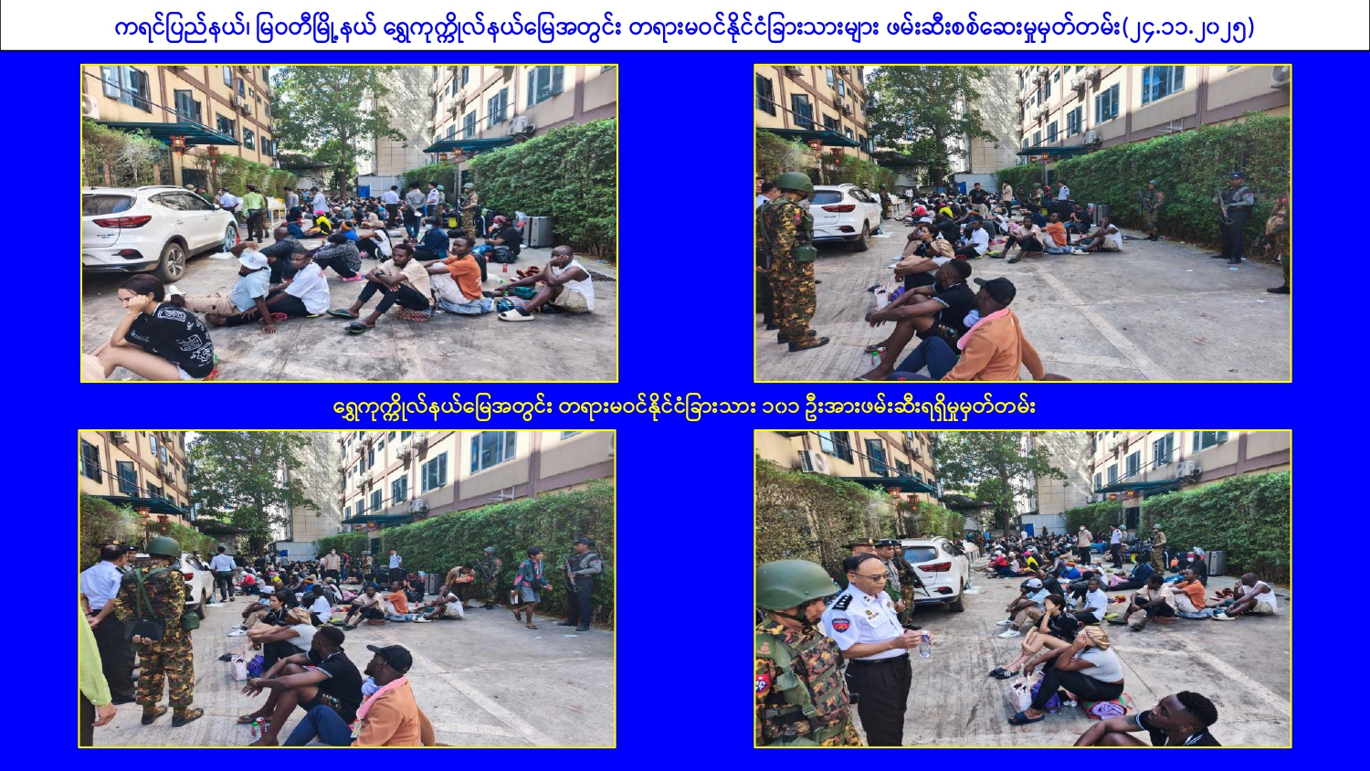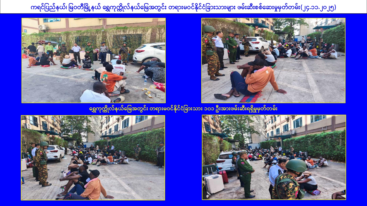 ၂၀၂၅ ခုနှစ်၊ ဇန်နဝါရီ ၃၀ ရက်မှ နိုဝင်ဘာ ၂၄ ရက်အထိ မြန်မာနိုင်ငံအတွင်းသို့ တရားမဝင်ဝင်ရောက်လာသည့် ပြည်ပနိုင်ငံသား စုစုပေါင်း ၁၂၆၈၇ ဦး ထိန်းသိမ်းနိုင်ခဲ့ကာ ၁၂၃၄၃ ဦးကို ပြည်နှင်နိုင်ရေး စစ်ဆေးခဲ့ပြီး ၎င်းတို့အနက်မှ ၉၉၇၈ ဦးကို ထိုင်းနိုင်ငံမှ တစ်ဆင့် သက်ဆိုင်ရာနိုင်ငံများသို့ ဥပဒေ လုပ်ထုံးလုပ်နည်းများနှင့်အညီ စနစ်တကျ ပြည်နှင်လွှဲပြောင်းပေးခဲ့ပြီးဖြစ်ကြောင်း၊ ကျန်ရှိသည့် ပြည်ပနိုင်ငံသား ၂၇၀၉ ဦးကို သက်ဆိုင်ရာနိုင်ငံ များသို့ လွှဲပြောင်းပေးရန် အသင့်ဖြစ်နေပြီဖြစ်ကြောင်းနှင့် ၎င်းတို့ကို ကောင်းမွန်စွာ ထိန်းသိမ်းစောင့်ရှောက်ထားရှိကြောင်း သိရှိရသည်။