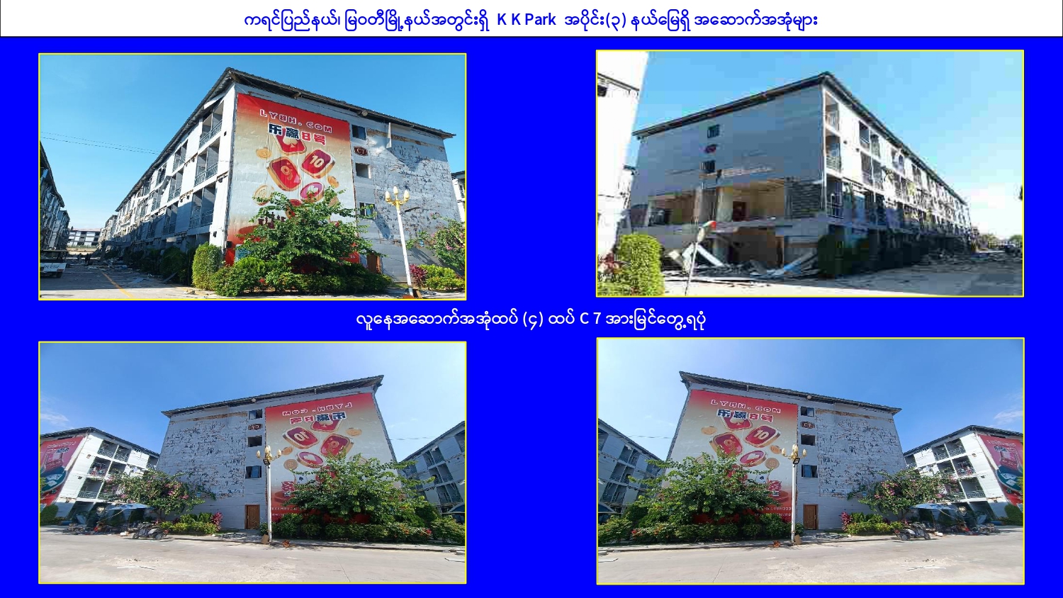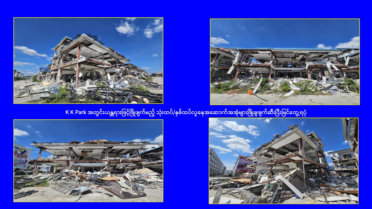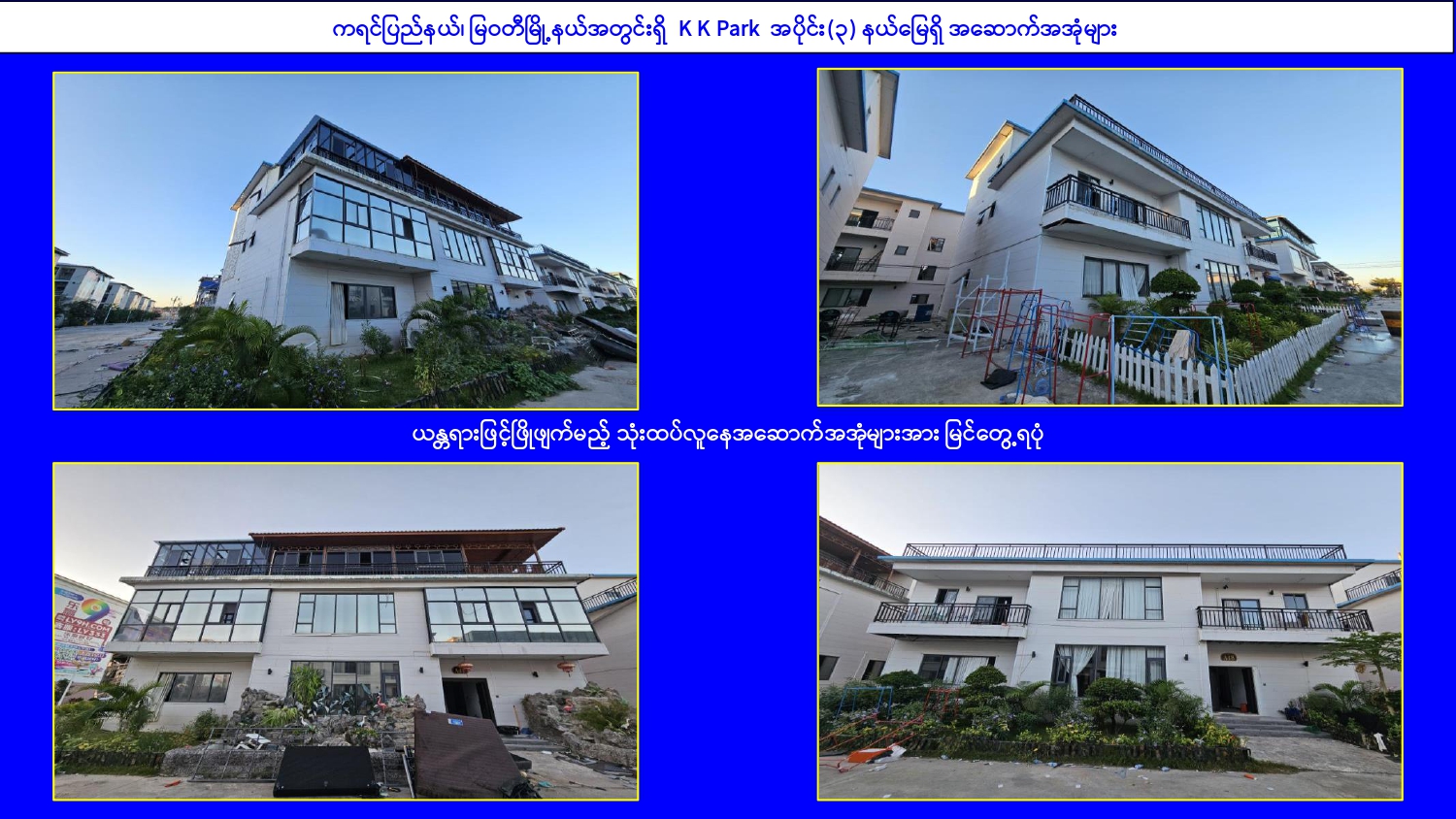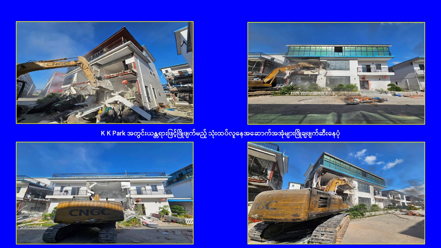 ထိုသို့ online လိမ်လည်မှုများနှင့် online လောင်းကစားမှု တိုက်ဖျက်ရေး လုပ်ငန်းများဆောင်ရွက်ရာတွင် မြဝတီ-မဲထော်သလေး (KK Park) နယ်မြေအတွင်းရှိ Online လိမ်လည်လောင်းကစားမှုများကျူးလွန်ရာတွင် အသုံးပြုခဲ့သည့် အဆောက်အအုံ များကို အပိုင်း(၃)ပိုင်းခွဲ၍ ဖြိုချဖျက်ဆီးခြင်းများဆောင်ရွက်လျက်ရှိရာ အပိုင်း (၁) နယ် မြေအတွင်းရှိ အဆောက်အအုံ ၁၄၈ လုံးကို အားလုံးဖြိုချဖျက်ဆီးပြီးစီးပြီဖြစ်ကြောင်း သိရှိရသည်။ ထို့နောက် အပိုင်း (၃) နယ်မြေအတွင်းရှိ အဆောက်အအုံများကို နိုဝင်ဘာ ၁၇ ရက်မှ စတင်၍ ဖြိုချဖျက်ဆီးလျက်ရှိရာ ယနေ့တွင် တရားမဝင်အဆောက်အအုံ ၁၁ လုံးကို ထပ်မံဖြိုချဖျက်ဆီးခဲ့သဖြင့် အပိုင်း (၃)နယ်မြေအတွင်းရှိ အဆောက်အအုံ ၄၂၅ လုံးအနက် ယနေ့အထိ ၈၀ လုံး ဖြိုချဖျက်ဆီးခဲ့ကြောင်းနှင့် KK Park နယ်မြေအတွင်းရှိ တရားမဝင်အဆောက်အအုံ စုစုပေါင်း ၆၃၅ လုံး အနက် ၂၂၈ လုံးကို ဖြိုချဖျက်ဆီး ပြီးဖြစ်ကြောင်း သိရှိရသည်။