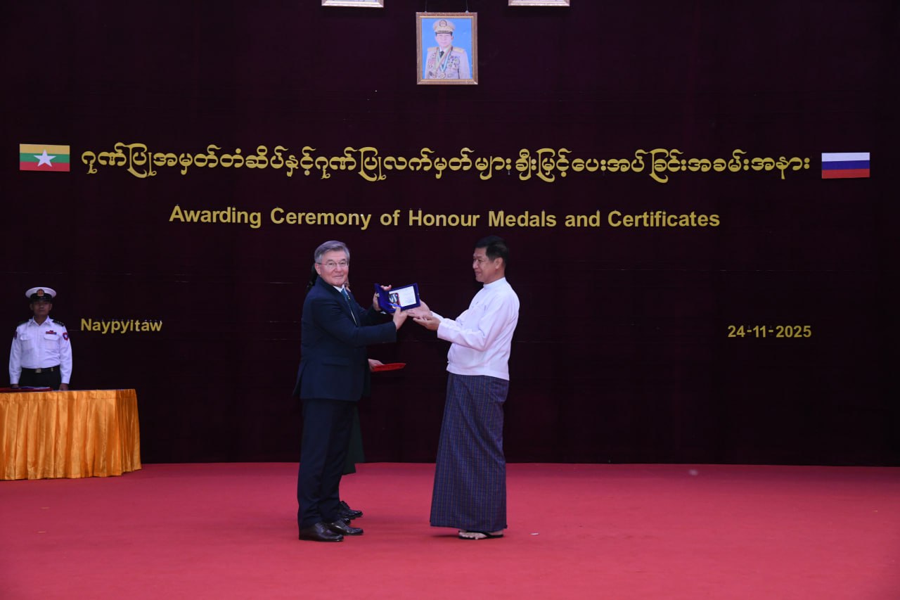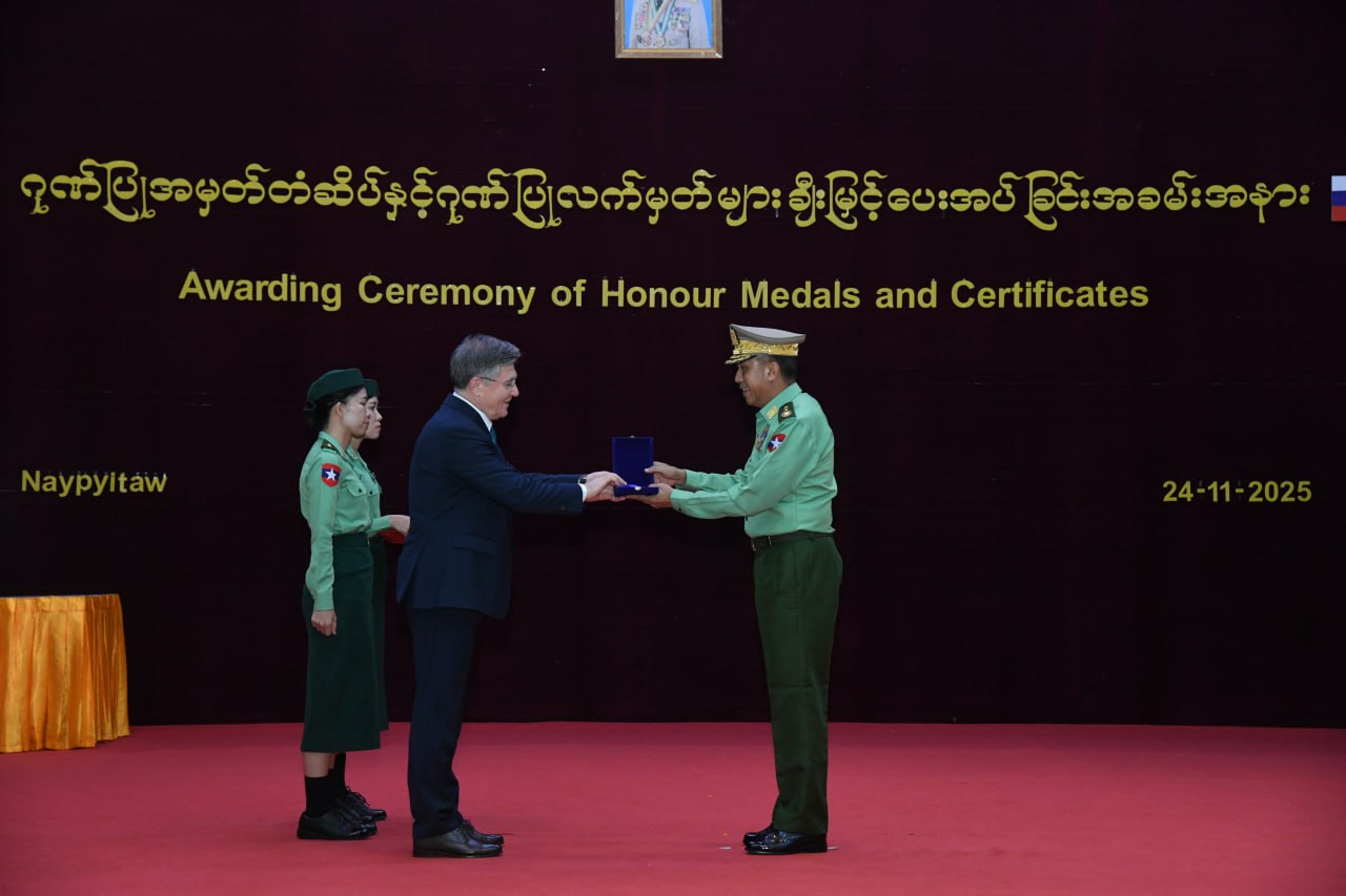 ငလျင်ကယ်ဆယ်ရေးလုပ်ငန်းများကို စွမ်းစွမ်းတမံဆောင်ရွက်ခဲ့ကြသည့် မြန်မာနိုင်ငံ၊ ကာကွယ်ရေးဝန်ကြီးဌာနမှကိုယ်စားလှယ်များအား ရုရှားနိုင်ငံ၊ လူထုကာကွယ်ရေး၊ အရေးအပေါ်အခြေအနေများနှင့် သဘာဝဘေးအန္တရာယ်ရေးဝန်ကြီးဌာန(EMERCOM)မှ ချီးမြှင့်သည့်ဂုဏ်ပြုအမှတ်တံဆိပ်နှင့် ဂုဏ်ပြုလက်မှတ်များပေးအပ်