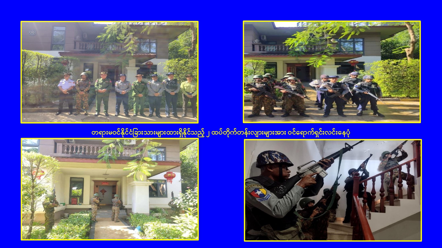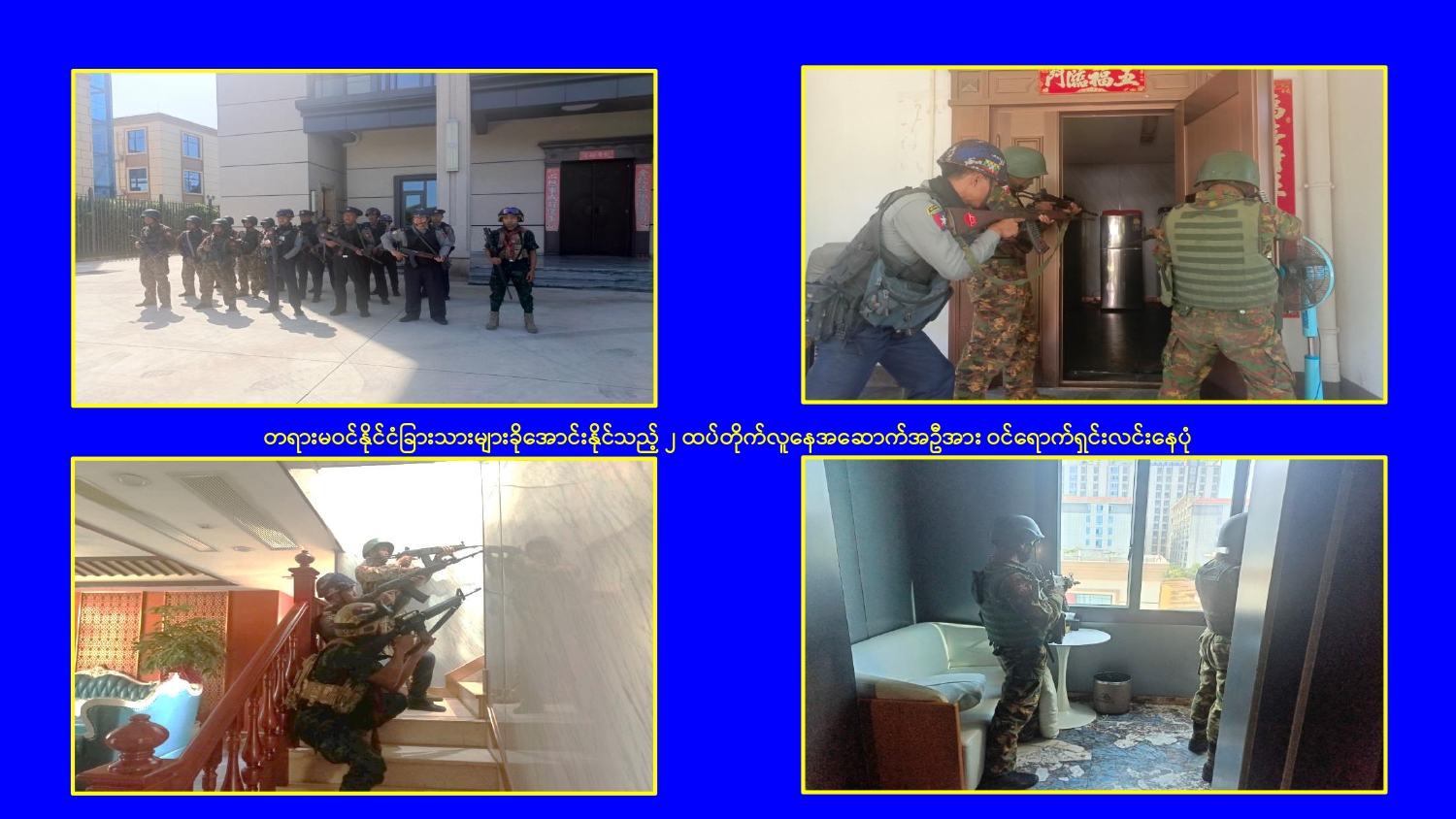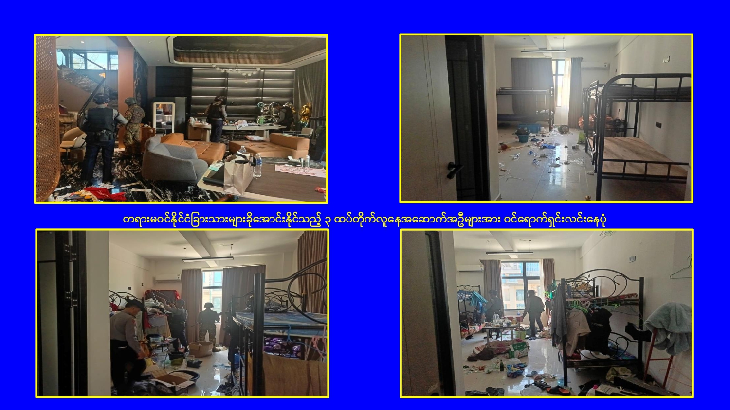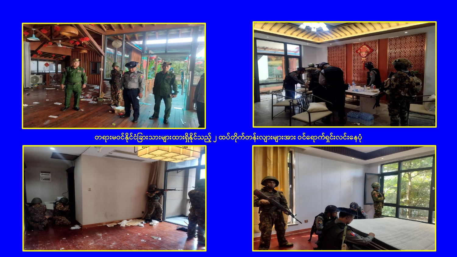 မြန်မာနိုင်ငံအစိုးရအနေဖြင့် မြဝတီမြို့နယ်ရှိ ရွှေကုက္ကိုလ်နယ်မြေနှင့် KK Park နယ်မြေများ၌ ကမ္ဘာတစ်ဝန်းလုံးမှ ကန့်ကွက်ရှုတ်ချလျက်ရှိသော online လိမ်လည်မှုများ နှင့် online လောင်းကစားမှုများ ကျူးလွန်လုပ်ဆောင်ခဲ့ကြသည့် နေရာများတွင် လုံခြုံရေးတပ်ဖွဲ့ဝင်များ၊ အုပ်ချုပ်ရေးအဖွဲ့အစည်းများနှင့် ဒေသတွင်း တာဝန်ရှိသူများ ပါဝင်သည့် ပူးပေါင်းစစ်ဆင်ရေးအဖွဲ့များဖြင့် ဝင်ရောက်ရှင်းလင်းခြင်း၊ တရားမဝင် အဆောက်အအုံများနှင့် online လိမ်လည်မှုများတွင် အသုံးပြုခဲ့သည့် အသုံးအဆောင် ပစ္စည်းများအား စနစ်တကျ ဖြိုချဖျက်ဆီးခြင်း၊ တရားမဝင် ပြည်ပနိုင်ငံသားများအား ဖော်ထုတ်ဖမ်းဆီးအရေးယူ ဆောင်ရွက်ခြင်း၊ သက်ဆိုင်ရာနိုင်ငံများသို့ ပြည်နှင် လွှဲပြောင်းပေးခြင်းများ ဆက်လက် ဆောင်ရွက်လျက်ရှိသည်။