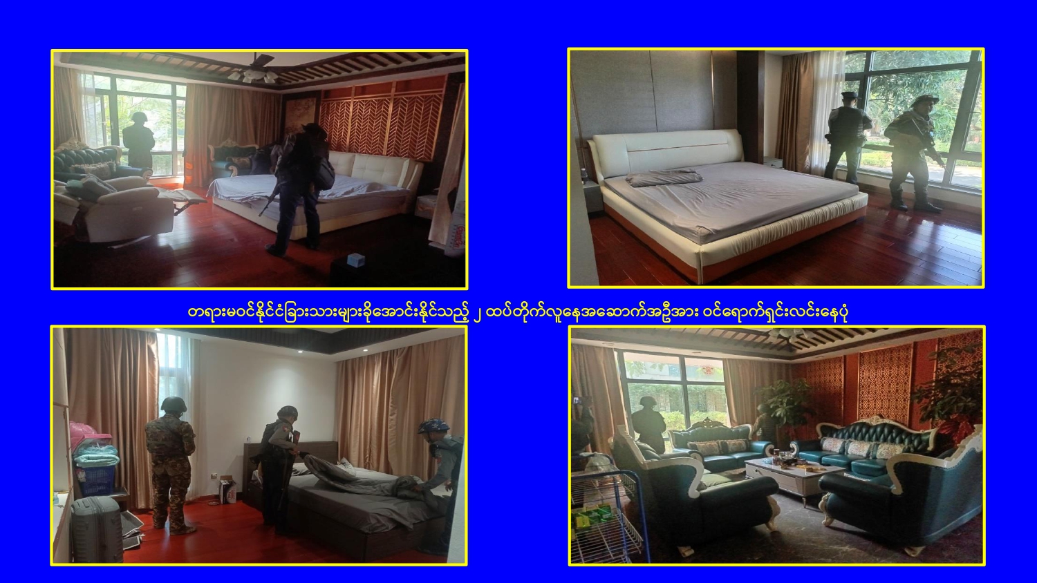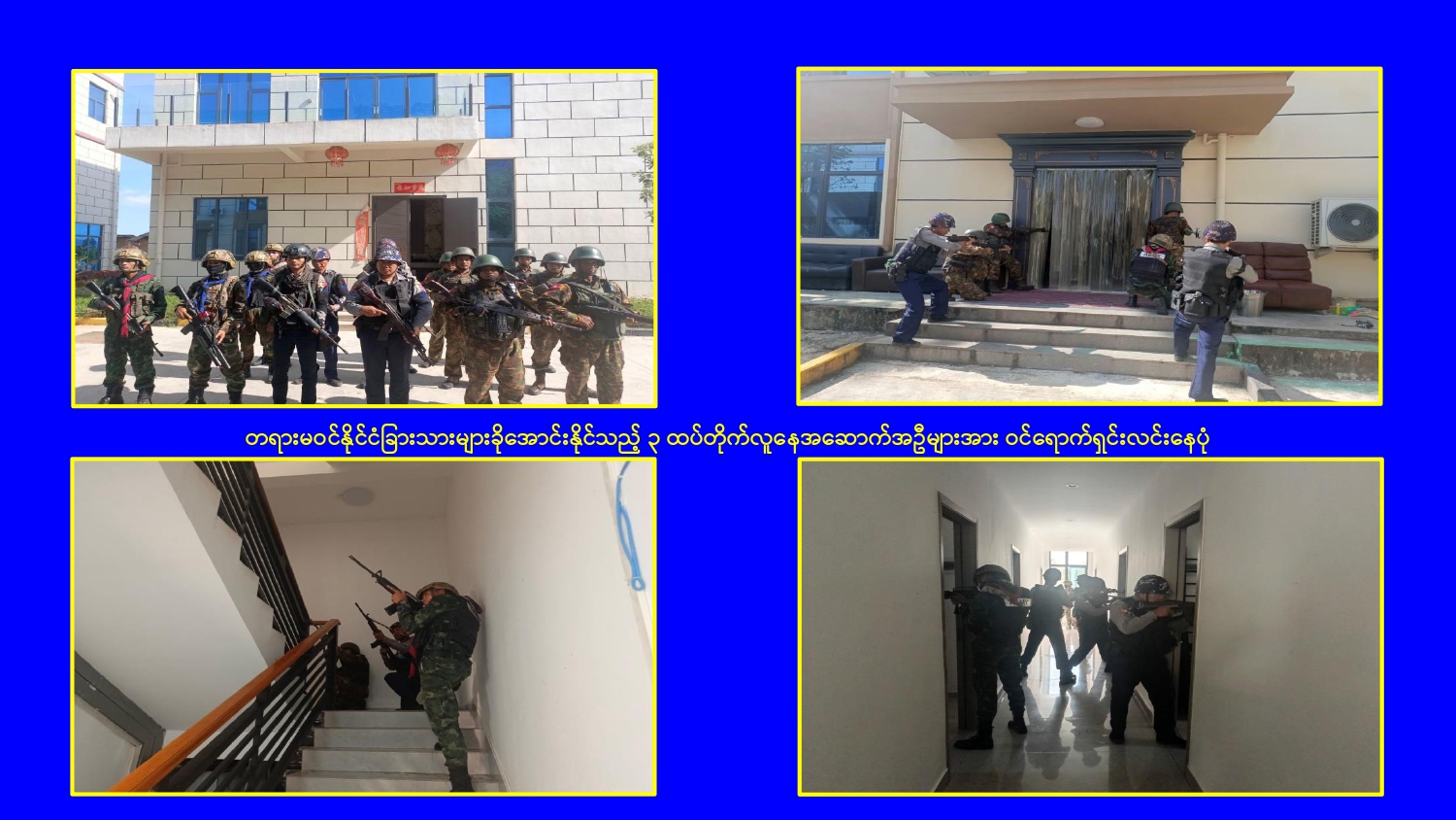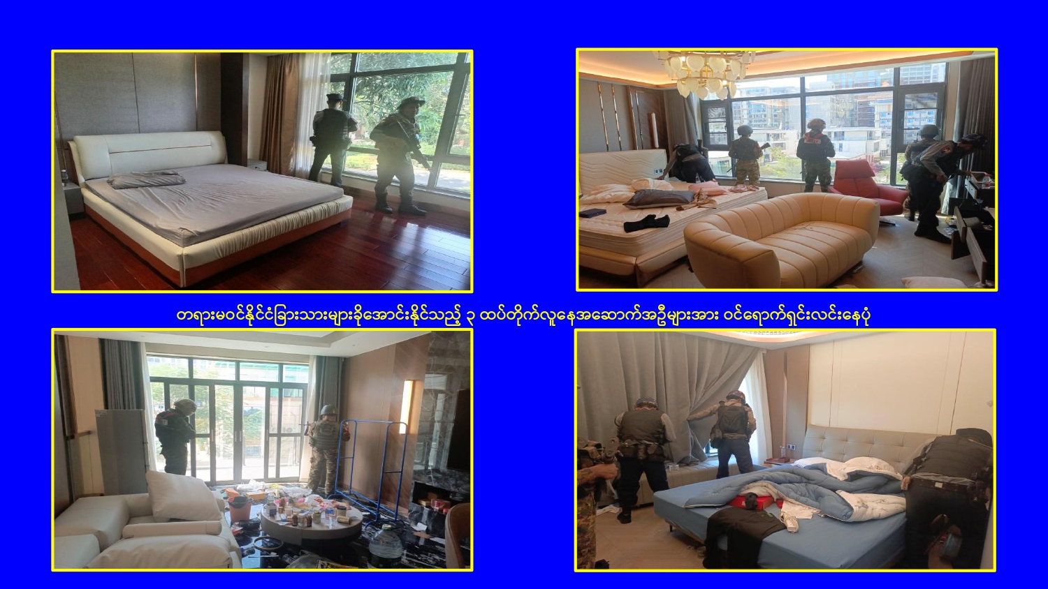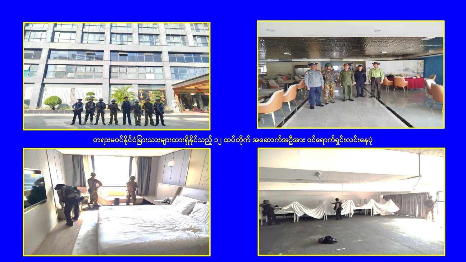 မြန်မာနိုင်ငံအစိုးရအနေဖြင့် မြဝတီမြို့နယ်ရှိ ရွှေကုက္ကိုလ်နယ်မြေနှင့် KK Park နယ်မြေများ၌ ကမ္ဘာတစ်ဝန်းလုံးမှ ကန့်ကွက်ရှုတ်ချလျက်ရှိသော online လိမ်လည်မှုများ နှင့် online လောင်းကစားမှုများ ကျူးလွန်လုပ်ဆောင်ခဲ့ကြသည့် နေရာများတွင် လုံခြုံရေးတပ်ဖွဲ့ဝင်များ၊ အုပ်ချုပ်ရေးအဖွဲ့အစည်းများနှင့် ဒေသတွင်း တာဝန်ရှိသူများ ပါဝင်သည့် ပူးပေါင်းစစ်ဆင်ရေးအဖွဲ့များဖြင့် ဝင်ရောက်ရှင်းလင်းခြင်း၊ တရားမဝင် အဆောက်အအုံများနှင့် online လိမ်လည်မှုများတွင် အသုံးပြုခဲ့သည့် အသုံးအဆောင် ပစ္စည်းများအား စနစ်တကျ ဖြိုချဖျက်ဆီးခြင်း၊ တရားမဝင် ပြည်ပနိုင်ငံသားများအား ဖော်ထုတ်ဖမ်းဆီးအရေးယူ ဆောင်ရွက်ခြင်း၊ သက်ဆိုင်ရာနိုင်ငံများသို့ ပြည်နှင် လွှဲပြောင်းပေးခြင်းများ ဆက်လက် ဆောင်ရွက်လျက်ရှိသည်။