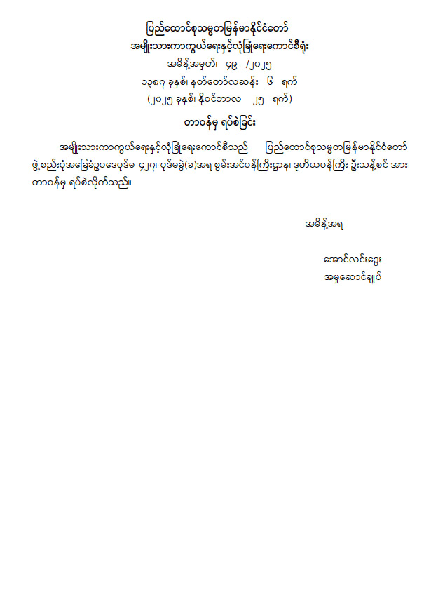 ပြည်ထောင်စုသမ္မတမြန်မာနိုင်ငံတော် အမျိုးသားကာကွယ်ရေးနှင့်လုံခြုံရေးကောင်စီရုံး အမိန့်အမှတ်၊ ၄၉ /၂၀၂၅ ၁၃၈၇ ခုနှစ်၊ နတ်တော်လဆန်း ၆ ရက် (၂၀၂၅ ခုနှစ်၊ နိုဝင်ဘာလ ၂၅ ရက်) တာဝန်မှ ရပ်စဲခြင်း