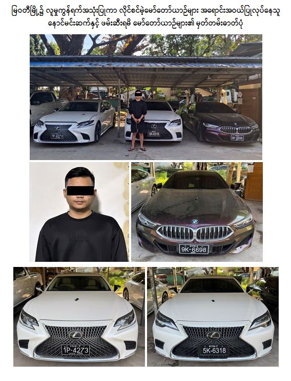 ထို့သို့စိစစ်ဖော်ထုတ်ဖမ်းဆီးခြင်းများ ဆောင်ရွက်ခဲ့ရာ TikTok လူမှုကွန်ရက်စာမျက်နှာ၌ @naungminsatt အကောင့်ဖြင့် လိုင်စင်မဲ့မော်တော်ယာဉ်များပြသကာ အရောင်းအဝယ်ပြုလုပ် နေသည်ကို တွေ့ရှိရသဖြင့် အဆိုပါအကောင့်ပိုင်ရှင်အား စိစစ်ခဲ့ရာ @naungminsatt အကောင့် ပိုင်ရှင်မှာ ရန်ကုန်တိုင်းဒေသကြီး၊ ရွှေပြည်သာမြို့နယ်နေ နောင်မင်းဆက် (၂၆)နှစ်ဖြစ်ကြောင်း သိရှိရပြီး ၎င်းမှာ ကရင်ပြည်နယ်၊ မြဝတီမြို့၊ အမှတ်(၄)ရပ်ကွက်၊ သစ်တပင်လမ်း၊ အမှတ် (၄/၀၀၃၈)၌ နေထိုင်ကာ ခြံဝင်းအတွင်း၌ လိုင်စင်မဲ့မော်တော်ယာဉ်များ ထားရှိ၍ အရောင်းအဝယ် ပြုလုပ်နေကြောင်း ဖော်ထုတ်သိရှိရသဖြင့် လုံခြုံရေးတပ်ဖွဲ့ဝင်များပါဝင်သော ပူးပေါင်းအဖွဲ့သည် နိုဝင်ဘာလ ၂၅ ရက်နေ့ ည ၁၂ နာရီ ၁၀ မိနစ်အချိန်တွင် ဝင်ရောက်ရှာဖွေခဲ့ရာ နောင်မင်းဆက်အား အဆိုပါခြံဝင်းအတွင်းမှ YGN-7 1P-4273 TOYOTA LEXUS၊ KYN-4 9K-6698 BMW၊ KYN-7 5K-6318 TOYOTA LEXUS အမျိုးအစား လိုင်စင်မဲ့မော်တော်ယာဉ် ၃ စီး၊ စိစစ်ဆဲ မော်တော်ယာဉ် ၁ စီး၊ ပေါင်း ၄ စီးတို့နှင့်အတူ ဖမ်းဆီးရမိခဲ့သည်။
