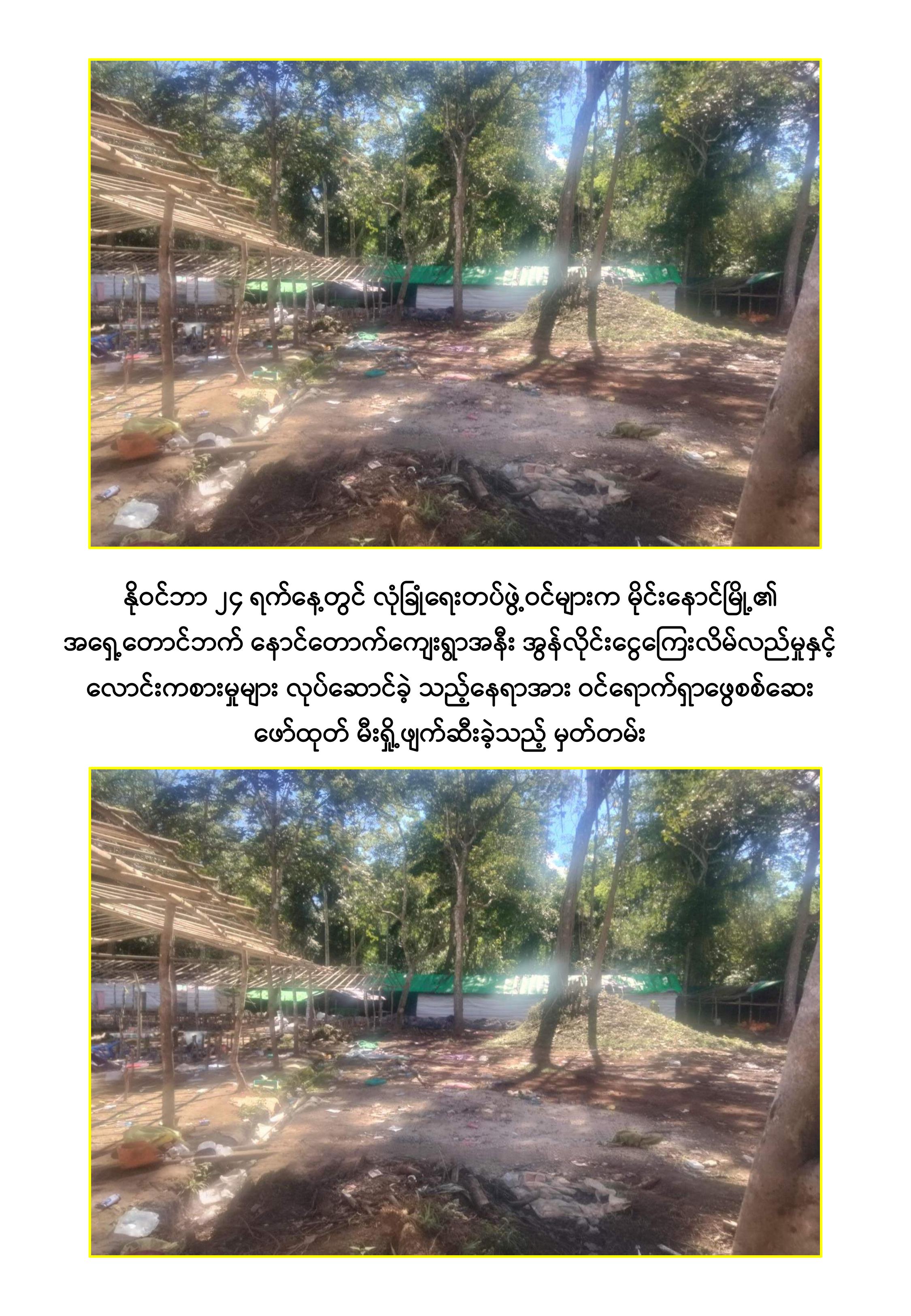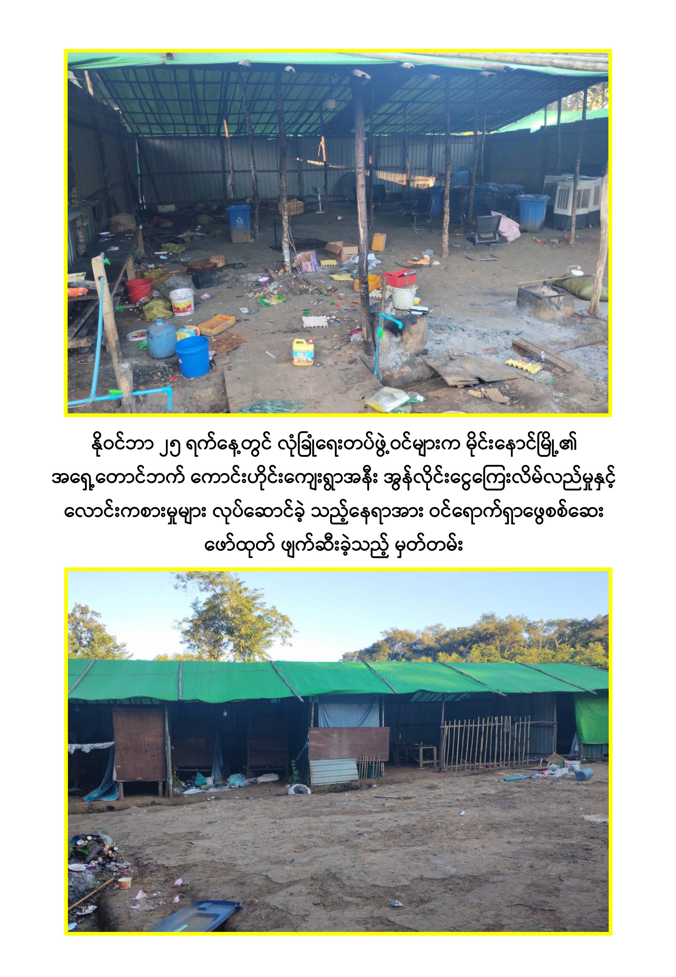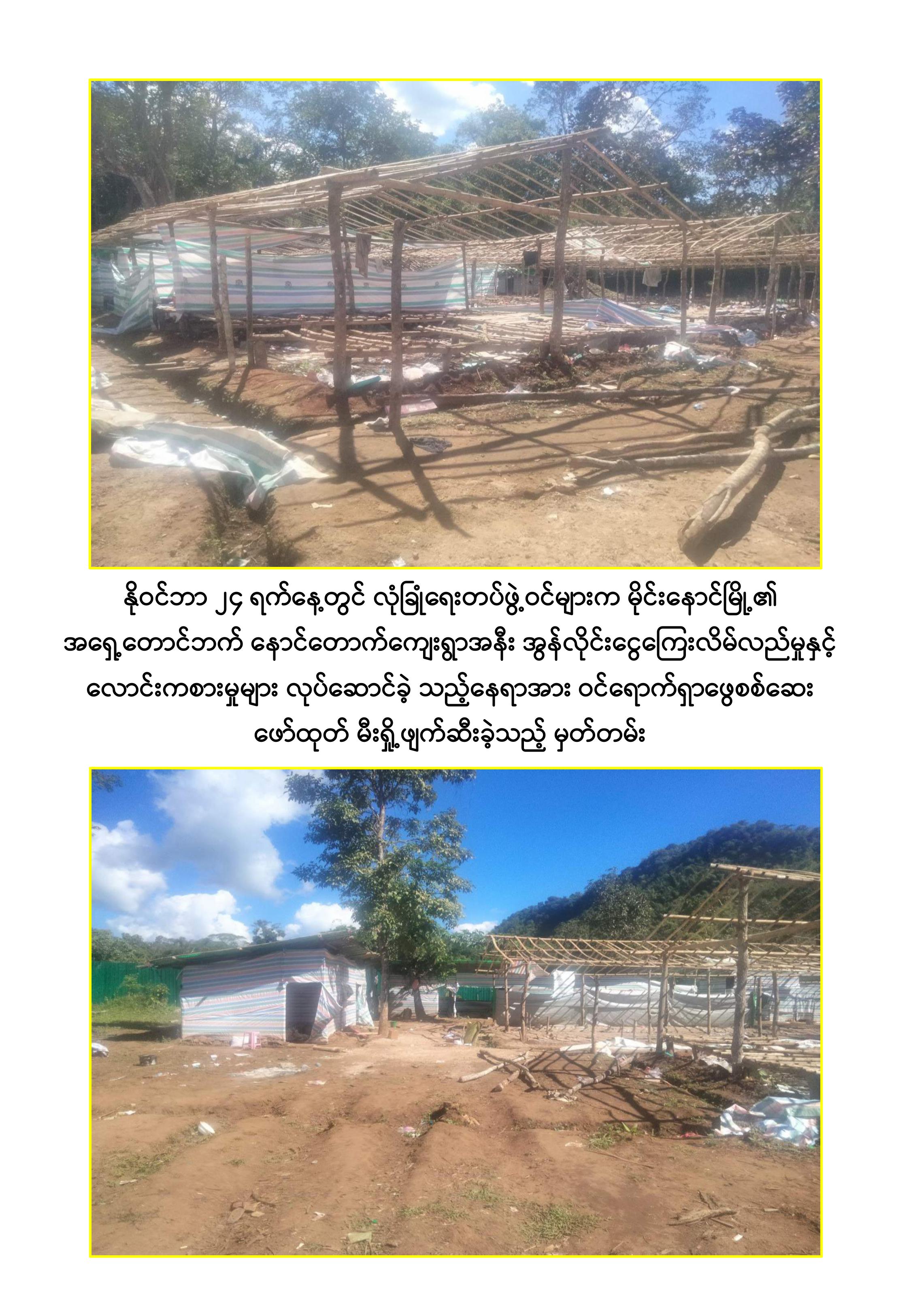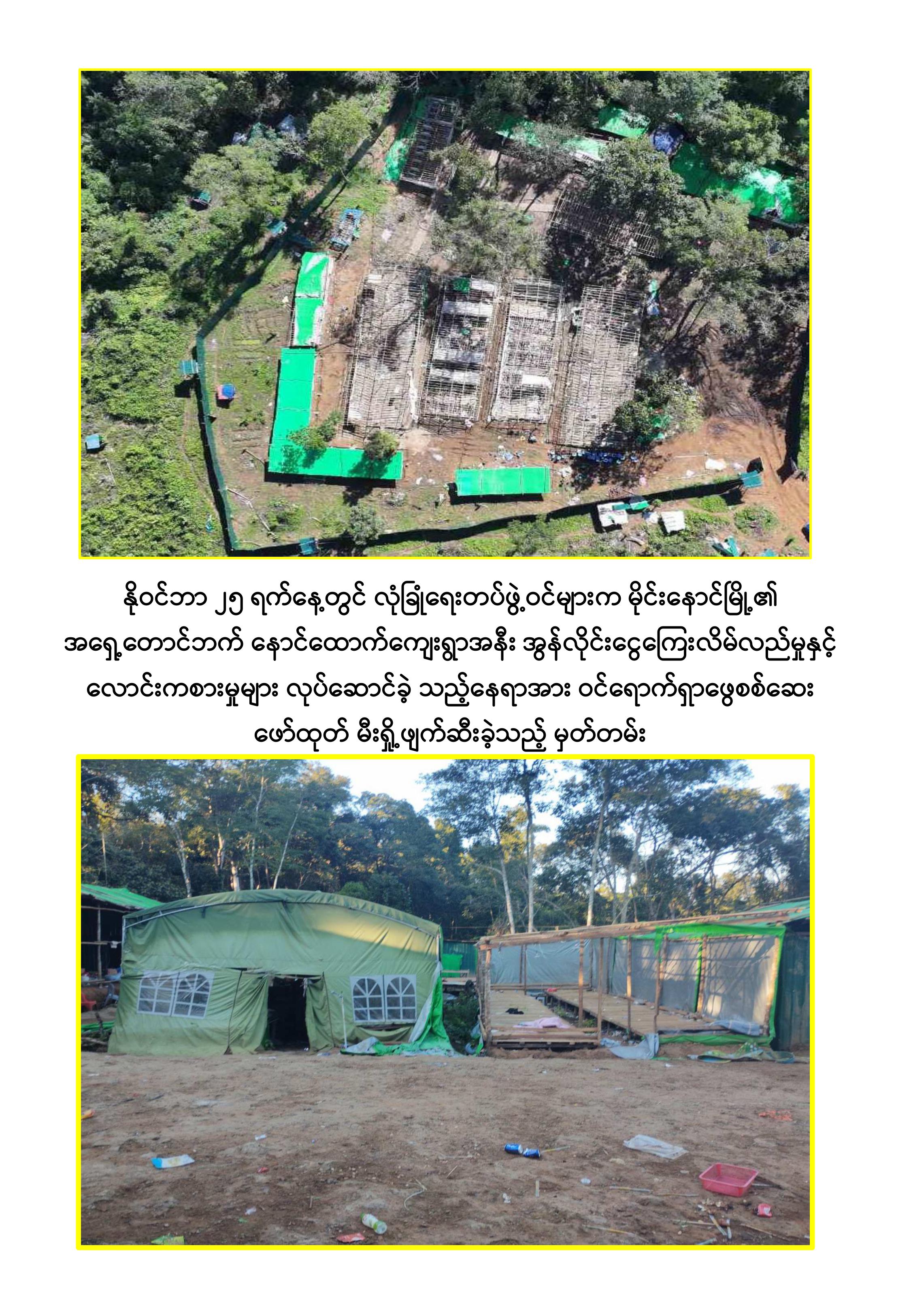 ဆက်လက်၍ လုံခြုံရေးတပ်ဖွဲ့ဝင်များသည် နယ်မြေလုံခြုံရေးလုပ်ငန်းများဆောင်ရွက် ခဲ့ရာ နိုဝင်ဘာ ၂၆ ရက်တွင် မိုင်းနောင်မြို့၏ အရှေ့တောင်ဘက် ဝမ်ကျောင်းကျေးရွာအနီး၌ အွန်လိုင်းလိမ်လည်မှုနှင့် လောင်းကစားလုပ်ငန်းဆောင်ရွက်ရန် ဆောက်လုပ်လျက်ရှိသည့် အလျား ၁၅၀ ပေ၊ အနံ ၁၅ ပေ၊ အမြင့် ၁၅ ပေရှိ သွပ်မိုးတဲ(လူမနေ) ၁ လုံး၊ အလျား ၁၂၀၊ အနံ ၃၀ ပေ၊ အမြင့် ၁၅ ပေရှိ သွပ်မိုးအလုပ်ရုံ ၁ လုံး၊ အလျား ၁၅၀ ပေ၊ အနံ ၆ ပေ၊ အမြင့် ၈ ပေရှိ သွပ်မိုးအထပ်သားကာ ၁ လုံး၊ အလျား ၁၅ ပေ၊ အနံ ၆ ပေ၊ အမြင့် ၈ ပေရှိ သွပ်မိုးအထပ်သားကာ ၁ လုံး၊ အလျား ၁၅၀ ပေ၊ အနံ ၁၅ ပေ၊ အမြင့် ၁၅ ပေရှိ သွပ်မိုးတဲ(လူမနေ) ၁ လုံး၊ အလျား ၈၀ ပေ၊ အနံ ၁၅ ပေ၊ အမြင့် ၁၅ ပေရှိ အမိုးအကာမရှိတဲ ၁ လုံး၊ အလျား ၁၀၀ ပေ၊ အနံ ၂၅ ပေ၊ အမြင့် ၁၅ ပေရှိ သွပ်မိုးအထပ်သားကာတဲ ၁ လုံး၊ အလျား ၁၀၀ ပေ၊ အနံ ၂၅ ပေ၊ အမြင့် ၁၅ ပေရှိ အမိုးအကာမရှိပြိုကျတဲ ၁ လုံး၊ အလျား ၁၀၀ ပေ၊ အနံ ၂၅ ပေ၊ အမြင့် ၁၅ ပေရှိ မိုးကာမိုးတဲ ၁ လုံး၊ အလျား ၁၀၀ ပေ၊ အနံ ၂၅ ပေ၊ အမြင့် ၁၅ ပေရှိ မိုးကာမိုးပြိုကျတဲ ၁ လုံး၊ အလျား ၂၀ ပေ၊ အနံ ၁၂၀ ပေ၊ အမြင့် ၁၅ ပေရှိ မိုးကာမိုးအထပ်သားဂိုထောင် ၁ လုံး၊ အလျား ၂၀ ပေ ပတ်လည်သွပ်မိုးအထပ်သားကာ လူနေအိမ် ၁ လုံး၊ အလျား ၁၅၀ ပေ၊ အနံ ၁၅ ပေ၊ အမြင့် ၁၅ ပေရှိ အမိုးမရှိတဲ ၂ လုံး၊ ဂါလံ ၈၀၀ ဆံ့ တိုင်ကီအပြာ ၄ လုံးတို့ကို လည်းကောင်း၊ မိုင်းနောင်မြို့ ၏ အရှေ့တောင်ဘက် နောင်တောက်ကျေးရွာ၏ တောင်ဘက်နေရာတစ်ဝိုက်အား ထပ်မံ၍ရှင်းလင်းရာ အွန်လိုင်း လိမ်လည် လောင်းကစားမှုများ လုပ်ကိုင်နေသူများဖြစ်သည့် တရုတ်နိုင်ငံသား ၂၆ ဦးနှင့် မြန်မာနိုင်ငံသား ၈ ဦး တို့ကို လည်းကောင်း ဖမ်းဆီးရမိခဲ့ပြီး ၎င်းတို့၏ ဖော်ထုတ်ချက်များအရ အဆိုပါကျေးရွာအနီး၌ သိုဝှက်သိမ်းဆည်းထားသည့် MA-1 သေနတ် ၁ လက်၊ MA-13 သေနတ် ၁ လက်၊ AK-12 သေနတ် ၁ လက်၊ ကာဘိုင်သေနတ် ၁ လက်၊ wichester 12 v သေနတ် ၁ လက်၊ ၉ မမကျည် ၁၀ တောင့်၊ 12 v ကျည် ၂ တောင့်၊ ၉ မမကျည်အိမ် ၁ ခု၊ AK ကျည်အိမ် ၁ ခု နှင့် ကာဘိုင် ကျည်အိမ် ၁ ခု တို့ကို သိမ်းဆည်းရမိခဲ့ကြောင်း သိရှိရသည်။
