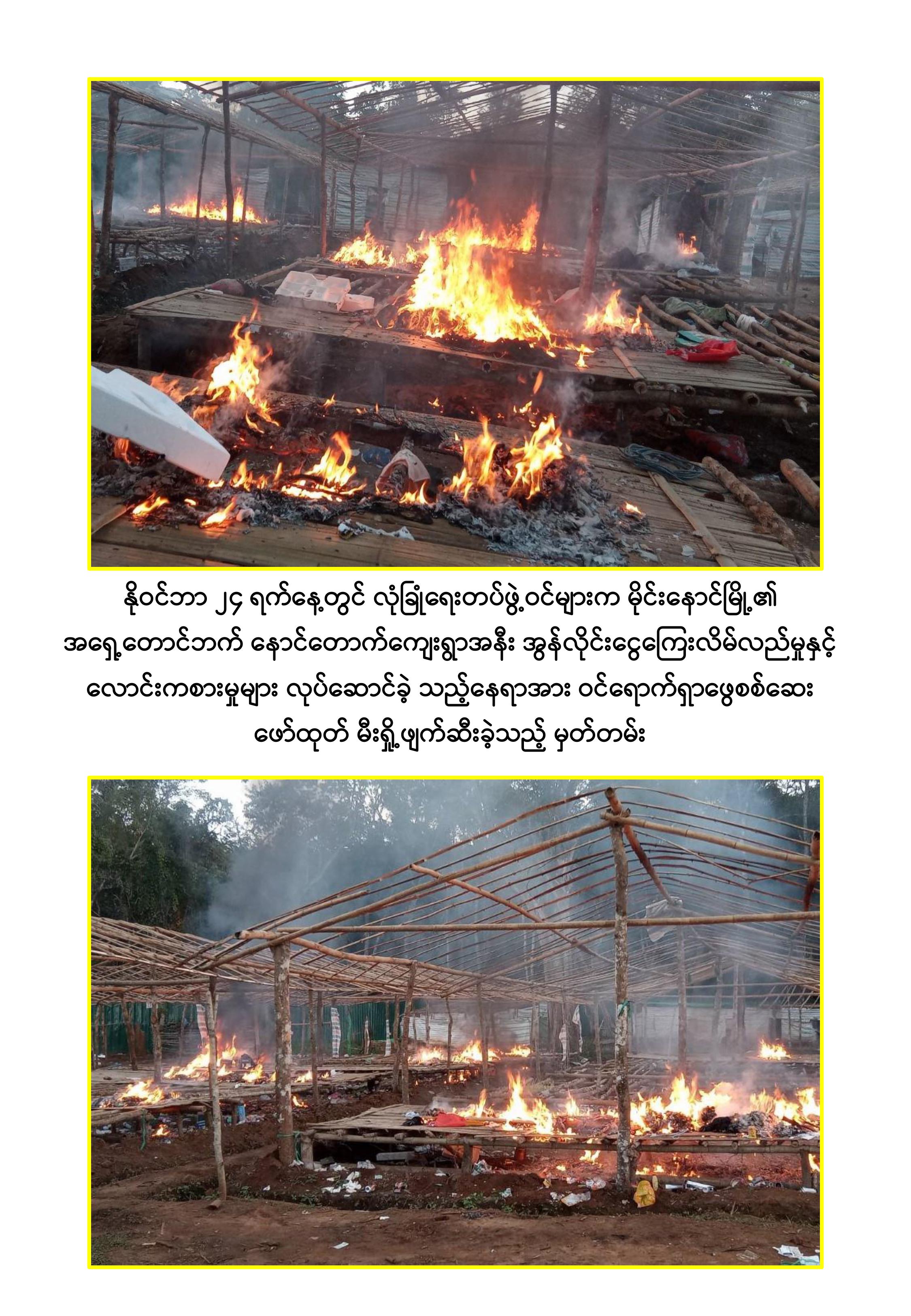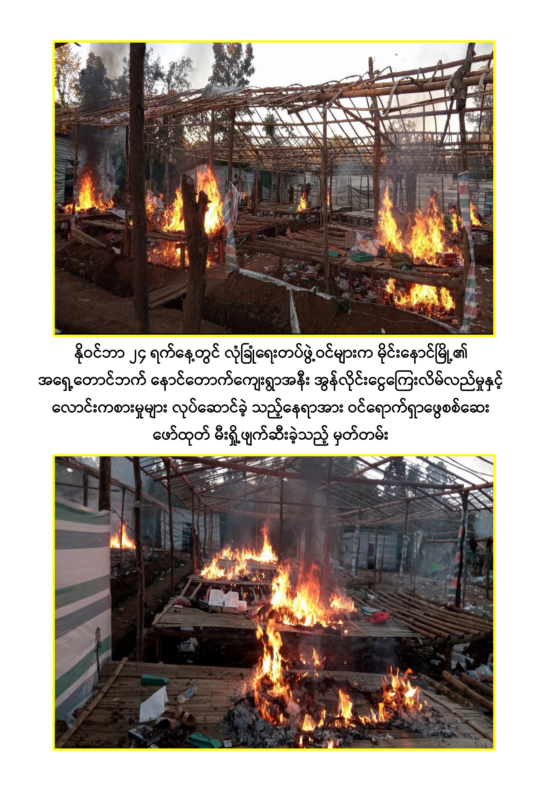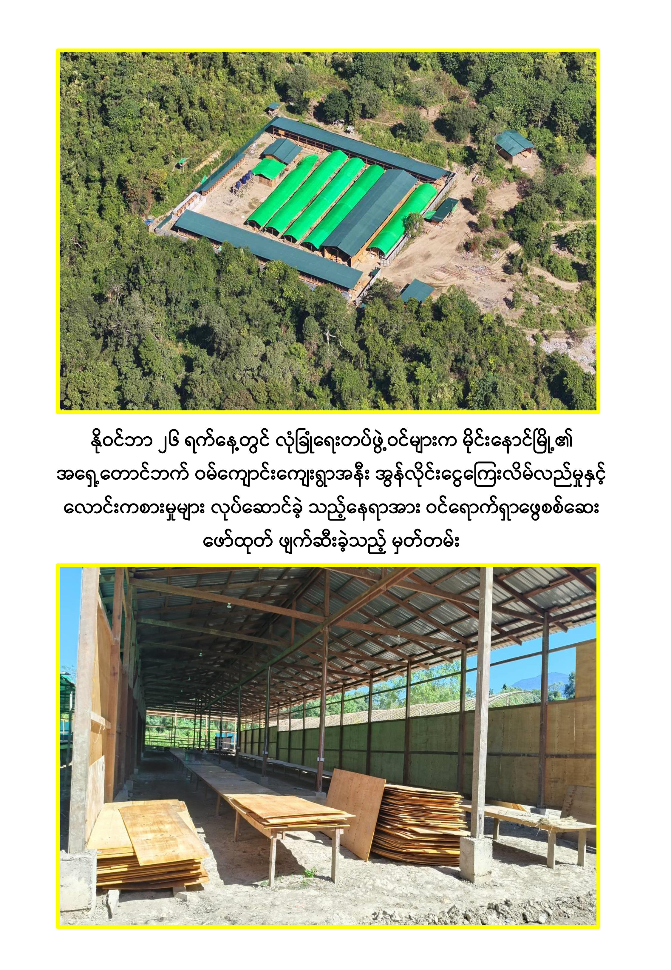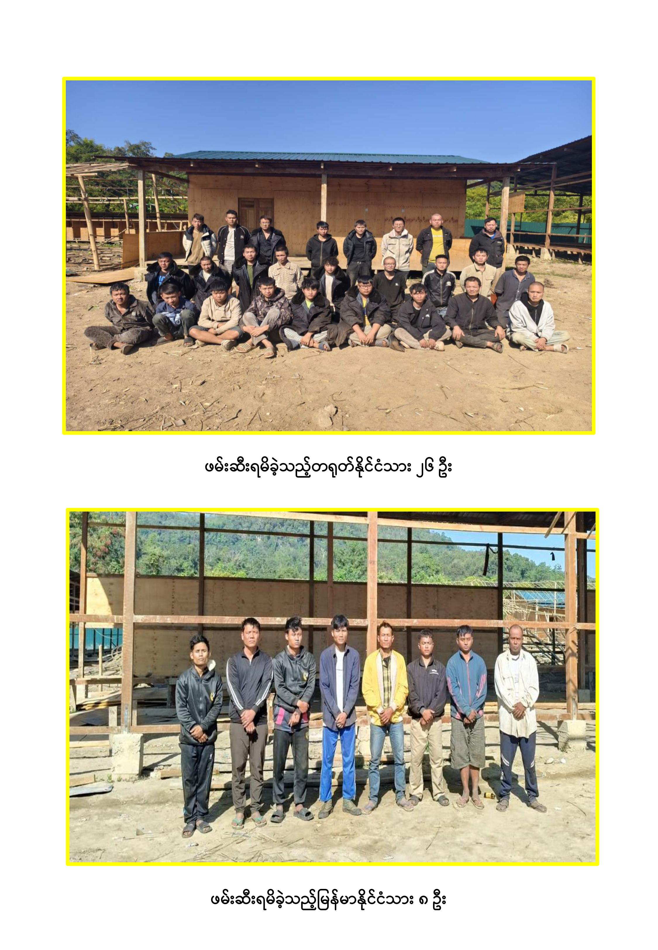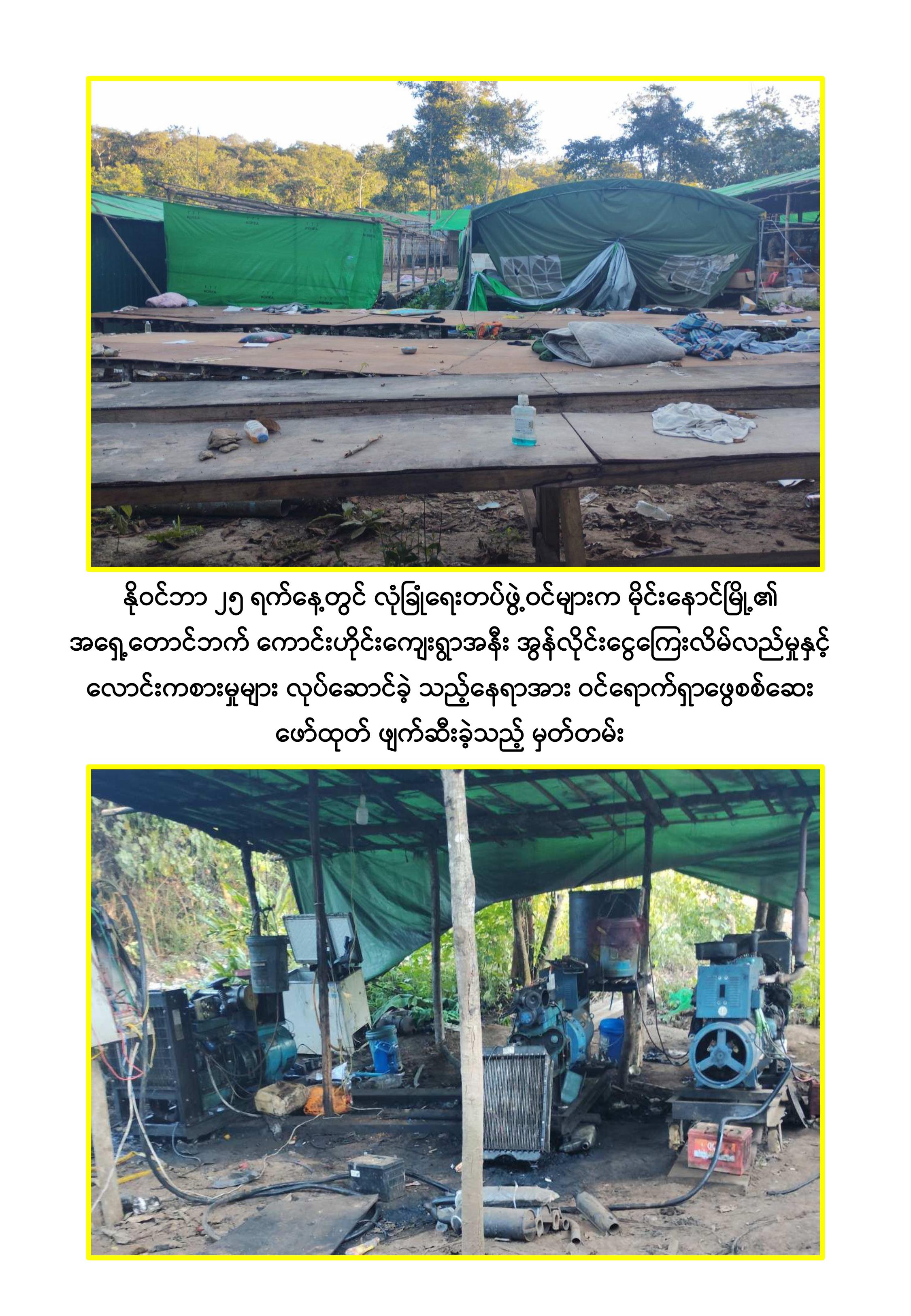 ဆက်လက်၍ လုံခြုံရေးတပ်ဖွဲ့ဝင်များသည် နယ်မြေလုံခြုံရေးလုပ်ငန်းများဆောင်ရွက် ခဲ့ရာ နိုဝင်ဘာ ၂၆ ရက်တွင် မိုင်းနောင်မြို့၏ အရှေ့တောင်ဘက် ဝမ်ကျောင်းကျေးရွာအနီး၌ အွန်လိုင်းလိမ်လည်မှုနှင့် လောင်းကစားလုပ်ငန်းဆောင်ရွက်ရန် ဆောက်လုပ်လျက်ရှိသည့် အလျား ၁၅၀ ပေ၊ အနံ ၁၅ ပေ၊ အမြင့် ၁၅ ပေရှိ သွပ်မိုးတဲ(လူမနေ) ၁ လုံး၊ အလျား ၁၂၀၊ အနံ ၃၀ ပေ၊ အမြင့် ၁၅ ပေရှိ သွပ်မိုးအလုပ်ရုံ ၁ လုံး၊ အလျား ၁၅၀ ပေ၊ အနံ ၆ ပေ၊ အမြင့် ၈ ပေရှိ သွပ်မိုးအထပ်သားကာ ၁ လုံး၊ အလျား ၁၅ ပေ၊ အနံ ၆ ပေ၊ အမြင့် ၈ ပေရှိ သွပ်မိုးအထပ်သားကာ ၁ လုံး၊ အလျား ၁၅၀ ပေ၊ အနံ ၁၅ ပေ၊ အမြင့် ၁၅ ပေရှိ သွပ်မိုးတဲ(လူမနေ) ၁ လုံး၊ အလျား ၈၀ ပေ၊ အနံ ၁၅ ပေ၊ အမြင့် ၁၅ ပေရှိ အမိုးအကာမရှိတဲ ၁ လုံး၊ အလျား ၁၀၀ ပေ၊ အနံ ၂၅ ပေ၊ အမြင့် ၁၅ ပေရှိ သွပ်မိုးအထပ်သားကာတဲ ၁ လုံး၊ အလျား ၁၀၀ ပေ၊ အနံ ၂၅ ပေ၊ အမြင့် ၁၅ ပေရှိ အမိုးအကာမရှိပြိုကျတဲ ၁ လုံး၊ အလျား ၁၀၀ ပေ၊ အနံ ၂၅ ပေ၊ အမြင့် ၁၅ ပေရှိ မိုးကာမိုးတဲ ၁ လုံး၊ အလျား ၁၀၀ ပေ၊ အနံ ၂၅ ပေ၊ အမြင့် ၁၅ ပေရှိ မိုးကာမိုးပြိုကျတဲ ၁ လုံး၊ အလျား ၂၀ ပေ၊ အနံ ၁၂၀ ပေ၊ အမြင့် ၁၅ ပေရှိ မိုးကာမိုးအထပ်သားဂိုထောင် ၁ လုံး၊ အလျား ၂၀ ပေ ပတ်လည်သွပ်မိုးအထပ်သားကာ လူနေအိမ် ၁ လုံး၊ အလျား ၁၅၀ ပေ၊ အနံ ၁၅ ပေ၊ အမြင့် ၁၅ ပေရှိ အမိုးမရှိတဲ ၂ လုံး၊ ဂါလံ ၈၀၀ ဆံ့ တိုင်ကီအပြာ ၄ လုံးတို့ကို လည်းကောင်း၊ မိုင်းနောင်မြို့ ၏ အရှေ့တောင်ဘက် နောင်တောက်ကျေးရွာ၏ တောင်ဘက်နေရာတစ်ဝိုက်အား ထပ်မံ၍ရှင်းလင်းရာ အွန်လိုင်း လိမ်လည် လောင်းကစားမှုများ လုပ်ကိုင်နေသူများဖြစ်သည့် တရုတ်နိုင်ငံသား ၂၆ ဦးနှင့် မြန်မာနိုင်ငံသား ၈ ဦး တို့ကို လည်းကောင်း ဖမ်းဆီးရမိခဲ့ပြီး ၎င်းတို့၏ ဖော်ထုတ်ချက်များအရ အဆိုပါကျေးရွာအနီး၌ သိုဝှက်သိမ်းဆည်းထားသည့် MA-1 သေနတ် ၁ လက်၊ MA-13 သေနတ် ၁ လက်၊ AK-12 သေနတ် ၁ လက်၊ ကာဘိုင်သေနတ် ၁ လက်၊ wichester 12 v သေနတ် ၁ လက်၊ ၉ မမကျည် ၁၀ တောင့်၊ 12 v ကျည် ၂ တောင့်၊ ၉ မမကျည်အိမ် ၁ ခု၊ AK ကျည်အိမ် ၁ ခု နှင့် ကာဘိုင် ကျည်အိမ် ၁ ခု တို့ကို သိမ်းဆည်းရမိခဲ့ကြောင်း သိရှိရသည်။