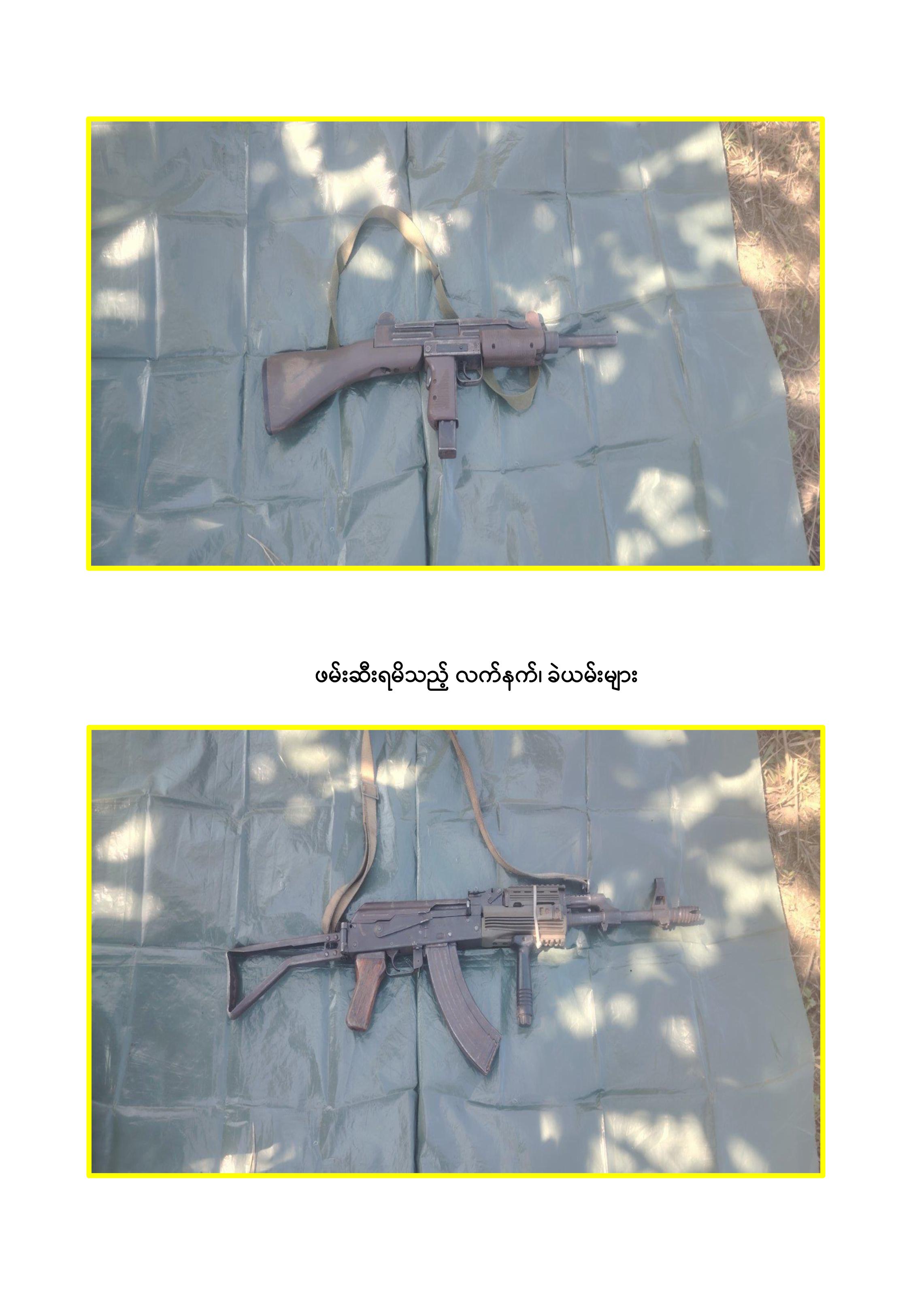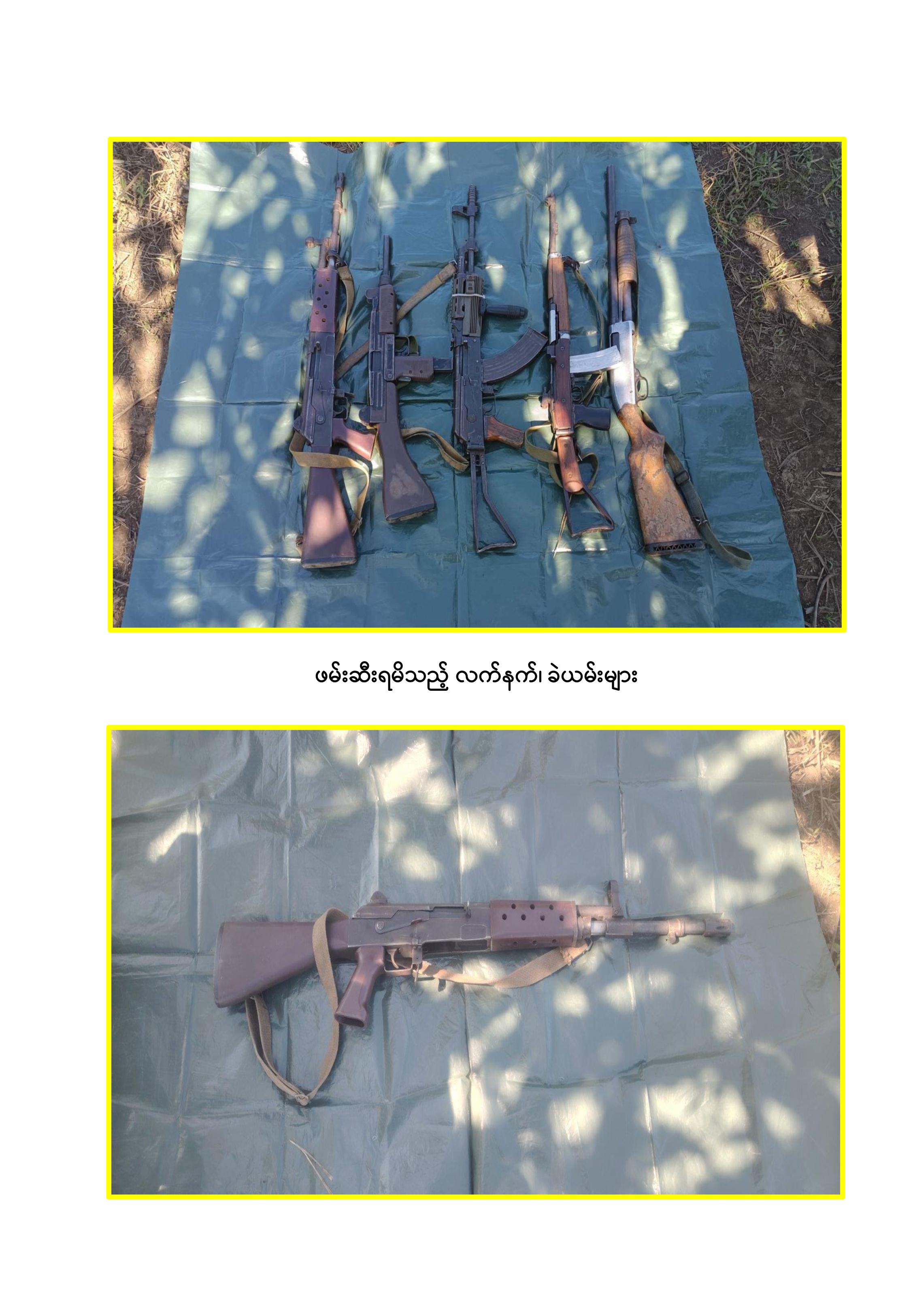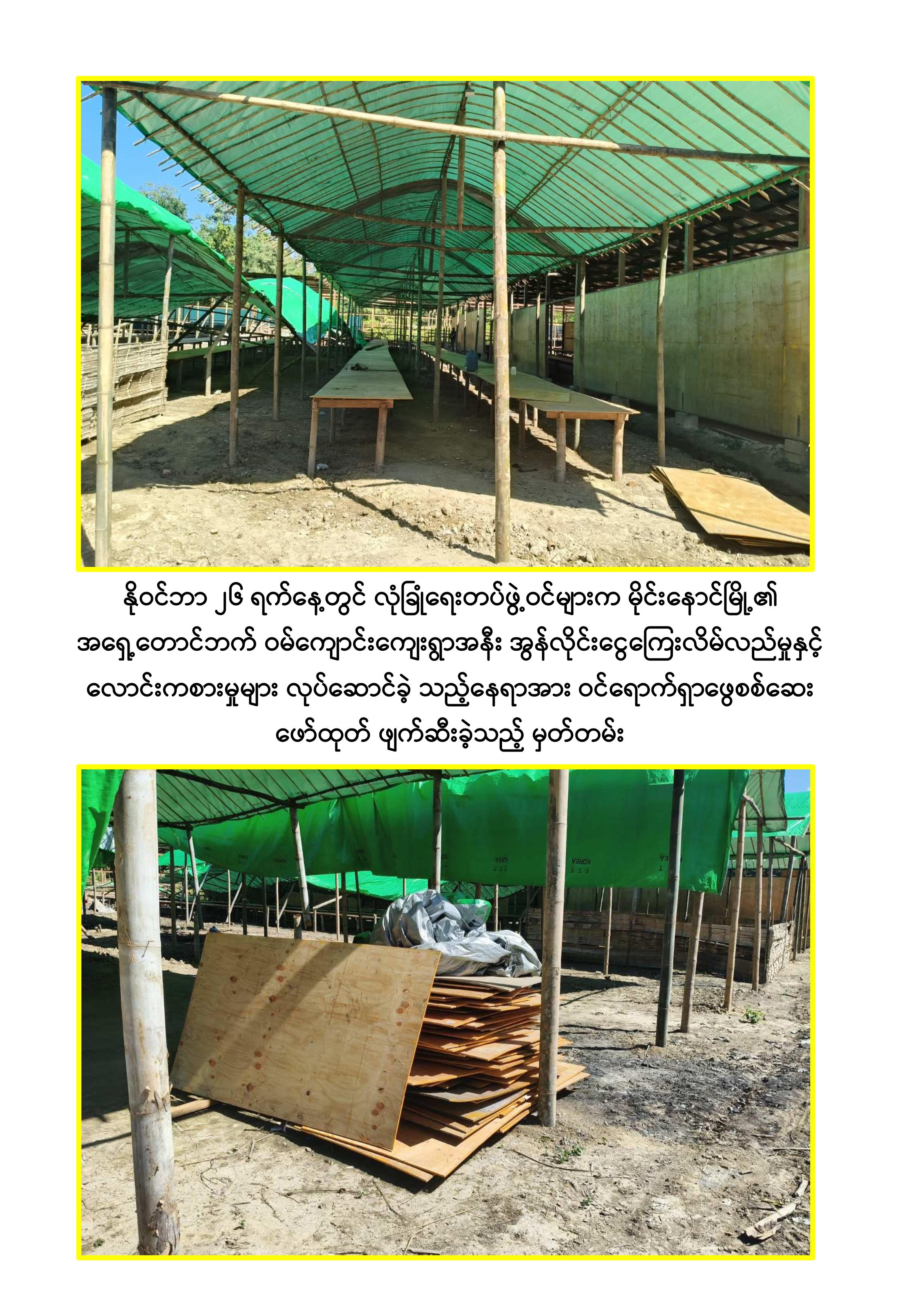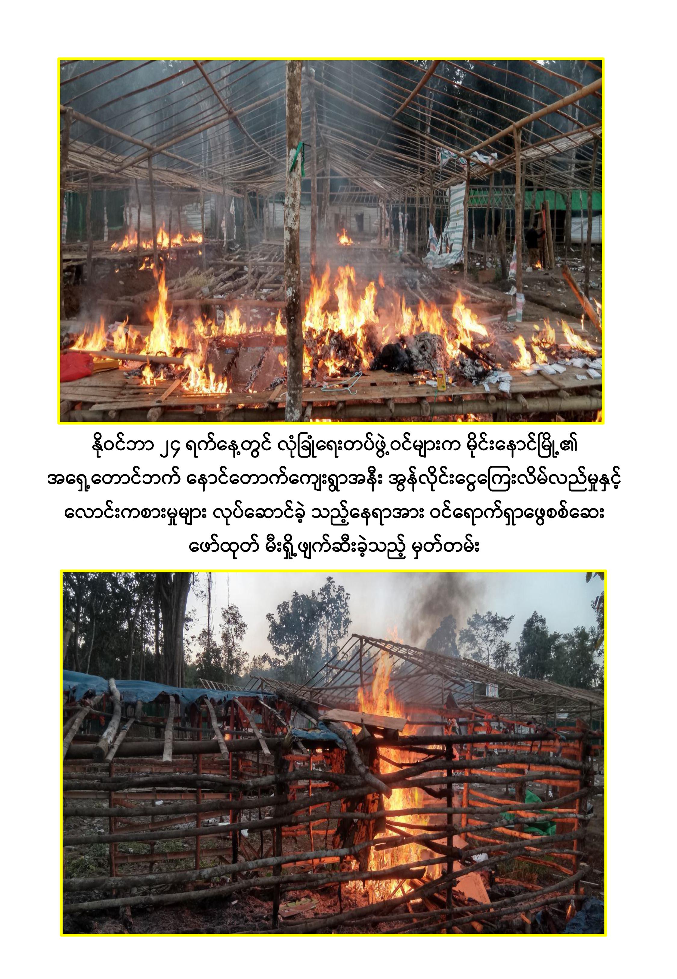 ဆက်လက်၍ လုံခြုံရေးတပ်ဖွဲ့ဝင်များသည် နယ်မြေလုံခြုံရေးလုပ်ငန်းများဆောင်ရွက် ခဲ့ရာ နိုဝင်ဘာ ၂၆ ရက်တွင် မိုင်းနောင်မြို့၏ အရှေ့တောင်ဘက် ဝမ်ကျောင်းကျေးရွာအနီး၌ အွန်လိုင်းလိမ်လည်မှုနှင့် လောင်းကစားလုပ်ငန်းဆောင်ရွက်ရန် ဆောက်လုပ်လျက်ရှိသည့် အလျား ၁၅၀ ပေ၊ အနံ ၁၅ ပေ၊ အမြင့် ၁၅ ပေရှိ သွပ်မိုးတဲ(လူမနေ) ၁ လုံး၊ အလျား ၁၂၀၊ အနံ ၃၀ ပေ၊ အမြင့် ၁၅ ပေရှိ သွပ်မိုးအလုပ်ရုံ ၁ လုံး၊ အလျား ၁၅၀ ပေ၊ အနံ ၆ ပေ၊ အမြင့် ၈ ပေရှိ သွပ်မိုးအထပ်သားကာ ၁ လုံး၊ အလျား ၁၅ ပေ၊ အနံ ၆ ပေ၊ အမြင့် ၈ ပေရှိ သွပ်မိုးအထပ်သားကာ ၁ လုံး၊ အလျား ၁၅၀ ပေ၊ အနံ ၁၅ ပေ၊ အမြင့် ၁၅ ပေရှိ သွပ်မိုးတဲ(လူမနေ) ၁ လုံး၊ အလျား ၈၀ ပေ၊ အနံ ၁၅ ပေ၊ အမြင့် ၁၅ ပေရှိ အမိုးအကာမရှိတဲ ၁ လုံး၊ အလျား ၁၀၀ ပေ၊ အနံ ၂၅ ပေ၊ အမြင့် ၁၅ ပေရှိ သွပ်မိုးအထပ်သားကာတဲ ၁ လုံး၊ အလျား ၁၀၀ ပေ၊ အနံ ၂၅ ပေ၊ အမြင့် ၁၅ ပေရှိ အမိုးအကာမရှိပြိုကျတဲ ၁ လုံး၊ အလျား ၁၀၀ ပေ၊ အနံ ၂၅ ပေ၊ အမြင့် ၁၅ ပေရှိ မိုးကာမိုးတဲ ၁ လုံး၊ အလျား ၁၀၀ ပေ၊ အနံ ၂၅ ပေ၊ အမြင့် ၁၅ ပေရှိ မိုးကာမိုးပြိုကျတဲ ၁ လုံး၊ အလျား ၂၀ ပေ၊ အနံ ၁၂၀ ပေ၊ အမြင့် ၁၅ ပေရှိ မိုးကာမိုးအထပ်သားဂိုထောင် ၁ လုံး၊ အလျား ၂၀ ပေ ပတ်လည်သွပ်မိုးအထပ်သားကာ လူနေအိမ် ၁ လုံး၊ အလျား ၁၅၀ ပေ၊ အနံ ၁၅ ပေ၊ အမြင့် ၁၅ ပေရှိ အမိုးမရှိတဲ ၂ လုံး၊ ဂါလံ ၈၀၀ ဆံ့ တိုင်ကီအပြာ ၄ လုံးတို့ကို လည်းကောင်း၊ မိုင်းနောင်မြို့ ၏ အရှေ့တောင်ဘက် နောင်တောက်ကျေးရွာ၏ တောင်ဘက်နေရာတစ်ဝိုက်အား ထပ်မံ၍ရှင်းလင်းရာ အွန်လိုင်း လိမ်လည် လောင်းကစားမှုများ လုပ်ကိုင်နေသူများဖြစ်သည့် တရုတ်နိုင်ငံသား ၂၆ ဦးနှင့် မြန်မာနိုင်ငံသား ၈ ဦး တို့ကို လည်းကောင်း ဖမ်းဆီးရမိခဲ့ပြီး ၎င်းတို့၏ ဖော်ထုတ်ချက်များအရ အဆိုပါကျေးရွာအနီး၌ သိုဝှက်သိမ်းဆည်းထားသည့် MA-1 သေနတ် ၁ လက်၊ MA-13 သေနတ် ၁ လက်၊ AK-12 သေနတ် ၁ လက်၊ ကာဘိုင်သေနတ် ၁ လက်၊ wichester 12 v သေနတ် ၁ လက်၊ ၉ မမကျည် ၁၀ တောင့်၊ 12 v ကျည် ၂ တောင့်၊ ၉ မမကျည်အိမ် ၁ ခု၊ AK ကျည်အိမ် ၁ ခု နှင့် ကာဘိုင် ကျည်အိမ် ၁ ခု တို့ကို သိမ်းဆည်းရမိခဲ့ကြောင်း သိရှိရသည်။