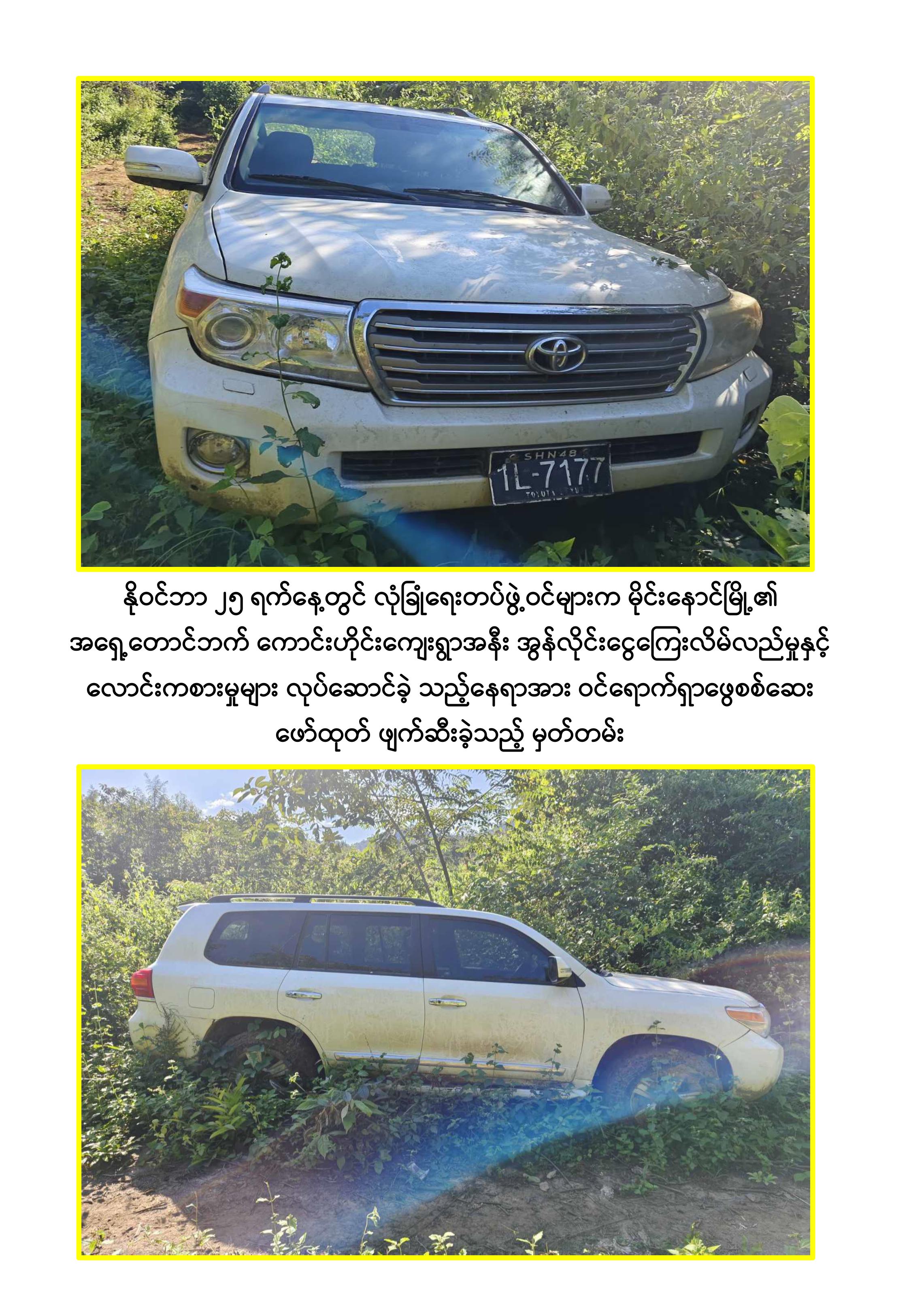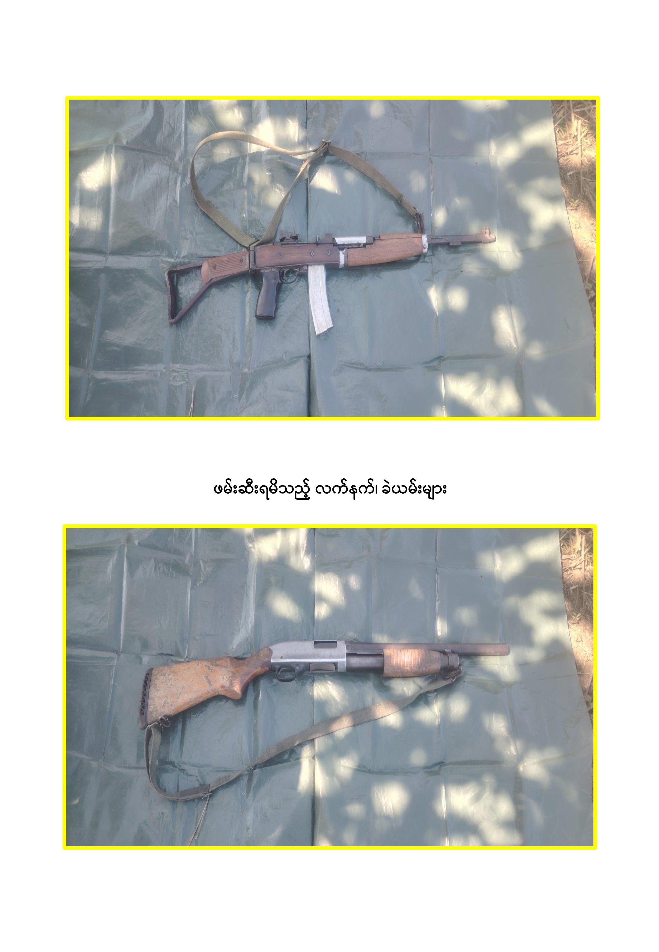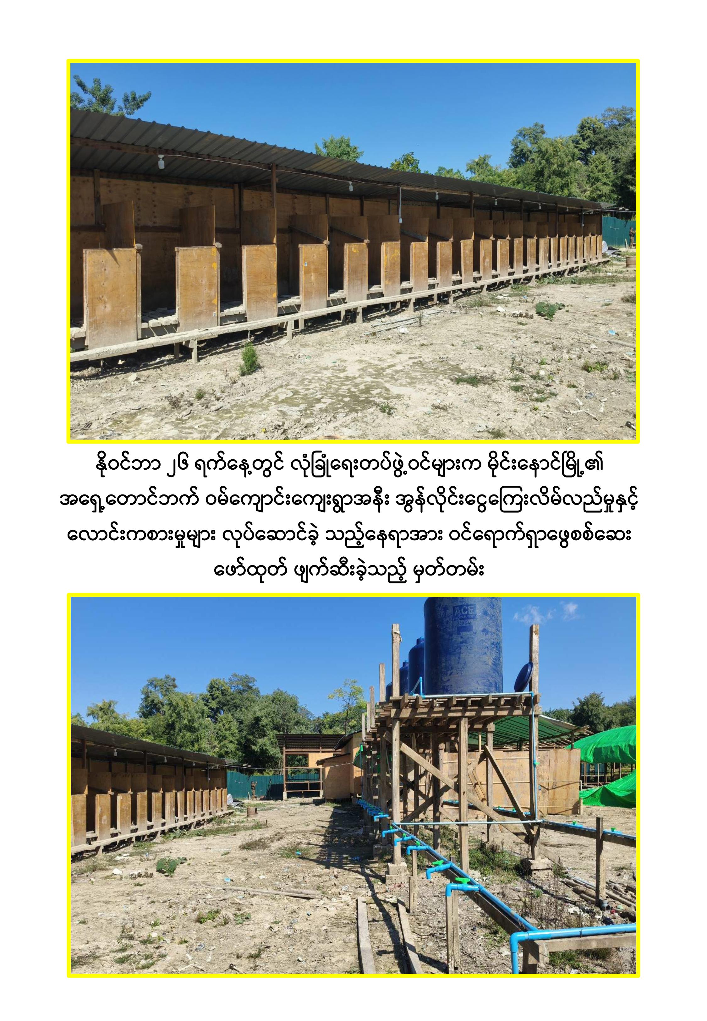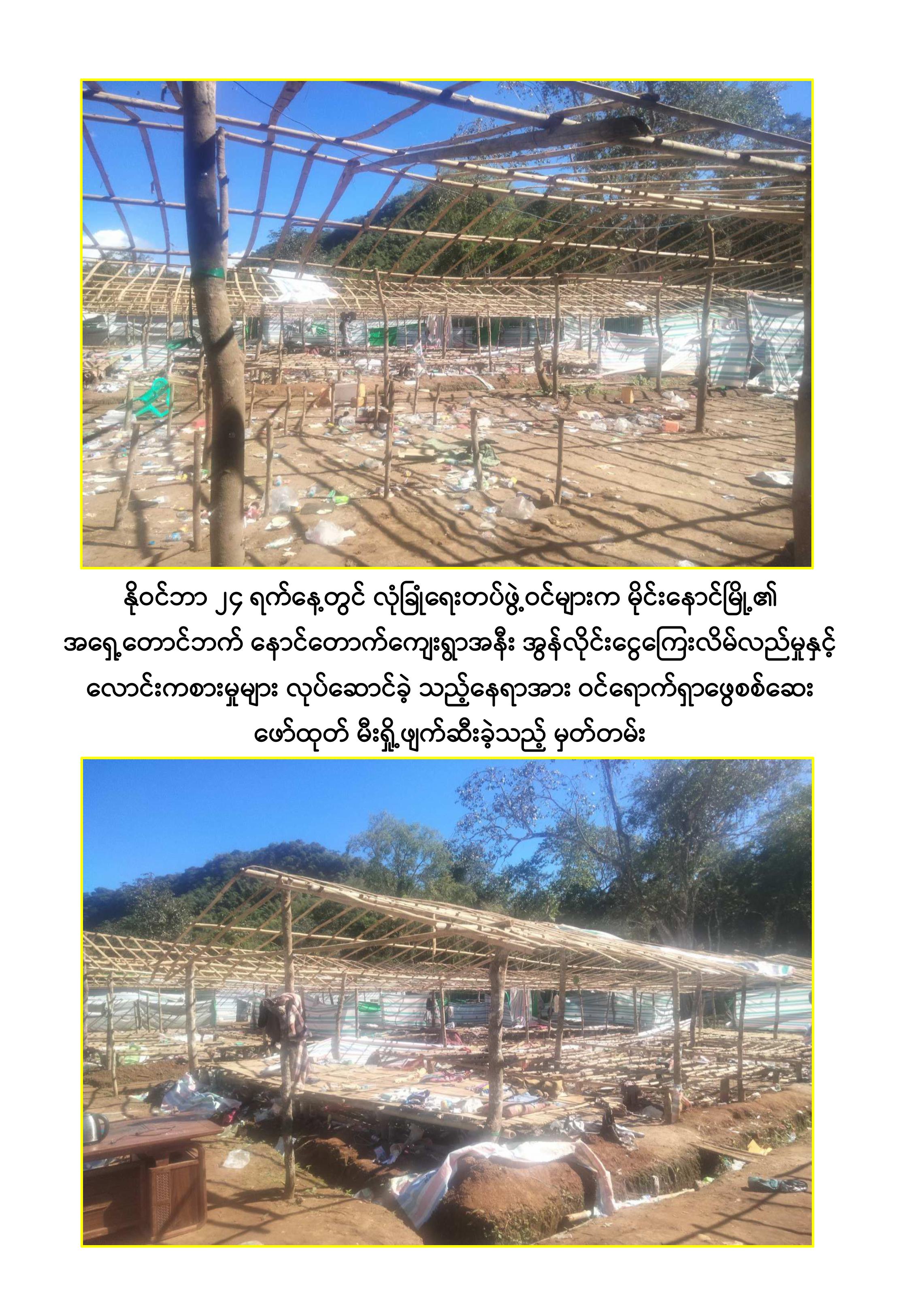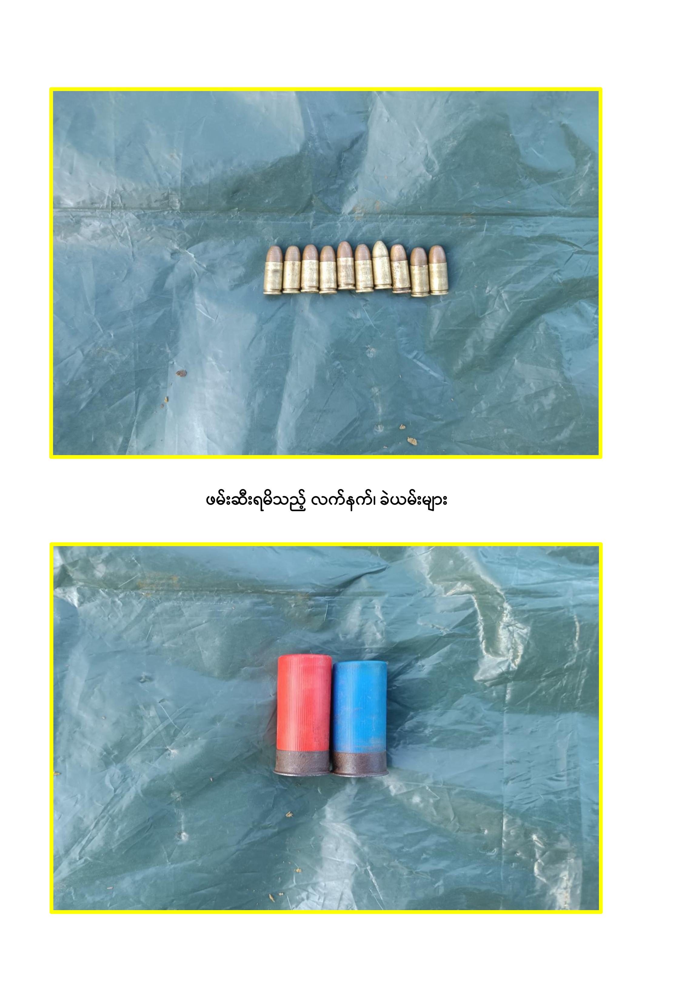 ဆက်လက်၍ လုံခြုံရေးတပ်ဖွဲ့ဝင်များသည် နယ်မြေလုံခြုံရေးလုပ်ငန်းများဆောင်ရွက် ခဲ့ရာ နိုဝင်ဘာ ၂၆ ရက်တွင် မိုင်းနောင်မြို့၏ အရှေ့တောင်ဘက် ဝမ်ကျောင်းကျေးရွာအနီး၌ အွန်လိုင်းလိမ်လည်မှုနှင့် လောင်းကစားလုပ်ငန်းဆောင်ရွက်ရန် ဆောက်လုပ်လျက်ရှိသည့် အလျား ၁၅၀ ပေ၊ အနံ ၁၅ ပေ၊ အမြင့် ၁၅ ပေရှိ သွပ်မိုးတဲ(လူမနေ) ၁ လုံး၊ အလျား ၁၂၀၊ အနံ ၃၀ ပေ၊ အမြင့် ၁၅ ပေရှိ သွပ်မိုးအလုပ်ရုံ ၁ လုံး၊ အလျား ၁၅၀ ပေ၊ အနံ ၆ ပေ၊ အမြင့် ၈ ပေရှိ သွပ်မိုးအထပ်သားကာ ၁ လုံး၊ အလျား ၁၅ ပေ၊ အနံ ၆ ပေ၊ အမြင့် ၈ ပေရှိ သွပ်မိုးအထပ်သားကာ ၁ လုံး၊ အလျား ၁၅၀ ပေ၊ အနံ ၁၅ ပေ၊ အမြင့် ၁၅ ပေရှိ သွပ်မိုးတဲ(လူမနေ) ၁ လုံး၊ အလျား ၈၀ ပေ၊ အနံ ၁၅ ပေ၊ အမြင့် ၁၅ ပေရှိ အမိုးအကာမရှိတဲ ၁ လုံး၊ အလျား ၁၀၀ ပေ၊ အနံ ၂၅ ပေ၊ အမြင့် ၁၅ ပေရှိ သွပ်မိုးအထပ်သားကာတဲ ၁ လုံး၊ အလျား ၁၀၀ ပေ၊ အနံ ၂၅ ပေ၊ အမြင့် ၁၅ ပေရှိ အမိုးအကာမရှိပြိုကျတဲ ၁ လုံး၊ အလျား ၁၀၀ ပေ၊ အနံ ၂၅ ပေ၊ အမြင့် ၁၅ ပေရှိ မိုးကာမိုးတဲ ၁ လုံး၊ အလျား ၁၀၀ ပေ၊ အနံ ၂၅ ပေ၊ အမြင့် ၁၅ ပေရှိ မိုးကာမိုးပြိုကျတဲ ၁ လုံး၊ အလျား ၂၀ ပေ၊ အနံ ၁၂၀ ပေ၊ အမြင့် ၁၅ ပေရှိ မိုးကာမိုးအထပ်သားဂိုထောင် ၁ လုံး၊ အလျား ၂၀ ပေ ပတ်လည်သွပ်မိုးအထပ်သားကာ လူနေအိမ် ၁ လုံး၊ အလျား ၁၅၀ ပေ၊ အနံ ၁၅ ပေ၊ အမြင့် ၁၅ ပေရှိ အမိုးမရှိတဲ ၂ လုံး၊ ဂါလံ ၈၀၀ ဆံ့ တိုင်ကီအပြာ ၄ လုံးတို့ကို လည်းကောင်း၊ မိုင်းနောင်မြို့ ၏ အရှေ့တောင်ဘက် နောင်တောက်ကျေးရွာ၏ တောင်ဘက်နေရာတစ်ဝိုက်အား ထပ်မံ၍ရှင်းလင်းရာ အွန်လိုင်း လိမ်လည် လောင်းကစားမှုများ လုပ်ကိုင်နေသူများဖြစ်သည့် တရုတ်နိုင်ငံသား ၂၆ ဦးနှင့် မြန်မာနိုင်ငံသား ၈ ဦး တို့ကို လည်းကောင်း ဖမ်းဆီးရမိခဲ့ပြီး ၎င်းတို့၏ ဖော်ထုတ်ချက်များအရ အဆိုပါကျေးရွာအနီး၌ သိုဝှက်သိမ်းဆည်းထားသည့် MA-1 သေနတ် ၁ လက်၊ MA-13 သေနတ် ၁ လက်၊ AK-12 သေနတ် ၁ လက်၊ ကာဘိုင်သေနတ် ၁ လက်၊ wichester 12 v သေနတ် ၁ လက်၊ ၉ မမကျည် ၁၀ တောင့်၊ 12 v ကျည် ၂ တောင့်၊ ၉ မမကျည်အိမ် ၁ ခု၊ AK ကျည်အိမ် ၁ ခု နှင့် ကာဘိုင် ကျည်အိမ် ၁ ခု တို့ကို သိမ်းဆည်းရမိခဲ့ကြောင်း သိရှိရသည်။