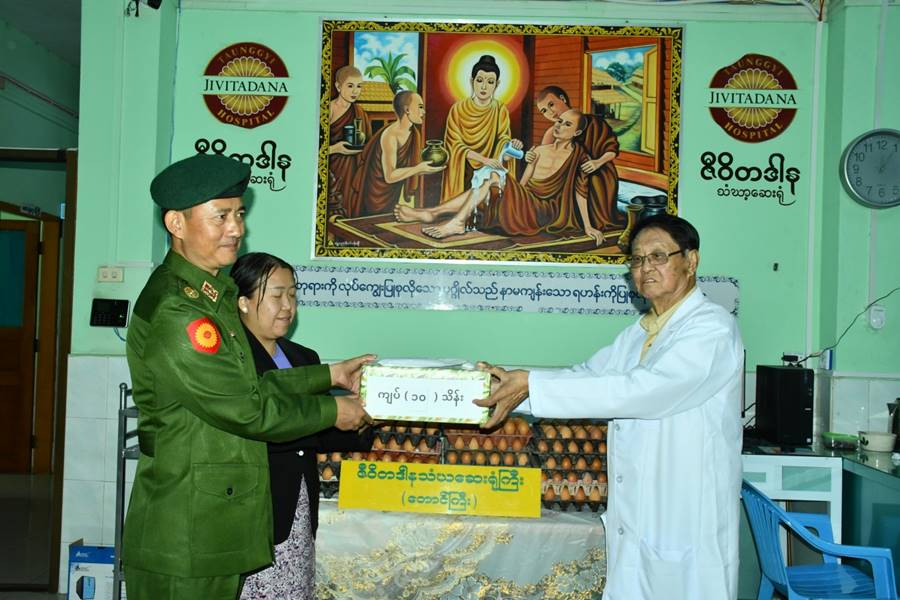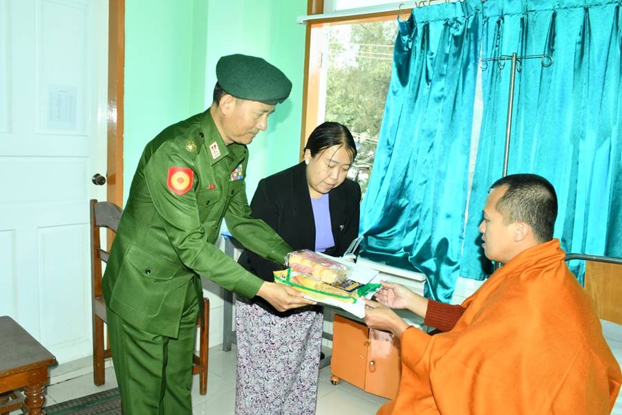 ရှမ်းပြည်နယ်(တောင်ပိုင်း)၊ တောင်ကြီးမြို့၊ စဝ်စံထွန်းရပ်ကွက်ရှိ ဇီဝိတဒါန သံဃာ့ဆေးရုံ၌ ဆေးကုသမှုခံယူလျက်ရှိသော သံဃာတော်များအား ယနေ့နံနက်ပိုင်း တွင် အရှေ့ပိုင်းတိုင်းစစ်ဌာနချုပ် တိုင်းမှူး ဗိုလ်မှူးချုပ် ကျော်နိုင်ဦးနှင့် တာဝန်ရှိသူ များက သွားရောက်ကြည့်ရှု၍ ကျန်းမာရေးတိုးတက်ကောင်းမွန်မှုနှင့် ဆေးဝါးကုသမှု အခြေအနေများကို မေးမြန်းလျှောက်ထားပြီး လှူဖွယ်ပစ္စည်းများနှင့် နဝကမ္မအလှူငွေ များ ဆက်ကပ်လှူဒါန်းသည်။