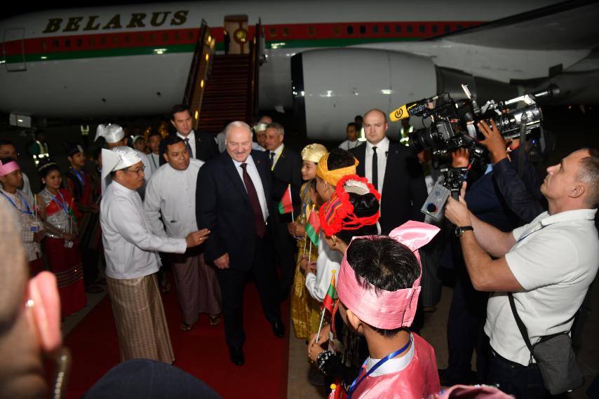 လေဆိပ်သို့ရောက်ရှိစဉ် ဘယ်လာရုစ်သမ္မတ နိုင်ငံသမ္မတ ဦးဆောင်သည့် အဆင့်မြင့်ကိုယ်စားလှယ်အဖွဲ့အား နိုင်ငံတော်လုံခြုံရေးနှင့် အေးချမ်းသာယာရေး ကော်မရှင်အဖွဲ့ဝင် နိုင်ငံတော်ဝန်ကြီးချုပ် ဦးညိုစော၊ ပို့ဆောင်ရေးနှင့်ဆက်သွယ်ရေး ဝန်ကြီးဌာန ပြည်ထောင်စုဝန်ကြီး ဦးမြထွန်းဦး၊ နေပြည်တော်ကောင်စီဥက္ကဋ္ဌ၊ နိုင်ငံခြားရေးဝန်ကြီးဌာန ဒုတိယဝန်ကြီး၊ ဘယ်လာရုစ်သမ္မတနိုင်ငံဆိုင်ရာ မြန်မာနိုင်ငံ သံအမတ်ကြီး၊ မြန်မာနိုင်ငံဆိုင်ရာ ဘီလာရုစ်သမ္မတနိုင်ငံ သံအမတ်ကြီးနှင့် တာဝန် ရှိသူများက ရင်းနှီးနွေးထွေးစွာ ခရီးဦးကြိုဆိုနှုတ်ဆက်ကြသည်။