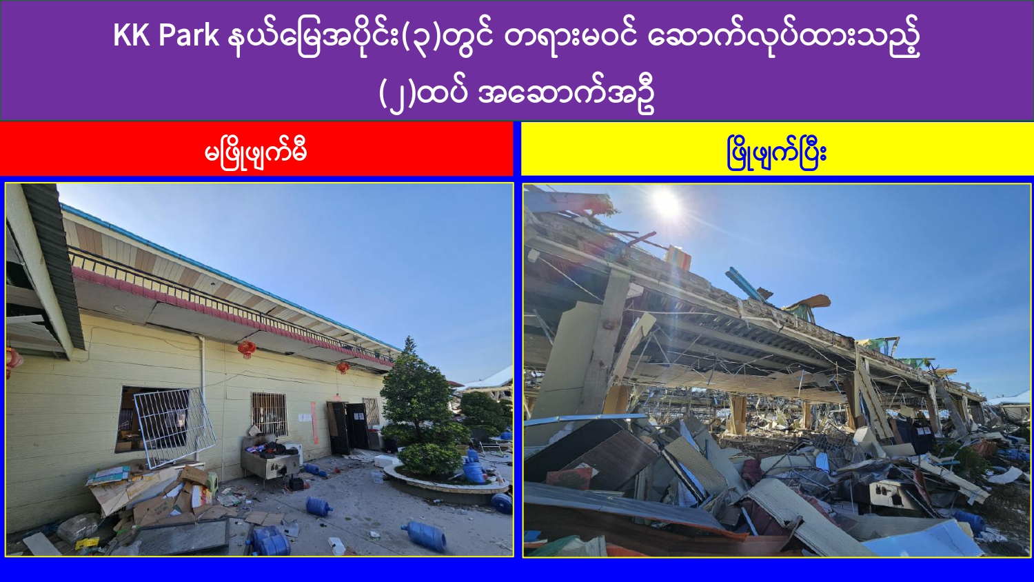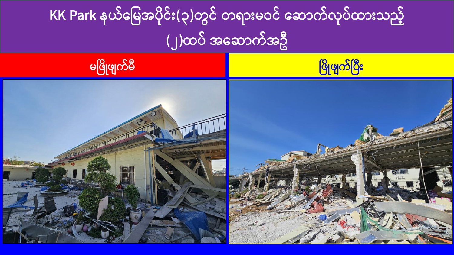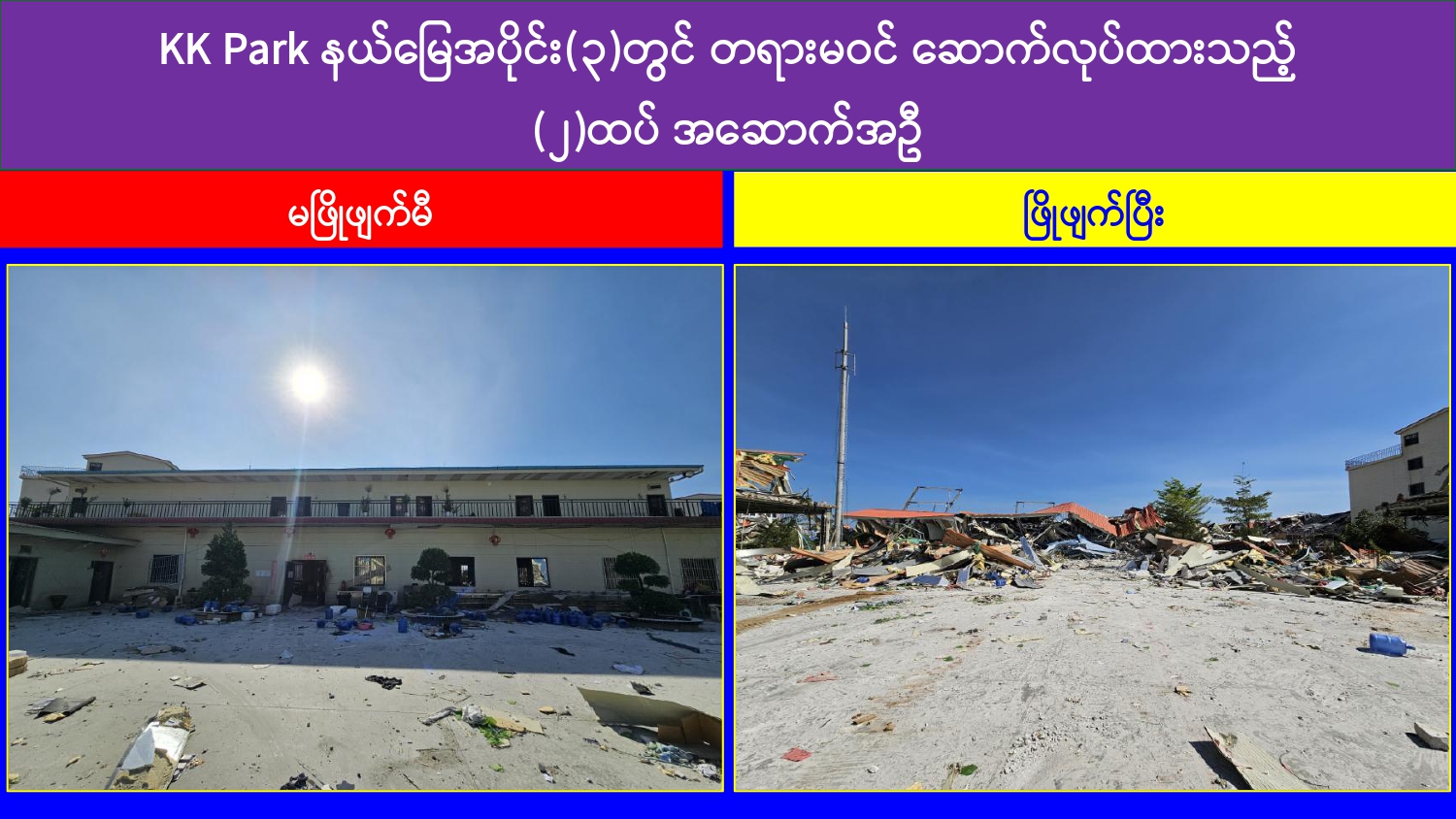 KK Park အပိုင်း(၃) နယ်မြေအတွင်းရှိ အွန်လိုင်းလိမ်လည်မှုနှင့် လောင်းကစားမှုများကျူးလွန်ရာတွင် အသုံးပြုသည့် အဆောက်အအုံ ၇ လုံး ထပ်မံဖြိုချဖျက်ဆီး၊ ရွှေကုက္ကိုလ်နယ်မြေအတွင်း၌ အွန်လိုင်းလိမ်လည်မှုနှင့် လောင်းကစားမှုများ လုပ်ဆောင်ရာတွင် အသုံးပြုခဲ့သည့် အဆောက်အအုံများ ၆၄ လုံးအား ချိတ်ပိတ်သိမ်းဆည်း