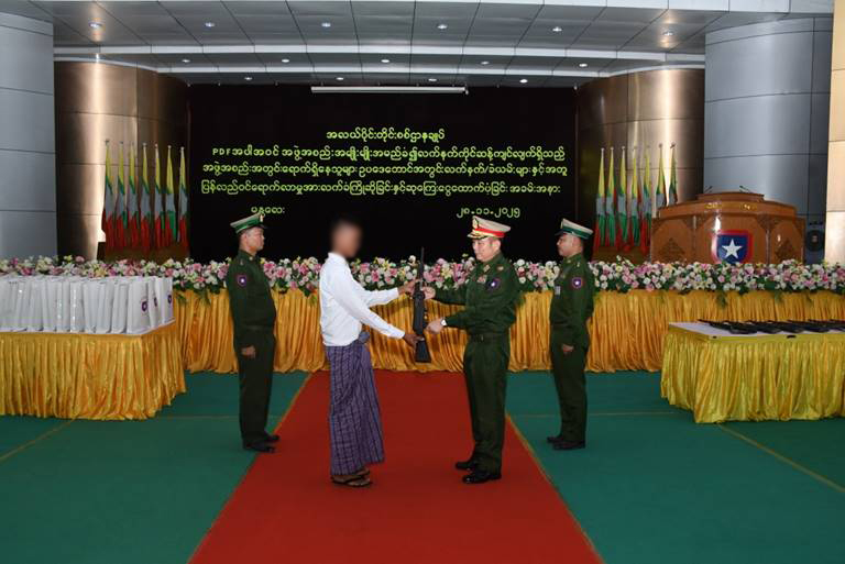 ဦးစွာ တိုင်းဒေသကြီးဝန်ကြီးချုပ်က အဖွင့်အမှာစကားပြောကြားပြီး တိုင်းမှူးက တရားဥပဒေပုဒ်မများနှင့်ပက်သက်၍ အသိပညာပေးစကားများ ရှင်းလင်းဆွေးနွေး ပြောကြားသည်။ ထို့နောက် ဉပဒေဘောင်အတွင်း ပြန်လည်ဝင် ရောက်ခဲ့ကြသူများက ၎င်းတို့နှင့်အတူ ပါရှိလာသည့် မောင်းပြန်ရိုင်ဖယ် ၁၀ လက်၊ ပစ္စတို ၁ လက်၊ လက်လုပ် သေနတ် ၃ လက်၊ လက်ပစ်ဗုံးနှင့်လက်လုပ်မိုင်း ၆ လုံး၊ ကျည်အိမ် ၁၈ ခု၊ ကျည် ၇၅၉ တောင့်တို့အား လွှဲပြောင်းအပ်နှံရာ တိုင်းမှူးက လက်ခံရယူသည်။ ယင်းနောက် တိုင်းဒေသကြီးဝန်ကြီးချုပ်၊ တိုင်းမှူးနှင့် တာဝန်ရှိသူများက လက်နက်၊ ခဲယမ်းများနှင့် အတူ ဥပဒေဘောင်အတွင်း ဝင်ရောက်လာသူများအား မောင်းပြန်ရိုင်ဖယ် ၁ လက်နှုန်းအတွက် ဆုကြေးငွေ သိန်း ၅၀ နှုန်းဖြင့် ၁၀ လက်အတွက် ငွေကျပ် သိန်း ၅၀၀ ၊ ပစ္စတိုသေနတ်တစ်လက်အတွက် ဆုကြေးငွေ ကျပ်သိန်း ၂၀ ၊ လက်လုပ် သေနတ် တစ်လက်နှုန်းအတွက် ဆုကြေးငွေ ၅ သိန်းနှုန်းဖြင့် သေနတ် ၃ လက် အတွက် ငွေကျပ် ၁၅ သိန်း၊ လက်ပစ်ဗုံးနှင့်လက်လုပ်မိုင်းတစ်လုံးစီအတွက် ဆုကြေး ငွေကျပ် ၃ သိန်း နှုန်းဖြင့် လက်ပစ်ဗုံးနှင့်လက်လုပ်မိုင်း ၆ လုံးအတွက် ငွေကျပ် ၁၈ သိန်း နှင့် အလင်းဝင် လာသူအားအားလုံးအတွက် တစ်ဦးလျှင် ငွေကျပ် (၅၀၀၀၀)နှုန်း ဖြင့် လူ ၈၃ ဦးအတွက် ဆုကြေးငွေကျပ် ၄၁၅၀၀၀၀ ကျပ်၊ စုစုပေါင်းငွေကျပ် ၅၉၄၅၀၀၀၀ ကျပ်နှင့် ထောက်ပံ့ပစ္စည်းများကို ပြန်လည်ထောက်ပံ့ပေးအပ်ကာ ခံဝန် ကတိလက်မှတ်ရေးထိုး စေပြီး မိဘအုပ်ထိန်းသူများထံ ပြန်လည်လွှဲပြောင်း အပ်နှံပေး အပ်ခဲ့သည်။