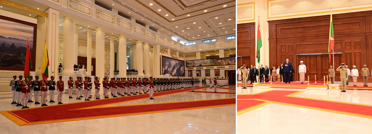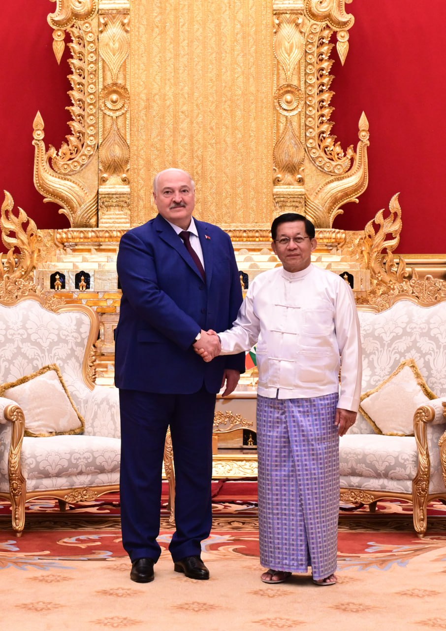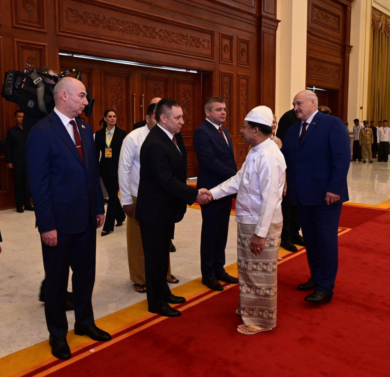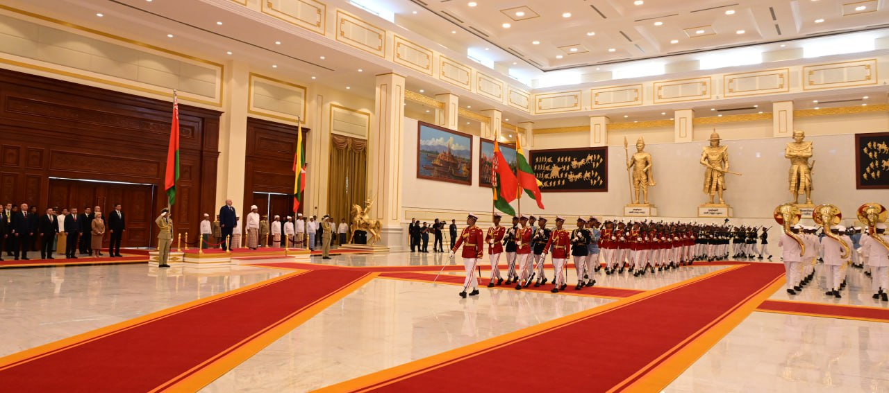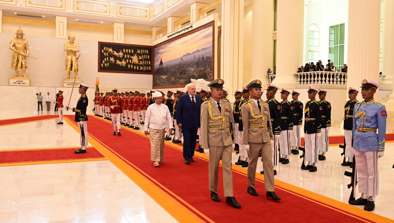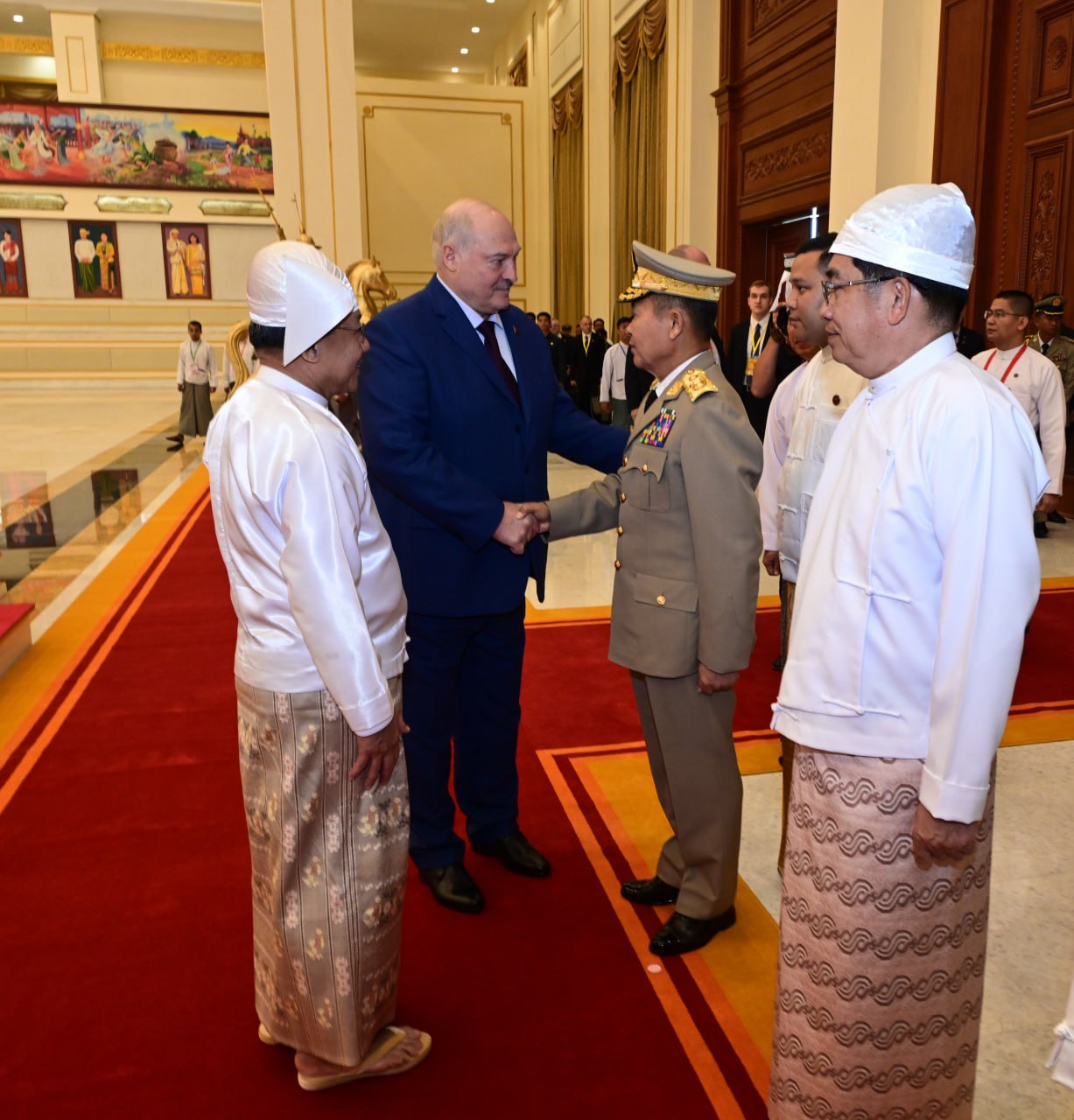 ပြည်ထောင်စုသမ္မတမြန်မာ နိုင်ငံတော် ယာယီသမ္မတ နိုင်ငံတော်လုံခြုံရေးနှင့် အေးချမ်းသာယာရေး ကော်မရှင်ဥက္ကဋ္ဌ ဗိုလ်ချုပ်မှူးကြီး မင်းအောင်လှိုင် သည် မြန်မာ နိုင်ငံသို့တရားဝင်ချစ်ကြည်ရေးခရီးရောက်ရှိလာသော ဘယ်လာရုစ်သမ္မတနိုင်ငံသမ္မတ H.E. Mr. Aleksandr Lukashenko အား ယနေ့နံနက်ပိုင်းတွင် သမ္မတ အိမ်တော်၊ ဆင်ဖြူတော်ဆောင်ဧည့်ခန်းမ၌ ဂုဏ်ပြုတပ်ဖွဲ့ဖြင့် ကြိုဆိုသည်။