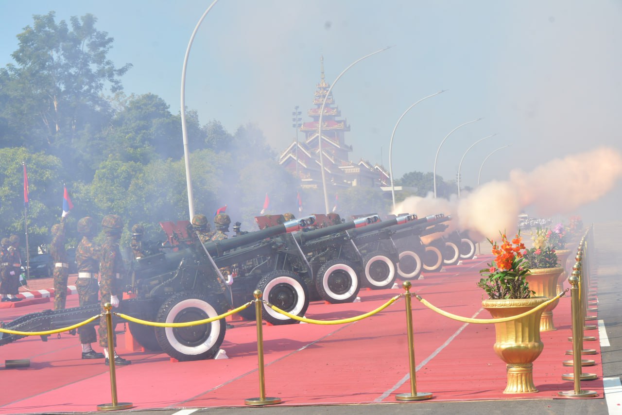 ယင်းနောက် နိုင်ငံတော်ယာယီသမ္မတ နိုင်ငံတော်လုံခြုံရေးနှင့် အေးချမ်း သာယာရေးကော်မရှင်ဥက္ကဋ္ဌ နှင့် ဘယ်လာရုစ်သမ္မတနိုင်ငံသမ္မတ တို့သည် ဂုဏ်ပြုခံ စင်မြင့်၌ နေရာယူပြီး ဂုဏ်ပြုတပ်ဖွဲ့၏အလေးပြုခြင်းကို ခံယူကြသည်။ ထိုသို့ ဂုဏ်ပြု တပ်ဖွဲ့၏ အလေးပြုခြင်းကို ခံယူနေချိန်တွင် ဂုဏ်ပြုအမြောက်တပ်ဖွဲ့မှလည်း အမြောက် ၂၁ ချက်ကို စစ်ရေးပြအခမ်းအနားဖြင့် ဂုဏ်ပြုပစ်ဖောက်သည်။