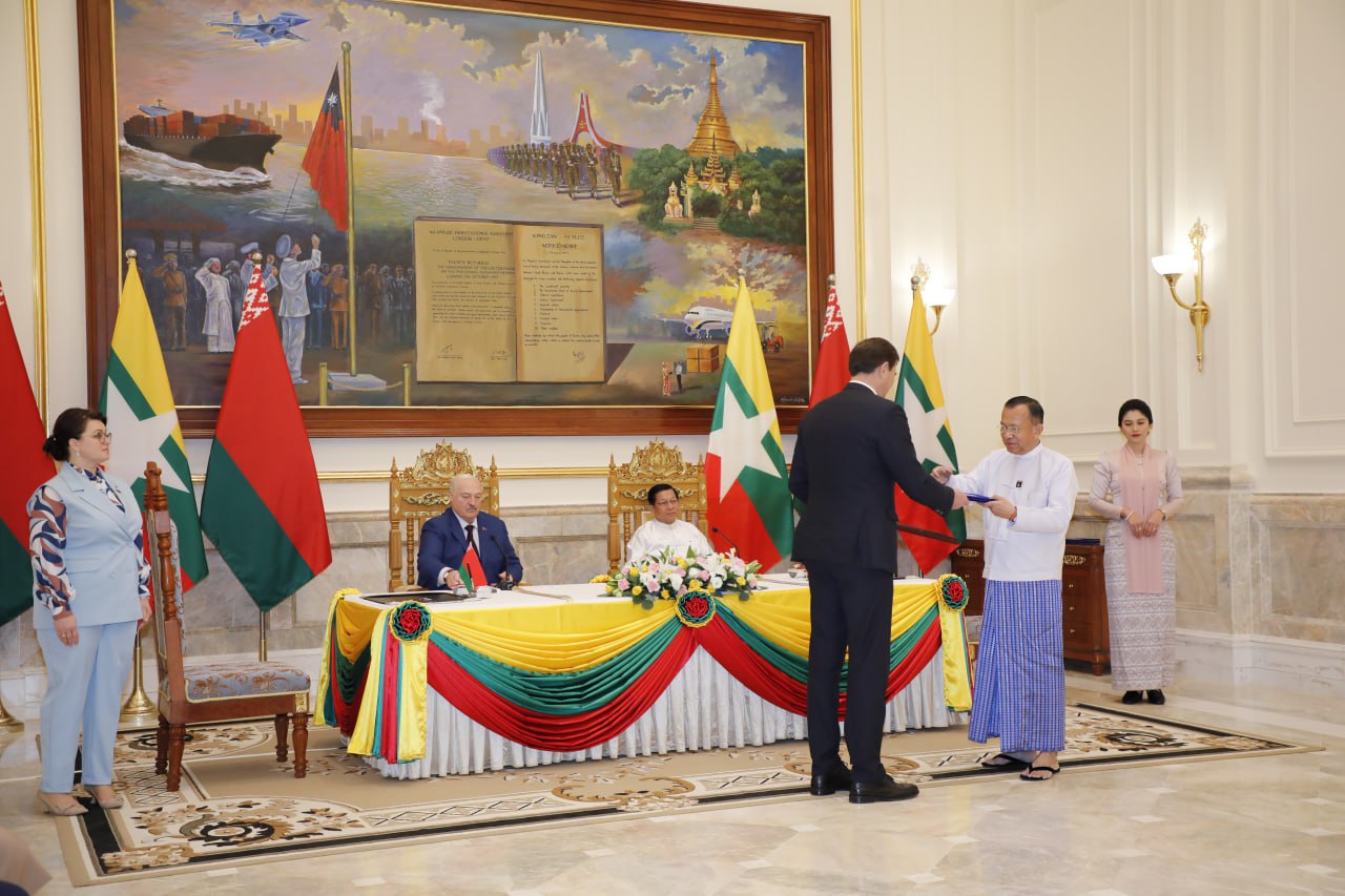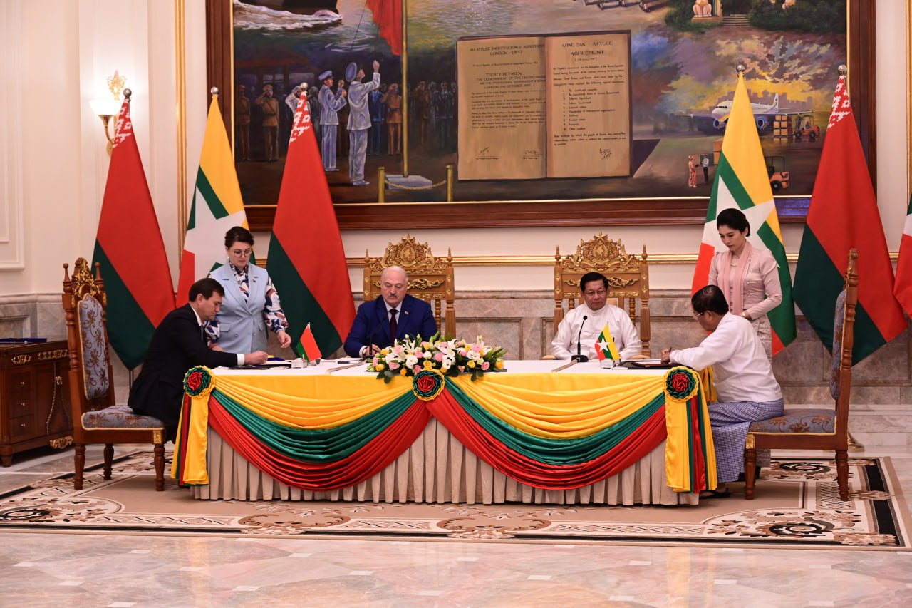 ယင်းနောက် ပြည်ထောင်စုသမ္မတမြန်မာနိုင်ငံတော်နှင့် ဘယ်လာရုစ်သမ္မတ နိုင်ငံတို့အကြား နားလည်မှုစာချွန်လွှာလက်မှတ်ရေးထိုးပွဲကို ဆက်လက်ကျင်းပြုလုပ် ရာ သိပ္ပံနှင့်နည်းပညာဆိုင်ရာပူးပေါင်းဆောင်ရွက်မှု နားလည်မှုစာချွန်လွှာများ၊ အကောက်အခွန်ဆိုင်ရာကိစ္စရပ်များတွင် ပူးပေါင်းဆောင်ရွက်ရေးဆိုင်ရာ နားလည်မှု စာချွန်လွှာများ၊ ပို့ကုန်ချေးငွေမူဘောင်သဘောတူညီချက်နှင့် နိုင်ငံတော်အဆင့် စံချိန် စံညွှန်းသတ်မှတ်ခြင်း၊ အရည်အသွေးကိုက်ညီမှု စစ်ဆေးခြင်း၊ တိကျစွာ တိုင်းတာခြင်း နှင့် အသိအမှတ်ပြုခြင်းနယ်ပယ်တို့တွင် ပူးပေါင်းဆောင်ရွက်ရေးဆိုင်ရာ နားလည်မှု စာချွန်လွှာများ၊ နှစ်နိုင်ငံပူးပေါင်းဆောင်ရွက်မှု မြှင့်တင်ရေးဆိုင်ရာ လမ်းပြမြေပုံ၊ ကုန်သွယ်ရေး၊ စီးပွားရေး၊ သိပ္ပံ၊ နည်းပညာနှင့် ယဉ်ကျေးမှုဆိုင်ရာ ပူးပေါင်းဆောင်ရွက် မှုစာချွန်လွှာများ၊ တရားမဝင်နှင့် ကူးသန်းရောင်းဝယ်ရေးဆိုင်ရာကိစ္စရပ်များတွင် ဥပဒေရေး ရာအပြန်အလှန် အကူအညီပေးရေးသဘောတူစာချုပ်နှင့် ရင်းနှီးမြှုပ်နှံမှု မြှင့်တင်ရေးဆိုင်ရာနားလည်မှုစာချွန်လွှာများအားနှစ်နိုင်ငံပြည်ထောင်စုဝန်ကြီးများနှင့် မြန်မာနိုင်ငံ ဆိုင်ရာဘယ်လာရုစ်နိုင်ငံ သံအမတ်ကြီးတို့က နိုင်ငံတော်ယာယီသမ္မတ နိုင်ငံတော် လုံခြုံရေးနှင့်အေးချမ်းသာယာရေးကော်မရှင်ဥက္ကဋ္ဌနှင့် ဘယ်လာရုစ်သမ္မတ နိုင်ငံသမ္မတတို့ ရှေ့မှောက်တွင် လက်မှတ်များရေးထိုးကြပြီး စာချွန်လွှာများကို အပြန်အလှန် လဲလှယ်ကြသည်။