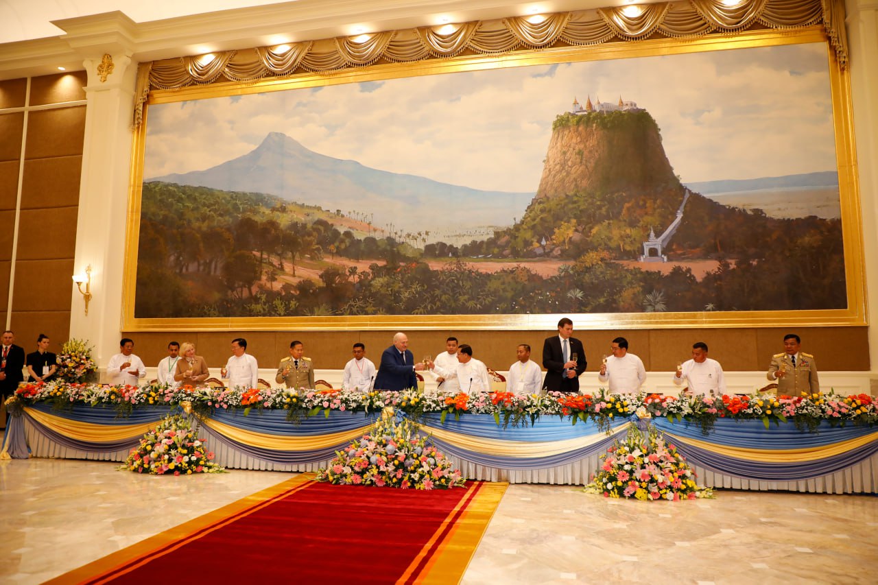 ယင်းနောက် နိုင်ငံတော်ယာယီသမ္မတ နိုင်ငံတော်လုံခြုံရေးနှင့် အေးချမ်းသာယာ ရေးကော်မရှင်ဥက္ကဋ္ဌ သည် ဘယ်လာရုစ်သမ္မတနိုင်ငံသမ္မတ ဦးဆောင်သည့် ကိုယ်စား လှယ်အဖွဲ့ဝင်များအား ဂုဏ်ပြုနေ့လယ်စာဖြင့် တည်ခင်းဧည့်ခံသည်။