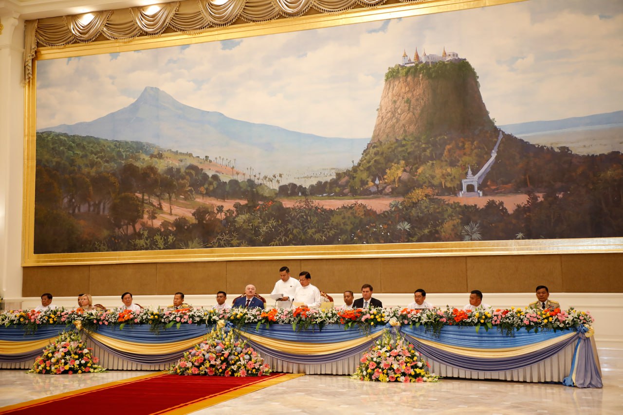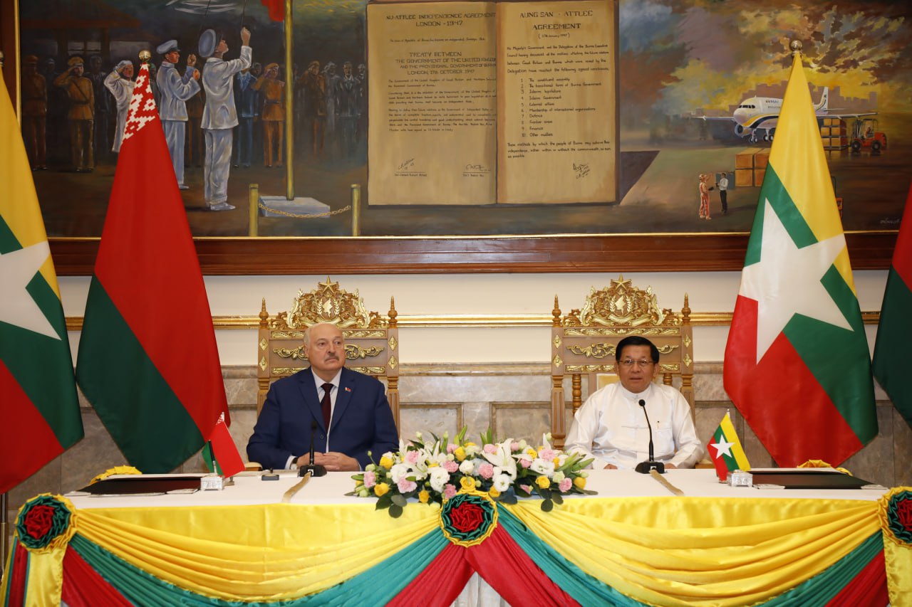 ထို့နောက် ဘယ်လာရုစ်သမ္မတနိုင်ငံသမ္မတက ပြန်လည်ဆွေးနွေးပြောကြားရာ တွင် မိမိနှင့်ချစ်ကြည်ရေးကိုယ်စားလှယ်အဖွဲ့ဝင်များအား နွေးထွေးစွာဖြင့် ကြိုဆို သည့်အတွက်လှိုက်လှိုက်လှဲလှဲကျေးဇူးတင်ရှိပါကြောင်း၊ မိမိအနေဖြင့် မြန်မာနိုင်ငံသို့ ပထမဆုံးလာရောက်သည့် ခရီးစဉ်ဖြစ်သည့်အတွက် ဝမ်းမြောက်ဂုဏ်ယူမိသည်ကို ပြောကြားလိုကြောင်း၊ အဆွေတော်အနေဖြင့် မတ်လအတွင်း ဘယ်လာရုစ်နိုင်ငံသို့ တရားဝင်ချစ်ကြည်ရေးခရီးစဉ်လာရောက်ခဲ့မှုသည်လည်း မြန်မာနိုင်ငံမှ နိုင်ငံတော် အကြီးအကဲတစ်ဦး၏ ပထမဆုံးချစ်ကြည်ရေးခရီးစဉ်ဖြစ်ပါကြောင်း၊ ယခုနှစ်အတွင်း မိမိတို့နှစ်ဦးအနေဖြင့် ၆ ကြိမ်တွေ့ဆုံခဲ့ပြီးဖြစ်ကြောင်း၊ ထို့ကြောင့် ၂၀၂၅ ခုနှစ်သည် နှစ်နိုင်ငံအတွက် အမှတ်တရများ များစွာရှိပြီး နှစ်နိုင်ငံအကြား သမိုင်း အသစ်များ စိုက်ထူနိုင်သည့် နှစ်တစ်နှစ်ဖြစ်ပါကြောင်း၊ နှစ်နိုင်ငံအကြားပူးပေါင်းဆောင်ရွက်မှု များကို အောင်အောင်မြင်မြင် လုပ်ဆောင်လျက်ရှိကြောင်း၊ မင့်စ်မြို့တွင်ကျင်းပခဲ့သည့် EAEU အစည်းအဝေးသို့ မြန်မာနိုင်ငံမှ နိုင်ငံခြားရေးဝန်ကြီး ဦးဆောင်၍တက်ရောက်ခဲ့ ကြောင်း၊ ယခုနှစ်အတွင်း မိမိတို့အနေဖြင့် နိုင်ငံတကာအခမ်းအနားများ၊ နိုင်ငံတကာ အစည်းအဝေးများတွင် တွေ့ဆုံဆွေးနွေးမှုများ များစွာပြုလုပ်နိုင်ခဲ့ကြောင်း၊ ထိုသို့ တွေ့ဆုံချိန်တွင် အပြန်အလှန်ကူညီရေးဆိုင်ရာများကိုဆွေးနွေးနိုင်ခဲ့ကြောင်း၊ မိမိတို့ နိုင်ငံအနေဖြင့် မြန်မာနိုင်ငံနှင့်ပတ်သက်ပြီး အမြဲတံခါးဖွင့်ထားပါကြောင်း၊ မြန်မာနိုင်ငံ နှင့် ပူးပေါင်းဆောင်ရွက်မှုများ ဆောင်ရွက်ချိန်တွင် မည်သည့်ပြင်ပနှောင့်ယှက် စွက်ဖက်မှုများရှိနေပါစေ တစ်စိုက်မတ်မတ်ဖြင့် ဆက်လက်ပူးပေါင်းဆောင်ရွက်သွား မည်ကို ပြောကြားလိုပါကြောင်း၊ မိမိတို့နိုင်ငံမှ တာဝန်ရှိသည့်ဝန်ကြီးများ၊ မြန်မာနိုင်ငံမှ တာဝန်ရှိသည့် ဝန်ကြီးများ ပူးပေါင်း၍ စီးပွားရေးဖိုရမ်များကျင်းပခဲ့ပြီး တွေ့ဆုံ ဆွေးနွေးမှုများပြုလုပ်ခဲ့ပါကြောင်း၊ထိုမှတစ်ဆင့် နှစ်နိုင်ငံပူးပေါင်းဆောင်ရွက်မှုများ အောင်မြင်စေရေးနှင့် ရလဒ်ကောင်းများ ရရှိစေရေးဆွေးဆောင်ရွက်နိုင်ခဲ့ပါကြောင်း၊ မိမိတို့အနေဖြင့် ယနေ့တွင် နှစ်နိုင်ငံပူးပေါင်းဆောင်ရွက်မှု မြှင့်တင်ရေးဆိုင်ရာ လမ်းပြမြေပုံ(၂၀၂၆-၂၀၂၈) ကိုလက်မှတ်ရေး ထိုးသွားမည်ဖြစ်ပါကြောင်း၊ အဆိုပါ လမ်းပြမြေပုံ၌ နှစ်နိုင်ငံပူးပေါင်းဆောင်ရွက်ရေးနှင့် ပတ်သက်သည့် အချက်များစွာ ပါဝင်ကြောင်း၊ အဆိုပါလမ်းပြမြေပုံအတိုင်းဆောင်ရွက် သွားမည်ဆိုပါက နှစ်နိုင်ငံ စီးပွားရေးဆိုင်ရာ ပူးပေါင်းဆောင်ရွက်မှုများ ပိုမိုအောင်မြင် နိုင်မည်ဖြစ