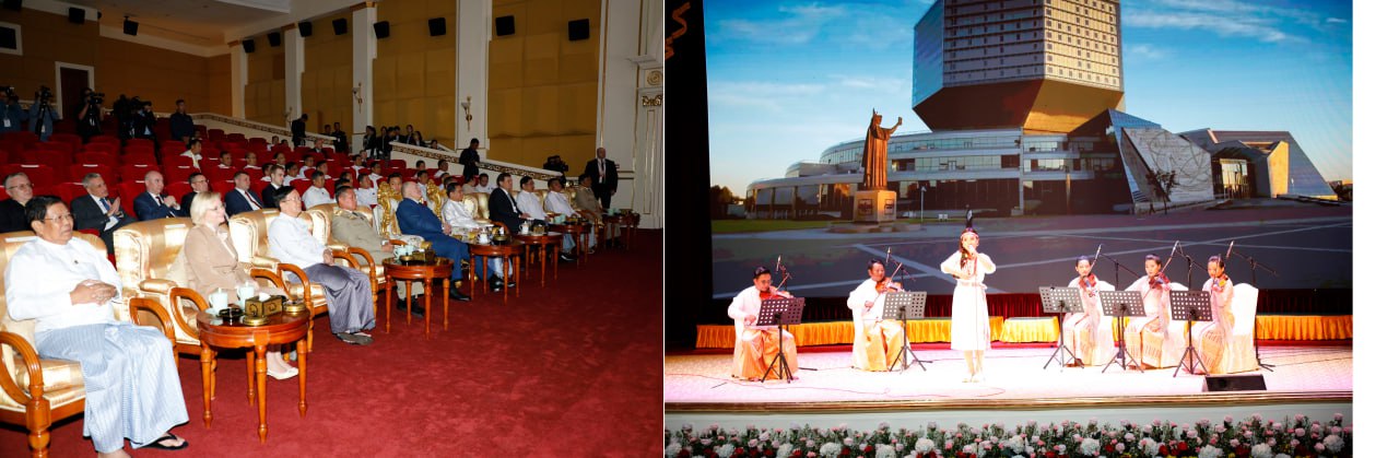 ဂုဏ်ပြုနေ့လယ်စာသုံးဆောင်နေစဉ်အတွင်းသာသနာရေးနှင့်ယဉ်ကျေးမှုဝန်ကြီး ဌာန၊ အနုပညာဦးစီးဌာနနှင့် ပြည်သူ့ဆက်ဆံရေးနှင့် စိတ်ဓာတ်စစ်ဆင်ရေးညွှန်ကြား ရေးမှူးရုံးကွပ်ကဲမှုအောက် မြဝတီတေးဂီတအဖွဲ့တို့မှ အနုပညာရှင်များက မြန်မာ တေးသံသာများ၊ ဘယ်လာရုစ်နိုင်ငံတေးသံသာများဖြင့် တီးမှုတ်ဖျော်ဖြေကြသည်။