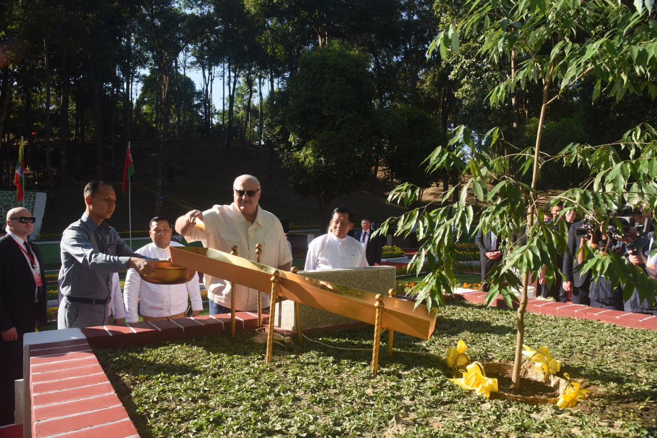 ဘယ်လာရုစ်သမ္မတနိုင်ငံသမ္မတ H.E. Mr. Aleksandr Lukashenko နှင့် ပြည်ထောင်စုသမ္မတမြန်မာနိုင်ငံတော် ယာယီသမ္မတ နိုင်ငံတော်လုံခြုံရေးနှင့် အေးချမ်းသာယာရေးကော်မရှင်ဥက္ကဋ္ဌ ဗိုလ်ချုပ်မှူးကြီး မင်းအောင်လှိုင်တို့ နှစ်နိုင်ငံအထိမ်းအမှတ်သစ်ပင်အတူတကွစိုက်ပျိုး နေပြည်တော် နိုဝင်ဘာ ၂၈