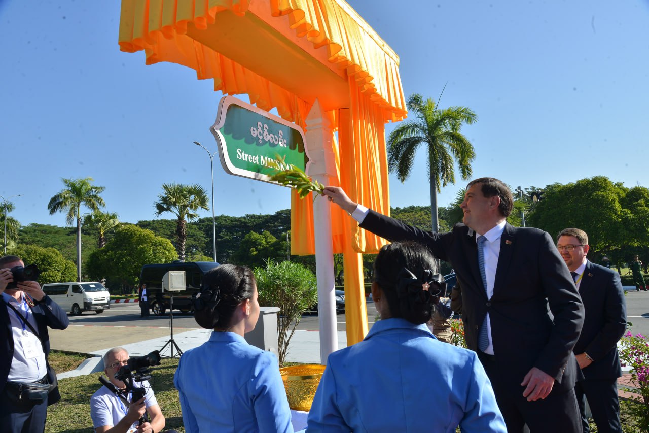 ယင်းနောက် ဘယ်လာရုစ်သမ္မတနိုင်ငံ နိုင်ငံခြားရေးဝန်ကြီးနှင့် နေပြည်တော် ကောင်စီဉက္ကဋ္ဌတို့က လမ်းအမည်ဆိုင်းဘုတ်ကို စက်ခလုတ်နှိပ်ဖွင့်လှစ်ပေးပြီး ဘယ်လာ ရုစ်သမ္မတနိုင်ငံ နိုင်ငံခြားရေးဝန်ကြီးက လမ်းအမည်ဆိုင်းဘုတ်ကို အမွှေးနံသာရည်များ ပက်ဖျန်းပေးသည်။