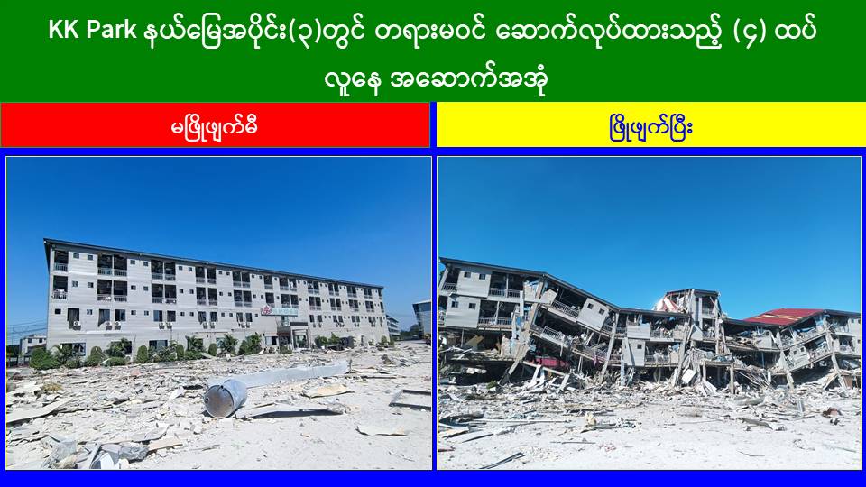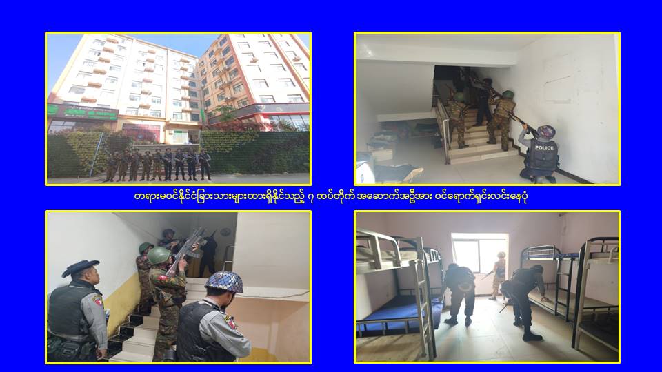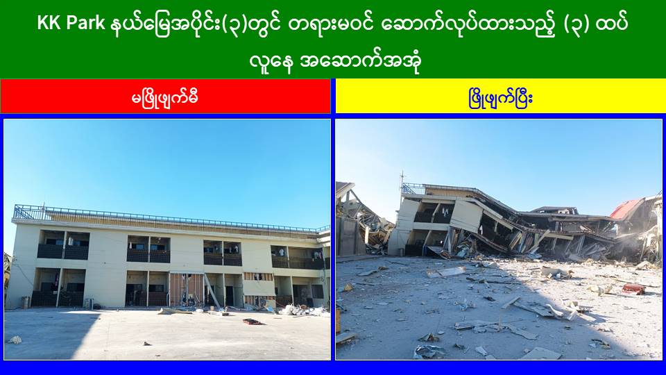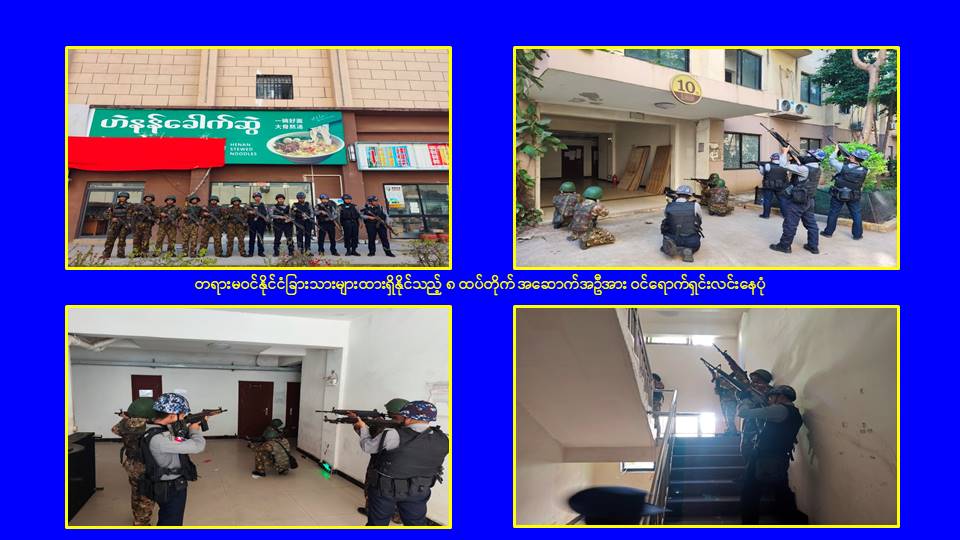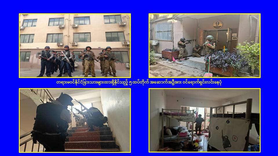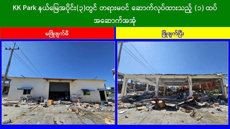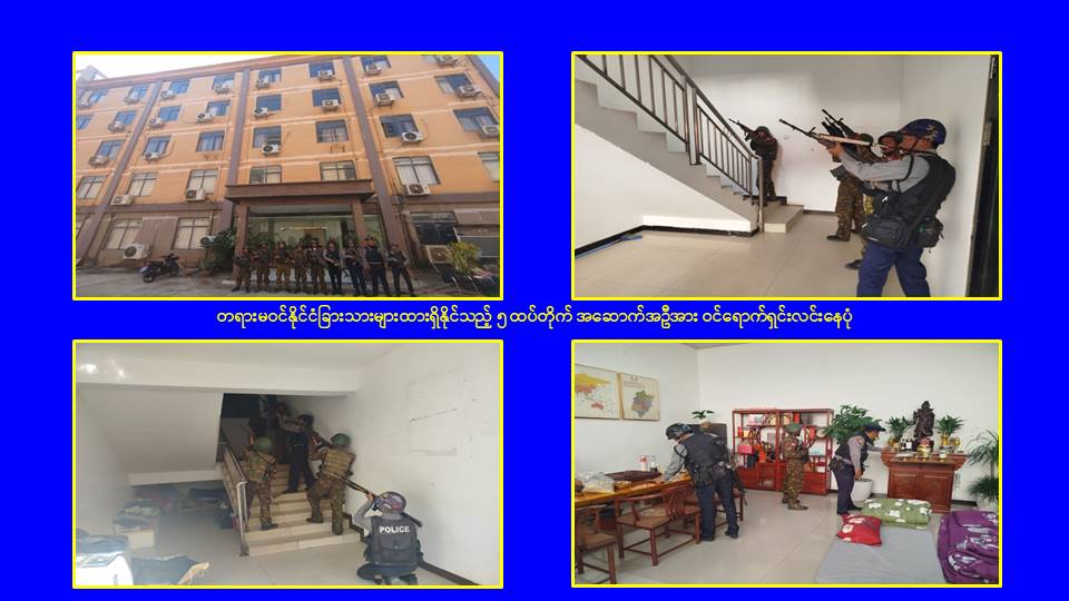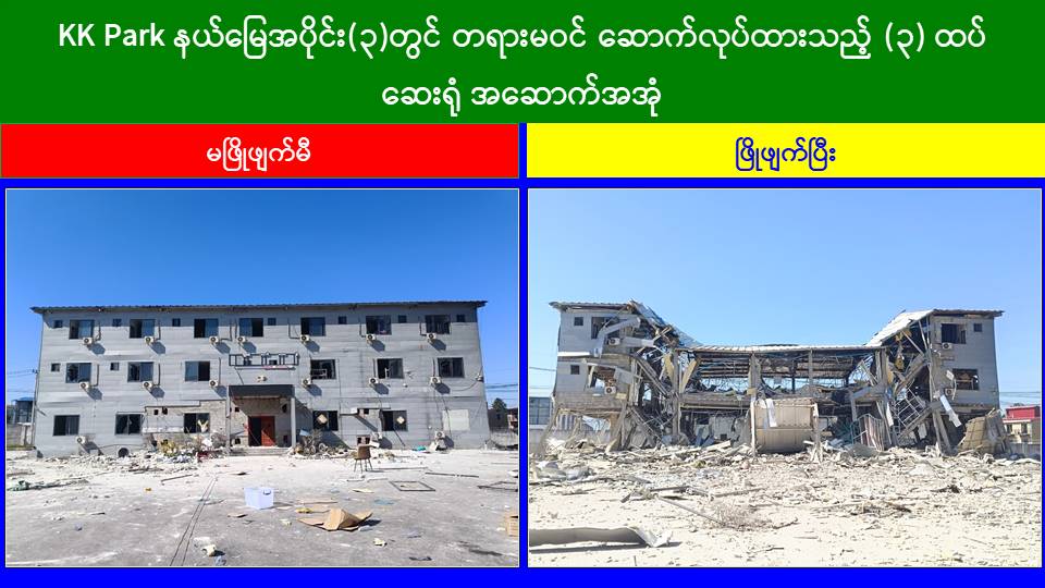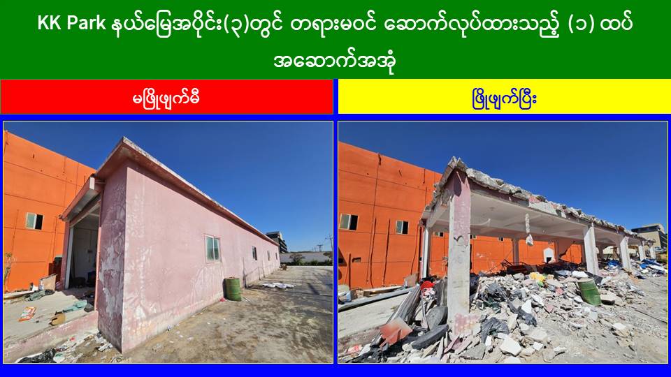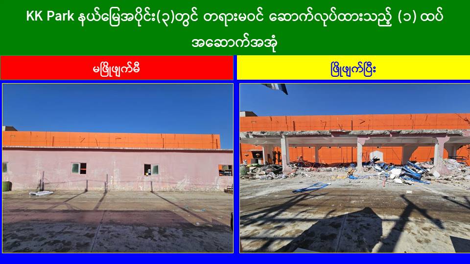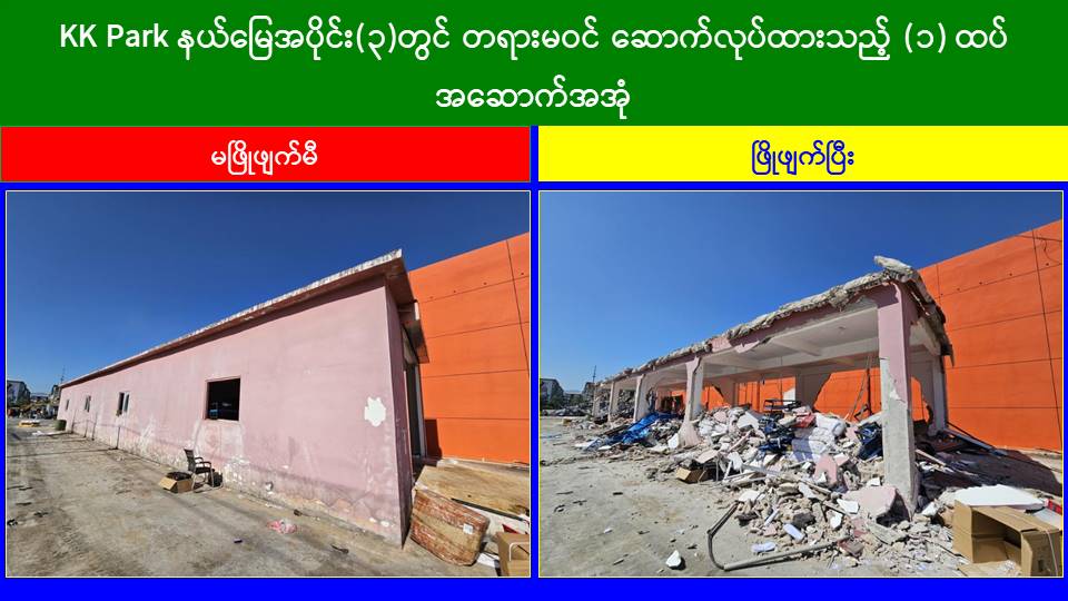 KK Park နယ်မြေအတွင်း တရားမဝင်အဆောက်အအုံများအား ဆက်လက်ဖြိုချဖျက်ဆီး၊ ရွှေကုက္ကိုလ်နယ်မြေတို့အတွင်း online လိမ်လည်လောင်းကစားမှုများနှင့် ဒုစရိုက်မှုများကျူးလွန်နေကြသူများအား အဖွဲ့စုံပါဝင်သည့်ပူးပေါင်းစစ်ဆေးရေးအဖွဲ့များဖြင့် ဆက်လက်ရှင်းလင်းဆောင်ရွက်