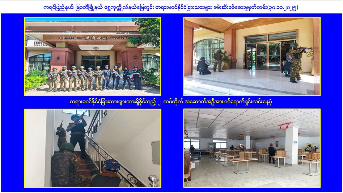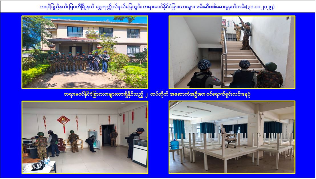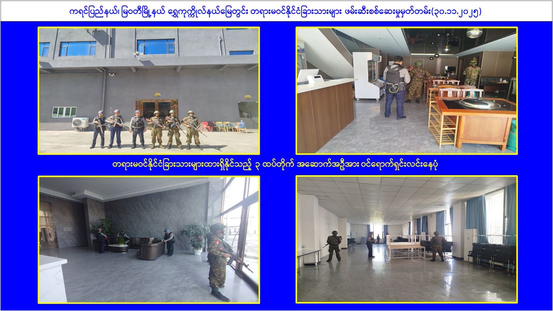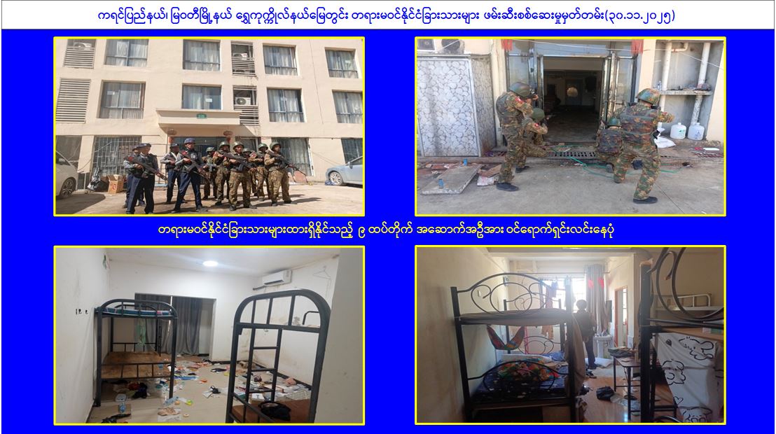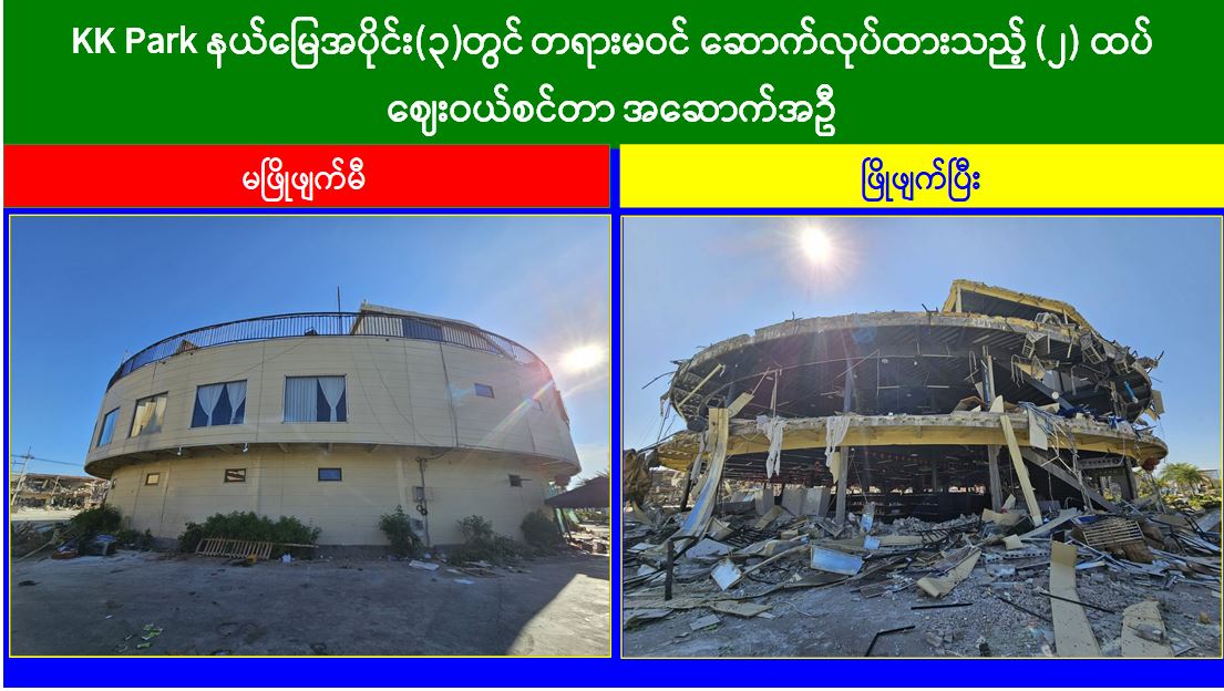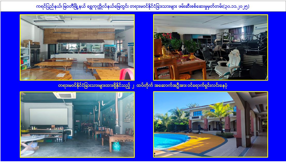 မြန်မာနိုင်ငံအစိုးရအနေဖြင့် အွန်လိုင်းလိမ်လည်မှုများနှင့် အွန်လိုင်းလောင်းကစားမှု များ အများဆုံးအခြေချလုပ်ကိုင်လျက်ရှိကြသည့် ရွှေကုက္ကိုလ်နယ်မြေနှင့် KK Park နယ်မြေများ၌ လုံခြုံရေးတပ်ဖွဲ့ဝင်များ၊ အုပ်ချုပ်ရေးအဖွဲ့အစည်းများနှင့် ဒေသတွင်း တာဝန်ရှိသူများအပါအဝင် အဖွဲ့စုံပါဝင်သည့် ပူးပေါင်းအဖွဲ့ဖြင့် တရားမဝင် အဆောက် အအုံများအတွင်း ဝင်ရောက်ရှင်းလင်းခြင်း၊ အွန်လိုင်းလိမ်လည်လောင်းကစားမှု လုပ်ငန်း စဉ်များတွင်အသုံးပြုခဲ့သည့် သိမ်းဆည်းရမိပစ္စည်းများနှင့် တရားမဝင် အဆောက်အအုံ များအား စနစ်တကျဖြိုချဖျက်ဆီးခြင်းများ ဆက်လက်ဆောင်ရွက်လျက်ရှိသည်။