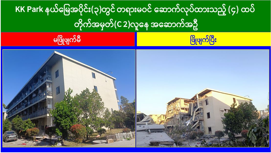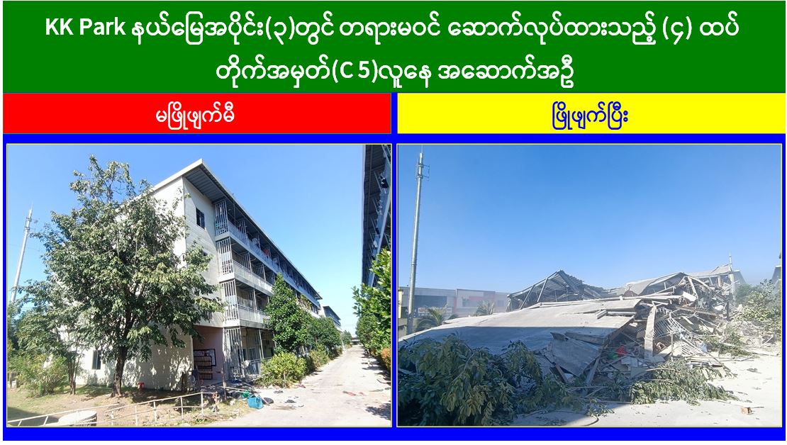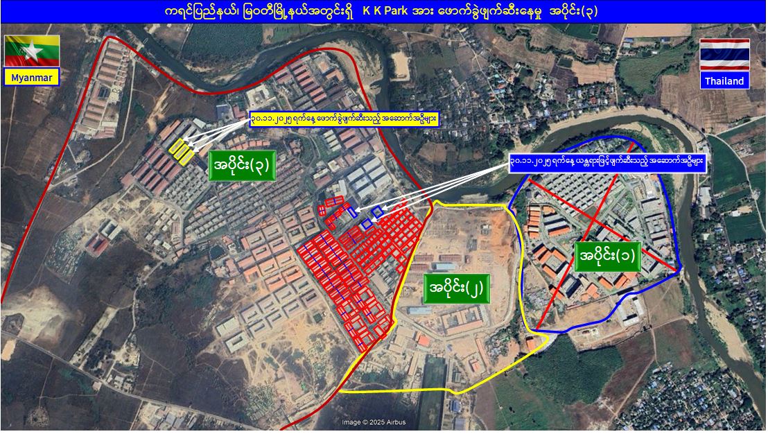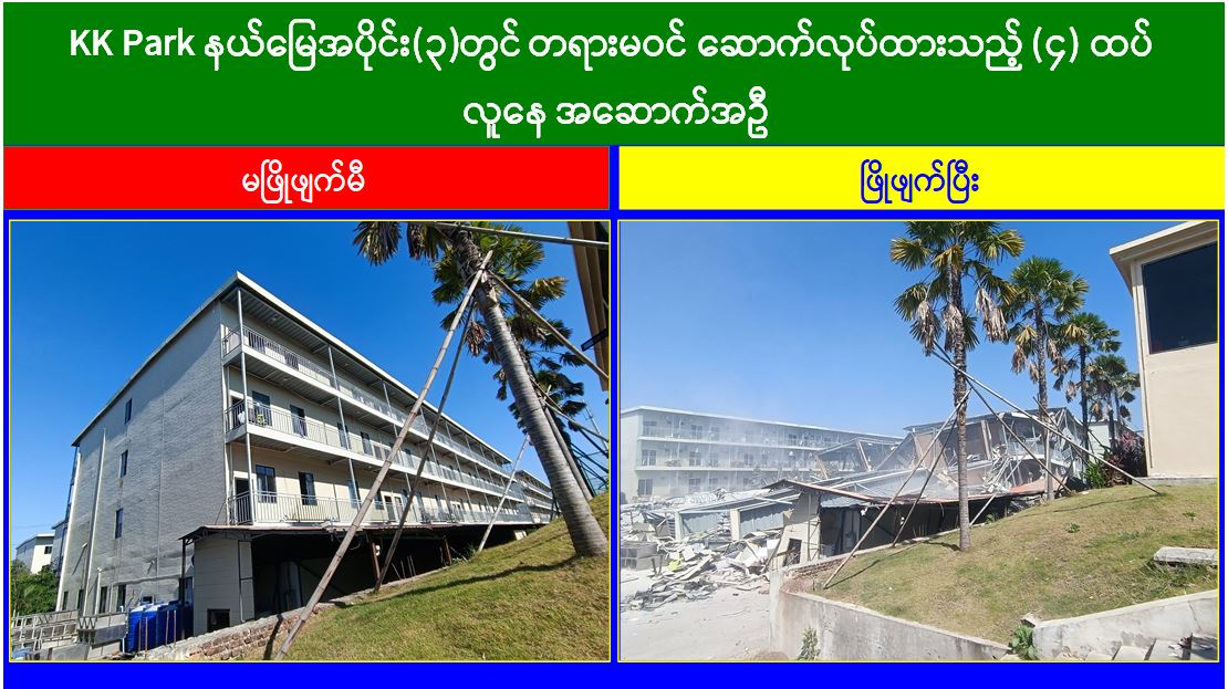 ထိုသို့ဆောင်ရွက်လျက်ရှိရာ ယနေ့တွင် မြဝတီ-မဲထော်သလေး (KK Park) အပိုင်း (၃) နယ်မြေအတွင်းရှိ တရားမဝင်အဆောက်အအုံများဖြစ်သော ၂ ထပ်အဆောက်အအုံ ၃ လုံး၊ ၄ ထပ်အဆောက်အအုံ ၃ လုံး၊ စုစုပေါင်း တရားမဝင်အဆောက်အအုံ ၆ လုံးကို ထပ်မံဖြို ချဖျက်ဆီးခဲ့သဖြင့် အပိုင်း(၃)နယ်မြေအတွင်းရှိ အဆောက်အအုံ ၄၂၅ လုံးအနက် ယနေ့အထိ ၁၂၈ လုံး ဖြိုချဖျက်ဆီးခဲ့ကြောင်းနှင့် KK Park နယ်မြေအတွင်းရှိ တရားမဝင် အဆောက်အအုံ စုစုပေါင်း ၆၃၅ လုံး အနက် ၂၇၆ လုံးကို ဖြိုချဖျက်ဆီးပြီးဖြစ်ကြောင်း သိရှိရသည်။