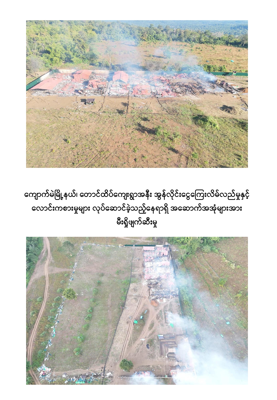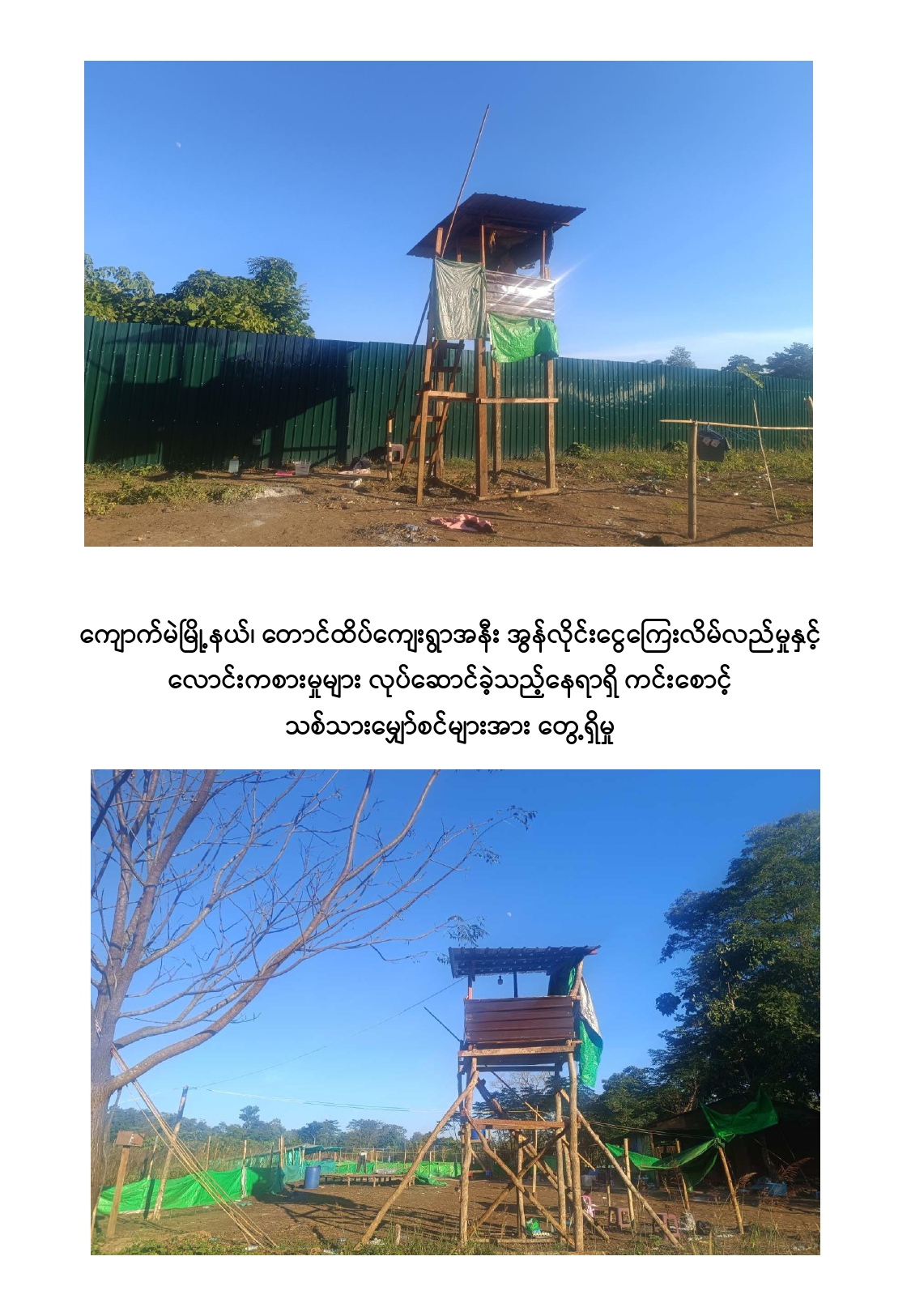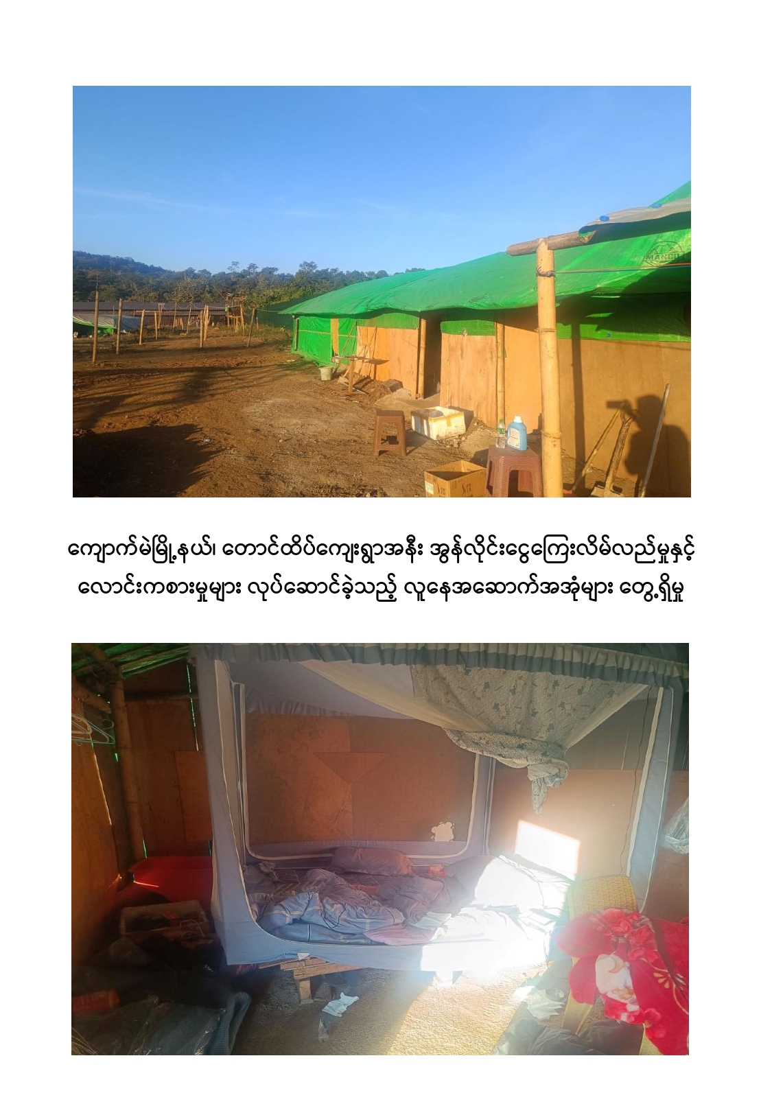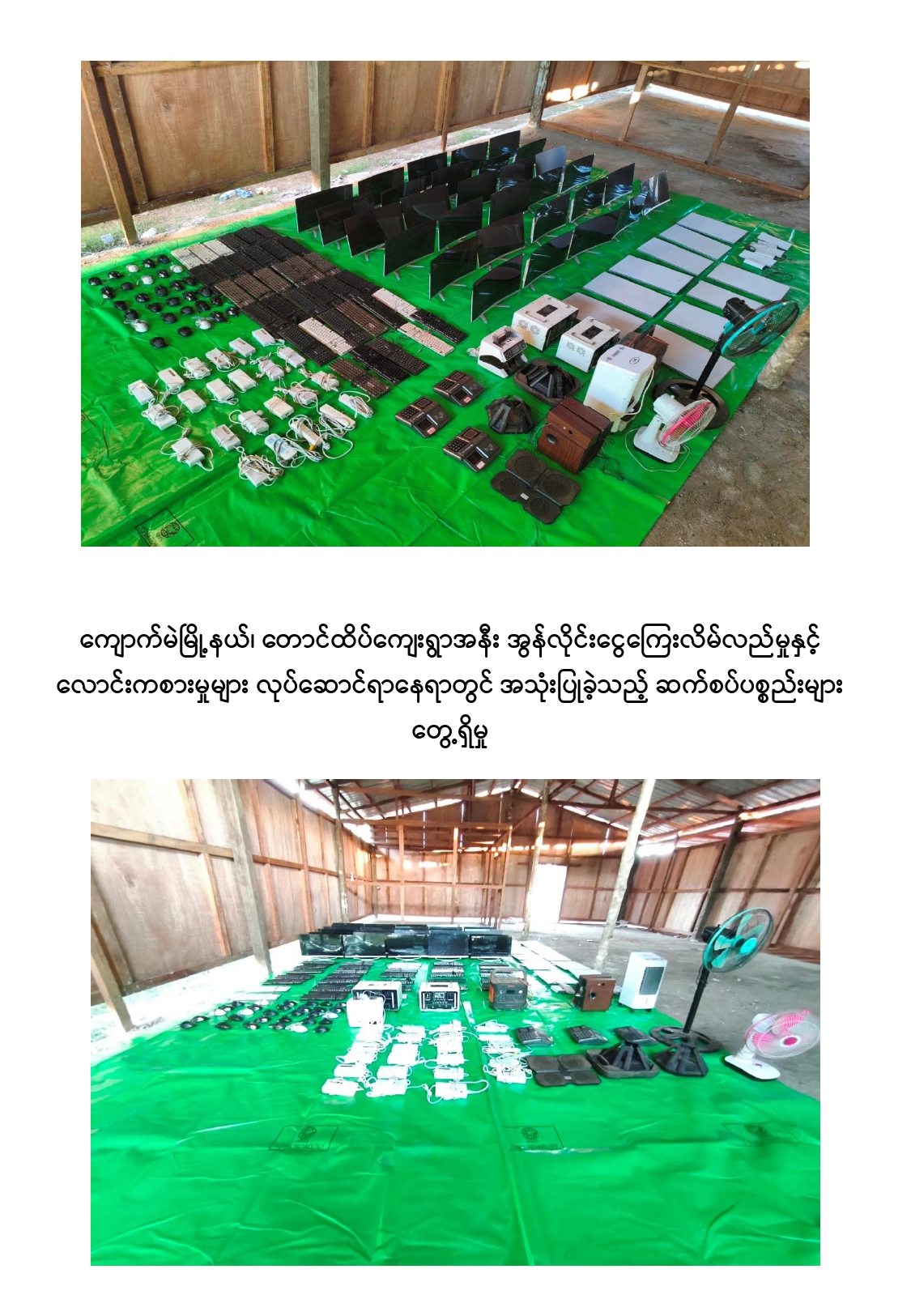 ကျောက်မဲမြို့နယ်အတွင်း နယ်မြေလုံခြုံရေးဆောင်ရွက်နေသည့် လုံခြုံရေးတပ်ဖွဲ့ ဝင်များသည် နိုဝင်ဘာ ၃၀ ရက်တွင် ကျောက်မဲမြို့နယ်၊ တောင်ထိပ်ကျေးရွာ၏ တောင်ဘက် ဒုဋ္ဌဝတီမြစ်အနီးသို့ ရောက်ရှိစဉ် မသင်္ကာဖွယ်ရာ အဆောက်အအုံများကို တွေ့ရှိရသဖြင့် ဝင်ရောက်ရှာဖွေစစ်ဆေးခဲ့ရာ အွန်လိုင်းငွေကြေးလိမ်လည်မှုနှင့် လောင်းကစားမှုများ လုပ်ဆောင်နေသည့်နေရာဖြစ်ကြောင်း တွေ့ရှိရပြီး လုပ်ငန်းလုပ်ကိုင် နေကြသူများအား မတွေ့ ရှိရဘဲ အလျား ၆၀ ပေ၊ အနံ ၃၀ ပေ ရှိ သွပ်မိုး ၃ ထပ်သားကာ အိပ်ဆောင် ၆ လုံး၊ အလျား ၆၀ ပေ၊ အနံ ၃၀ ပေ ရှိ သွပ်မိုး ၃ ထပ်သားကာ လုပ်ငန်းဆောင် ၅ လုံး၊ အလျား ၆၀ ပေ၊ အနံ ၃၀ ပေ ရှိ သွပ်မိုး ၃ ထပ်သားကာ အစားအစာသိုလှောင်ရုံ ၆ လုံး၊ အလျား ၆၀ ပေ၊ အနံ ၃၀ ပေ ရှိ ဆောက်လုပ်ဆဲလုပ်ငန်းဆောင် ၁ လုံး၊ အလျား ၆၀ ပေ၊ အနံ ၃၀ ပေ ရှိ ဆောက်လုပ်ဆဲ အိပ်ဆောင် ၁ လုံး၊ အလျား ၈၀ ပေ၊ အနံ ၁၅ ပေ ရှိ အထွေထွေသုံးအဆောင် ၁ လုံး၊ အလျား ၈၀ ပေ၊ အနံ ၁၀ ပေ ရှိ ၃ထပ်သားကာ တန်းလျားရှည်အိမ်သာ အိမ်သာ ၁ လုံး၊ အလျား ၃၀ ပေ၊ အနံ ၁၀ ပေ ရှိ အိပ်ခန်းတွဲ ၄ ခန်းတွဲအိပ်ဆောင် ၁ လုံး၊ အိပ်ခန်း ၄ ခန်းတွဲ(ရိက္ခာစတိုပါ) နှစ်ထပ်ဆောင် ၁ လုံး၊ မီးစက်အကြီး ၁ လုံး၊ ၁၅ ပေအမြင့် ကင်းစောင့် သစ်သား မျှော်စင် ၅ လုံး၊ အလျား ၂၀ ပေ၊ အနံ ၁၀ ပေ၊ အိပ်ဆောင်တန်းလျား ၁ လုံး၊ အလျား ၇၀၀ ပေ၊ အနံ ၄၀၀ ပေ၊ သွပ်ကာခြံဝန်း ၁ ခု၊ All in one desktop ကွန်ပျူတာ ၃၀ လုံး၊ Star Link ဗန်း ၁၀ ခု၊ Air cooler ၁ လုံး၊ Xiaomi ဝိုင်ဖိုင်စက် ၂ လုံး၊ Sound Box ၁ လုံး၊ Power Station ၃ လုံး၊ ငွေရေတွက်စက် ၁ လုံး၊ ငွေကဒ်ဖြတ်စက် ၃ လုံး၊ ကွန်ပျူတာ ဆက်စပ်ပစ္စည်းများနှင့် အခြားလျှပ်စစ်သုံးပစ္စည်းများ ကို တွေ့ရှိသိမ်းဆည်းရမိခဲ့ကြောင်း သိရှိရသည်။