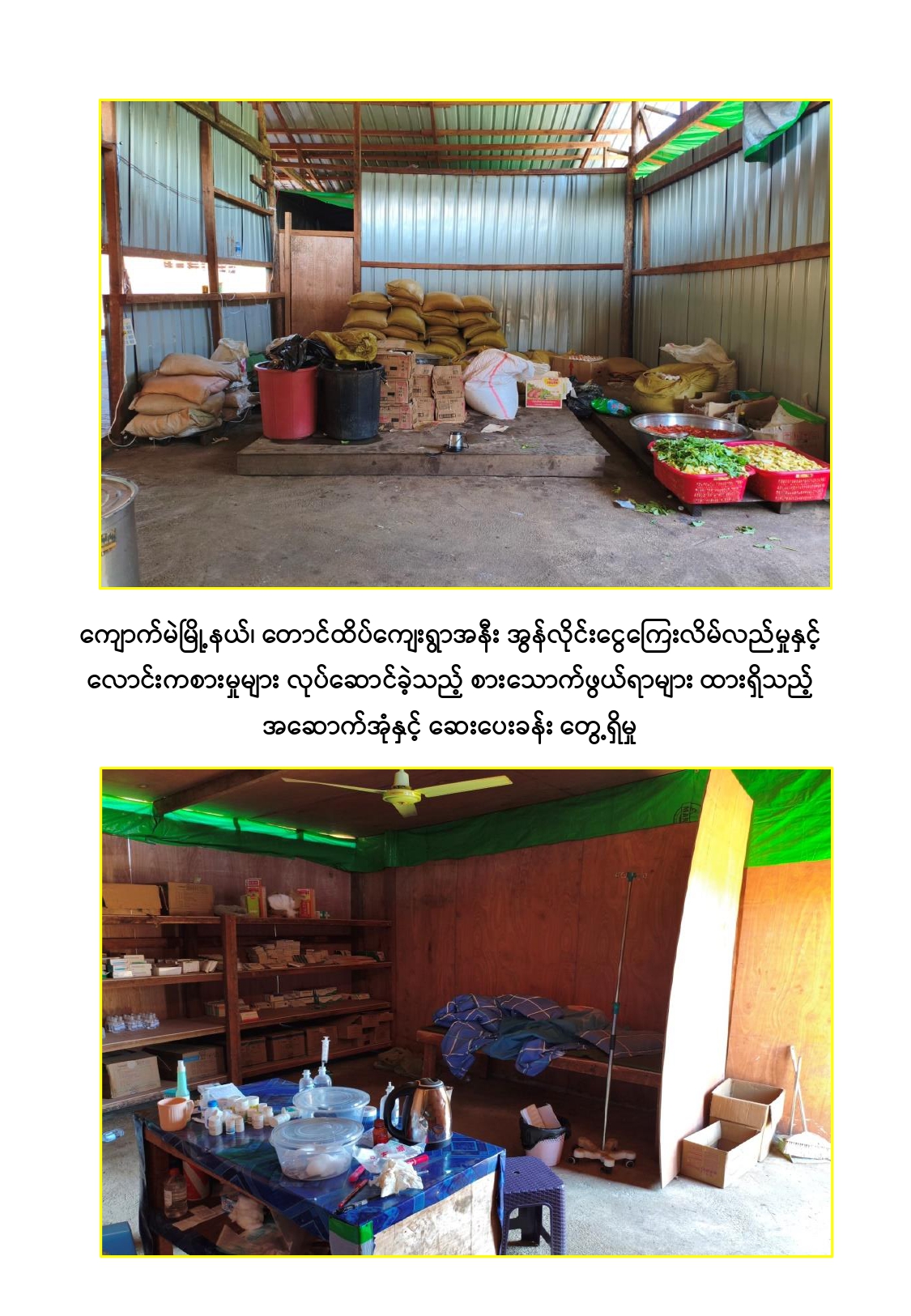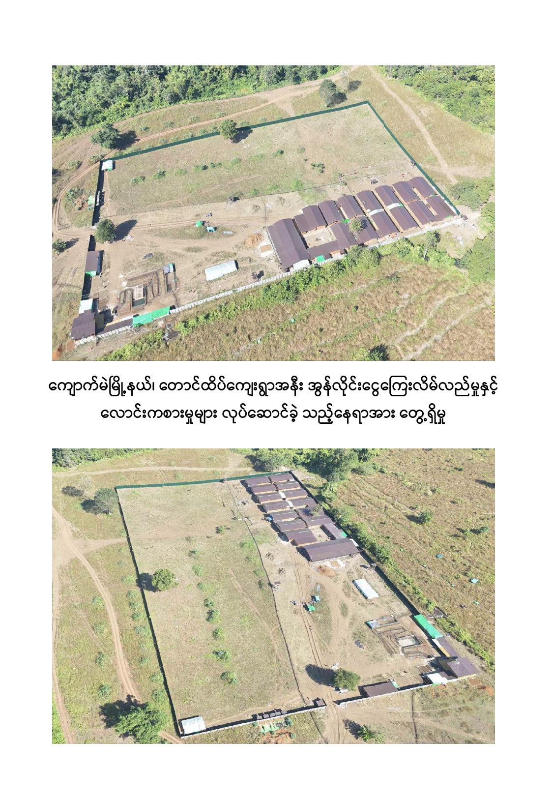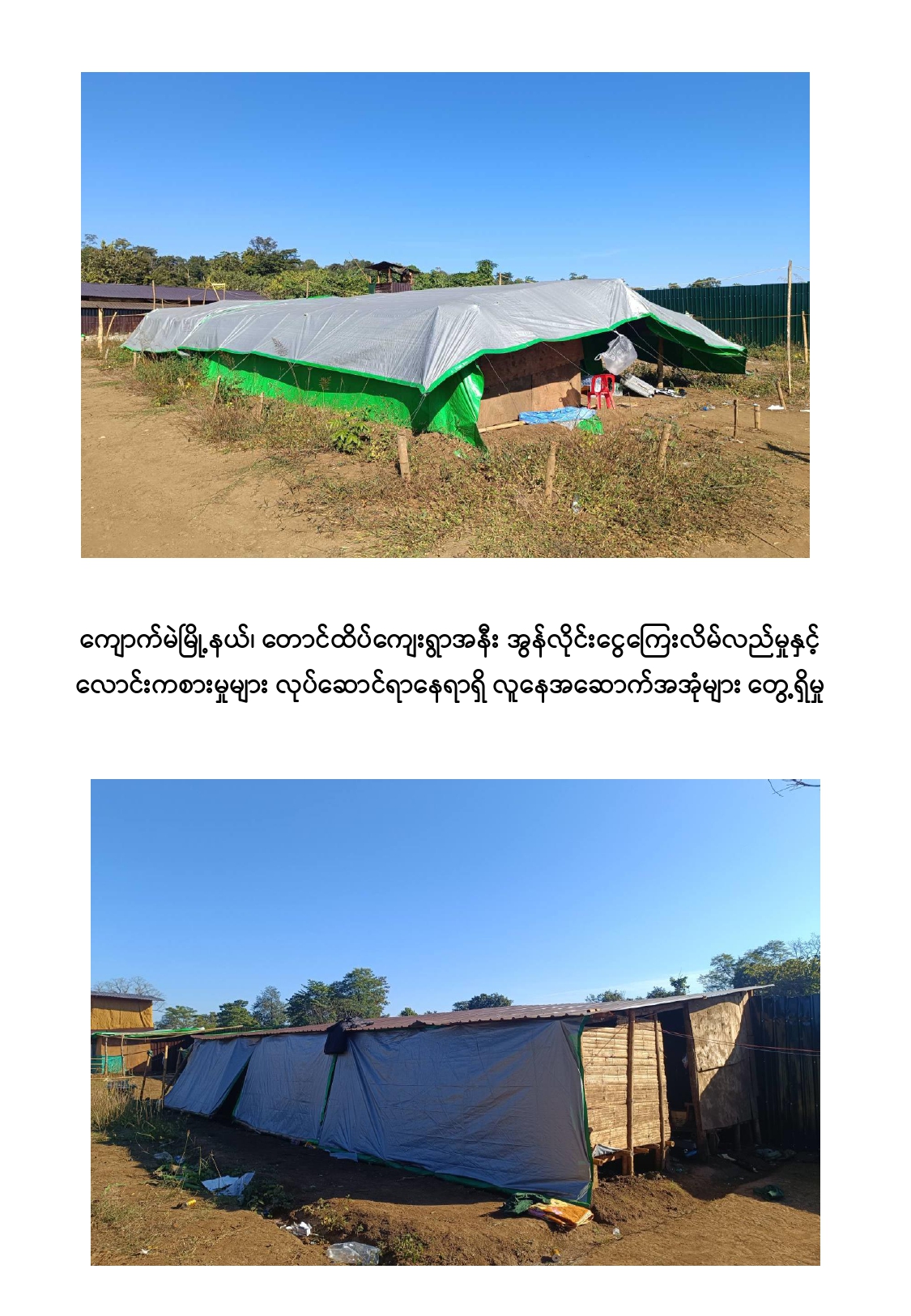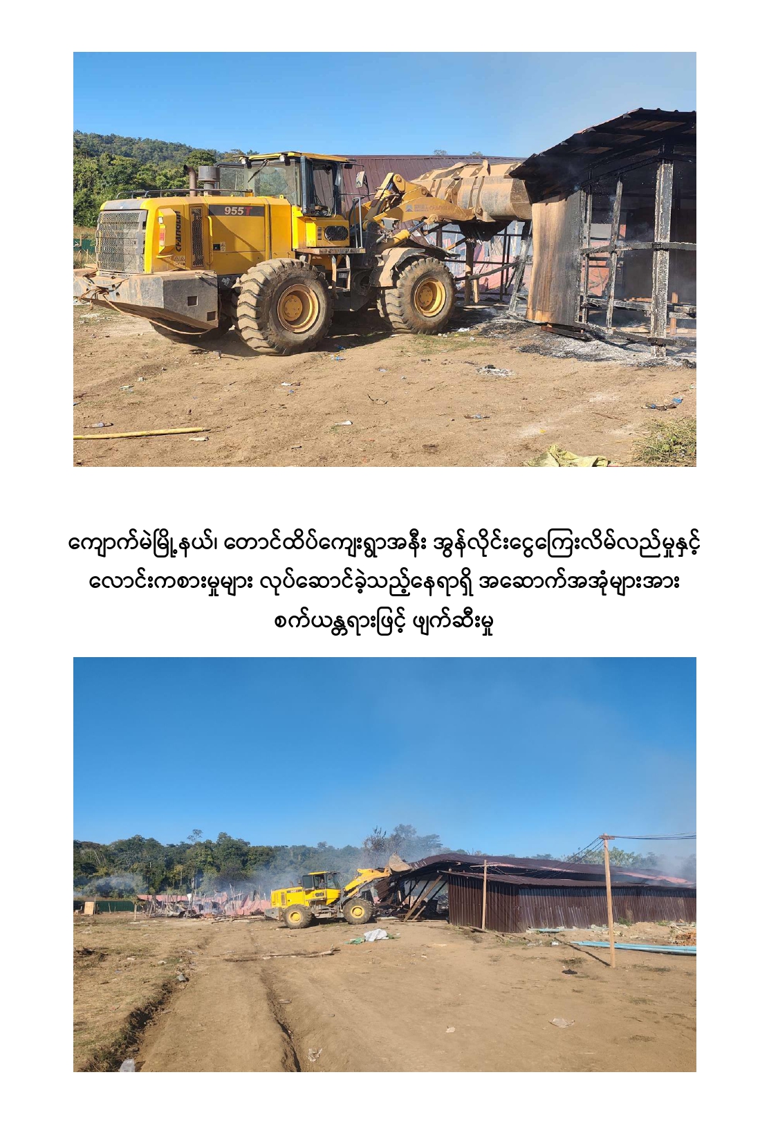 ကျောက်မဲမြို့နယ်အတွင်း နယ်မြေလုံခြုံရေးဆောင်ရွက်နေသည့် လုံခြုံရေးတပ်ဖွဲ့ ဝင်များသည် နိုဝင်ဘာ ၃၀ ရက်တွင် ကျောက်မဲမြို့နယ်၊ တောင်ထိပ်ကျေးရွာ၏ တောင်ဘက် ဒုဋ္ဌဝတီမြစ်အနီးသို့ ရောက်ရှိစဉ် မသင်္ကာဖွယ်ရာ အဆောက်အအုံများကို တွေ့ရှိရသဖြင့် ဝင်ရောက်ရှာဖွေစစ်ဆေးခဲ့ရာ အွန်လိုင်းငွေကြေးလိမ်လည်မှုနှင့် လောင်းကစားမှုများ လုပ်ဆောင်နေသည့်နေရာဖြစ်ကြောင်း တွေ့ရှိရပြီး လုပ်ငန်းလုပ်ကိုင် နေကြသူများအား မတွေ့ ရှိရဘဲ အလျား ၆၀ ပေ၊ အနံ ၃၀ ပေ ရှိ သွပ်မိုး ၃ ထပ်သားကာ အိပ်ဆောင် ၆ လုံး၊ အလျား ၆၀ ပေ၊ အနံ ၃၀ ပေ ရှိ သွပ်မိုး ၃ ထပ်သားကာ လုပ်ငန်းဆောင် ၅ လုံး၊ အလျား ၆၀ ပေ၊ အနံ ၃၀ ပေ ရှိ သွပ်မိုး ၃ ထပ်သားကာ အစားအစာသိုလှောင်ရုံ ၆ လုံး၊ အလျား ၆၀ ပေ၊ အနံ ၃၀ ပေ ရှိ ဆောက်လုပ်ဆဲလုပ်ငန်းဆောင် ၁ လုံး၊ အလျား ၆၀ ပေ၊ အနံ ၃၀ ပေ ရှိ ဆောက်လုပ်ဆဲ အိပ်ဆောင် ၁ လုံး၊ အလျား ၈၀ ပေ၊ အနံ ၁၅ ပေ ရှိ အထွေထွေသုံးအဆောင် ၁ လုံး၊ အလျား ၈၀ ပေ၊ အနံ ၁၀ ပေ ရှိ ၃ထပ်သားကာ တန်းလျားရှည်အိမ်သာ အိမ်သာ ၁ လုံး၊ အလျား ၃၀ ပေ၊ အနံ ၁၀ ပေ ရှိ အိပ်ခန်းတွဲ ၄ ခန်းတွဲအိပ်ဆောင် ၁ လုံး၊ အိပ်ခန်း ၄ ခန်းတွဲ(ရိက္ခာစတိုပါ) နှစ်ထပ်ဆောင် ၁ လုံး၊ မီးစက်အကြီး ၁ လုံး၊ ၁၅ ပေအမြင့် ကင်းစောင့် သစ်သား မျှော်စင် ၅ လုံး၊ အလျား ၂၀ ပေ၊ အနံ ၁၀ ပေ၊ အိပ်ဆောင်တန်းလျား ၁ လုံး၊ အလျား ၇၀၀ ပေ၊ အနံ ၄၀၀ ပေ၊ သွပ်ကာခြံဝန်း ၁ ခု၊ All in one desktop ကွန်ပျူတာ ၃၀ လုံး၊ Star Link ဗန်း ၁၀ ခု၊ Air cooler ၁ လုံး၊ Xiaomi ဝိုင်ဖိုင်စက် ၂ လုံး၊ Sound Box ၁ လုံး၊ Power Station ၃ လုံး၊ ငွေရေတွက်စက် ၁ လုံး၊ ငွေကဒ်ဖြတ်စက် ၃ လုံး၊ ကွန်ပျူတာ ဆက်စပ်ပစ္စည်းများနှင့် အခြားလျှပ်စစ်သုံးပစ္စည်းများ ကို တွေ့ရှိသိမ်းဆည်းရမိခဲ့ကြောင်း သိရှိရသည်။