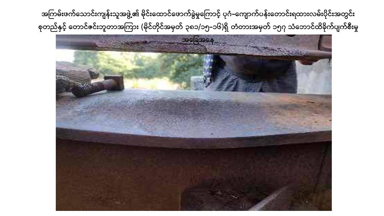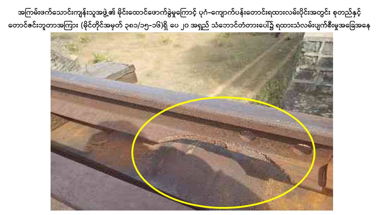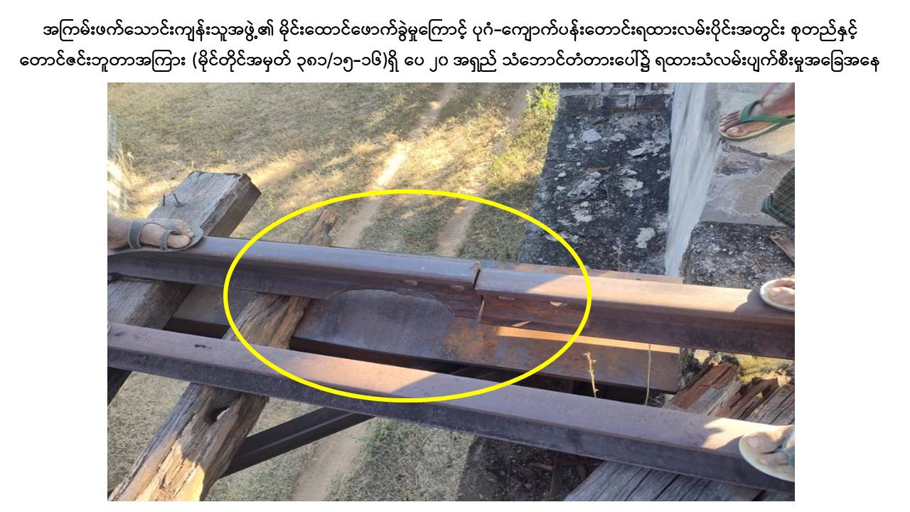 မကွေးတိုင်းဒေသကြီး၊ ညောင်ဦးမြို့နယ်၊ ပုဂံ-ကျောက်ပန်းတောင်းလမ်းပိုင်းအတွင်း စုတည်ဘူတာနှင့် တောင်ဇင်းဘူတာအကြား သံလမ်းပြေးယာဉ် RGC 103 ဖြင့် ရထားလမ်းပိုင်း အား ယနေ့နံနက် ၈ နာရီ ၅၀ မိနစ်ခန့်တွင် သွားရောက်စစ်ဆေးစဉ် မိုင်တိုင် ၃၈၁/၁၅-၁၆ ကြား ပေ ၂၀ အရှည်ရှိ သံဘောင်တံတားအမှတ် ၁၅၇ အနီးတွင် အကြမ်းဖက်သောင်းကျန်းသူအဖွဲ့က မိုင်းထောင်ဖောက်ခွဲဖျက်ဆီးခဲ့သဖြင့် ရထားသံလမ်းအရှေ့ဘက်ခြမ်း သံလမ်းဖိနပ် ၁ ပေခန့် ပဲ့ထွက်ပျက်စီးခြင်းနှင့် ဇလီဖား(၃)တုံး ကျိုးပဲ့နေကြောင်းတွေ့ရှိရသဖြင့် စုတည်-တောင်ဇင်း ရထားလမ်းပိုင်းအား နံနက် ၁၀ နာရီ ၁၆ မိနစ်ခန့်တွင် ယာယီပိတ်ထားခဲ့ကြောင်း သိရှိရသည်။