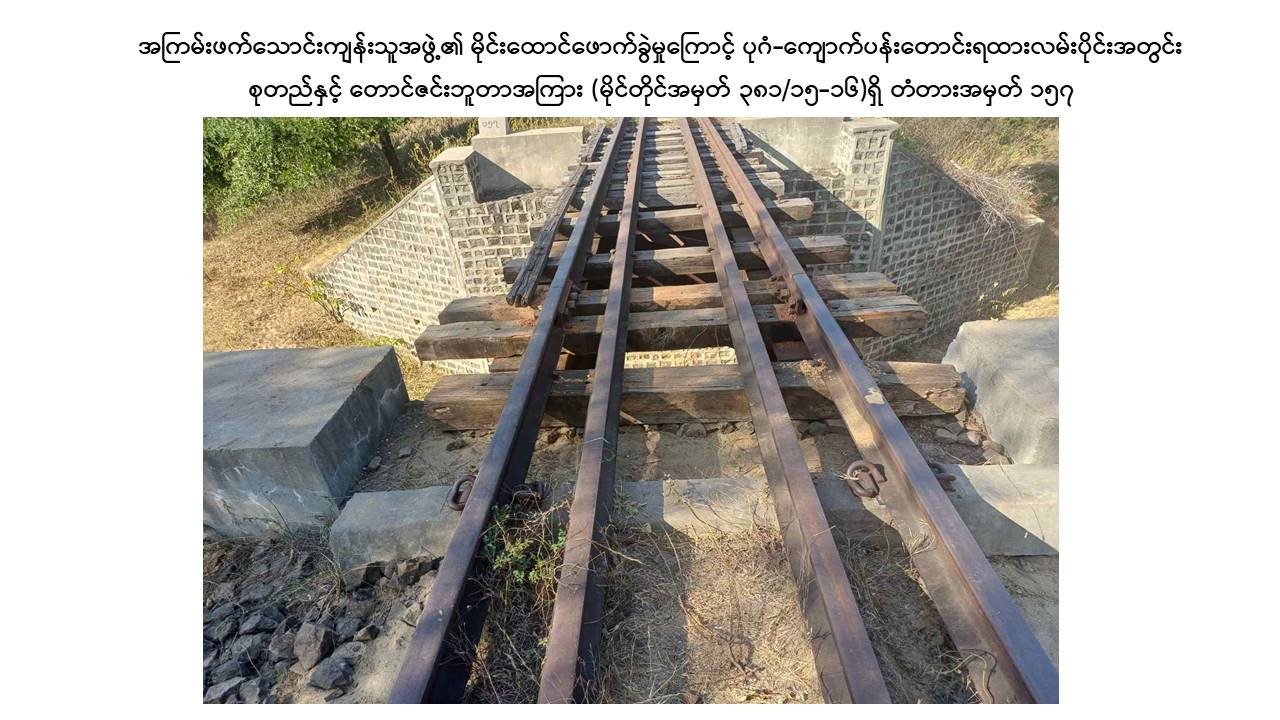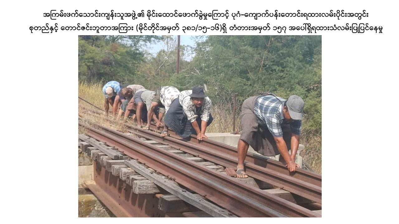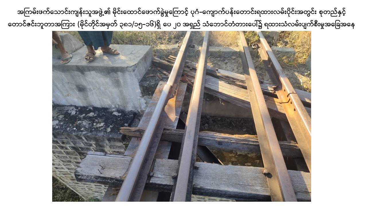 အကြမ်းဖက်သောင်းကျန်းသူအဖွဲ့များအနေဖြင့် ၂၀၂၁ ခုနှစ်၊ ဖေဖော်ဝါရီလမှစ၍ ယခု အချိန်အထိ မြန်မာ့မီးရထားလမ်းကွန်ရက်တစ်ခုလုံးတွင် ရထားလမ်းနှင့် ရထားဘူတာ နယ်မြေ အတွင်း မိုင်းထောင်ဖောက်ခွဲဖျက်ဆီးခြင်း(၈၃)ကြိမ်၊ ရထားတံတား/သံလမ်းများအား မိုင်းထောင် ဖောက်ခွဲ ဖျက်ဆီးခြင်း(၁၇၉)ကြိမ်၊ ဘူတာအဆောက်အဦနှင့် ဝန်ထမ်းနေအိမ်များအား မီးရှို့ ဖျက်ဆီးခြင်း(၁၆)ကြိမ် ကျူးလွန်ခဲ့ကြပြီး နိုင်ငံတော်ပိုင်ရထားစက်ခေါင်းနှင့် တွဲများ၊ ရထားလမ်း နှင့် တံတားများ၊ ခရီးသည်များနှင့် ကုန်စည်များ ထိခိုက်ပျက်စီးဆုံးရှုံးစေရေး၊ ရထားစီး ခရီးသွား ပြည်သူများအနေဖြင့် ရထားဖြင့်ခရီးသွားလာရာတွင် ကိုယ်စိတ်နှလုံးချမ်းမြေ့ပြီး အသက် အန္တရာယ်ကင်းရှင်းစွာဖြင့် လုံခြုံစိတ်ချစွာ သွားလာနိုင်မှုမရှိစေရေးအတွက် ရည်ရွယ်ပြီး ယခုကဲ့ သို့ အကြိမ်ကြိမ်ကျူးလွန်ဖျက်ဆီးနေကြခြင်းဖြစ်သော်လည်း နိုင်ငံတော်အစိုးရအနေဖြင့် အများ ပြည်သူခရီးသွားလာမှုနှင့် ကုန်စည်ပို့ဆောင်မှု အဆင်ပြေချောမွေ့မြန်ဆန်စေရေးအတွက် ရထား လမ်းနှင့်အခြေခံအဆောက်အဦများ ပိုမိုတိုးတက်ကောင်းမွန်လာစေရေးနှင့် ရထားပို့ဆောင်ရေး စနစ် အဆင့်မြှင့်တင်ရေးစီမံကိန်းလုပ်ငန်းများကို ရည်မှန်းချက်ထားရှိ၍ အစဉ်တစိုက်အလေး ထား စီမံဆောင်ရွက်ပေးလျက်ရှိကြောင်း သတင်းရရှိသည်။