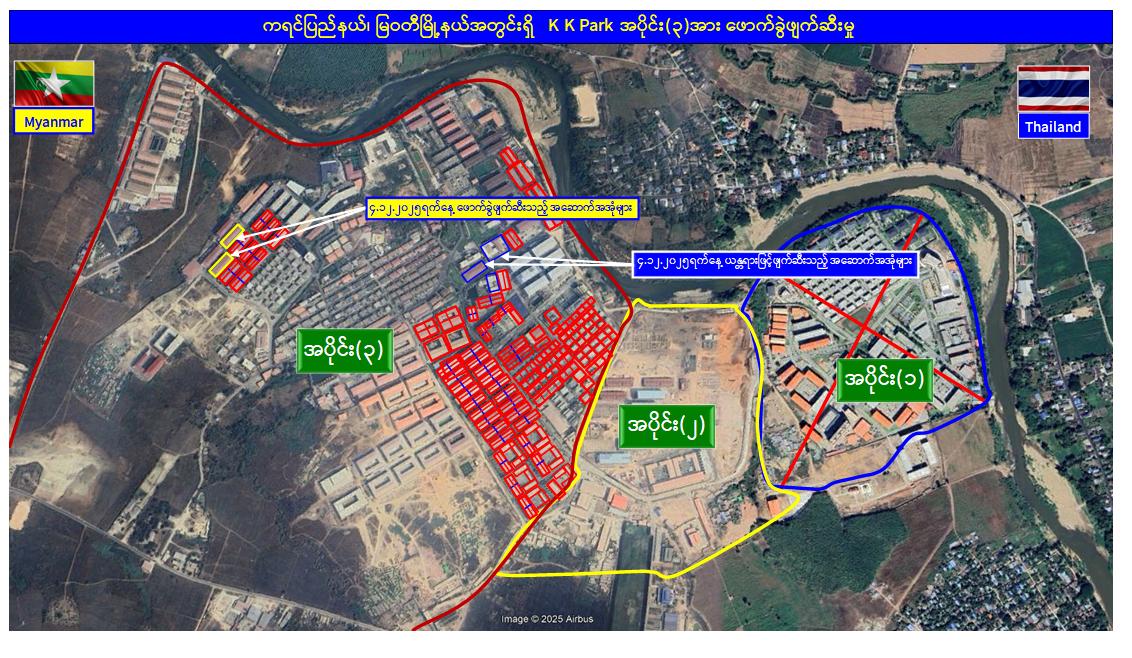 ယနေ့တွင် မြဝတီ-မဲထော်သလေး (KK Park) အပိုင်း (၃) နယ်မြေအတွင်းရှိ တရား မဝင်အဆောက်အအုံများဖြစ်သော ၂ ထပ်အဆောက်အအုံ ၁ လုံး၊ ၃ ထပ်အဆောက်အအုံ ၂ လုံး၊ ၄ ထပ်အဆောက်အအုံ ၁ လုံး၊ စုစုပေါင်း တရားမဝင်အဆောက်အအုံ ၄ လုံးကို ထပ်မံဖြို ချဖျက်ဆီးခဲ့သဖြင့် အပိုင်း(၃)နယ်မြေအတွင်းရှိ အဆောက်အအုံ ၄၂၅ လုံးအနက် ယနေ့အထိ ၁၄၉ လုံး ဖြိုချဖျက်ဆီးခဲ့ကြောင်းနှင့် KK Park နယ်မြေအတွင်းရှိ တရားမဝင် အဆောက်အအုံ စုစုပေါင်း ၆၃၅ လုံးအနက် ၂၉၇ လုံးကို ဖြိုချဖျက်ဆီးပြီးဖြစ်ကြောင်း သိရှိရသည်။