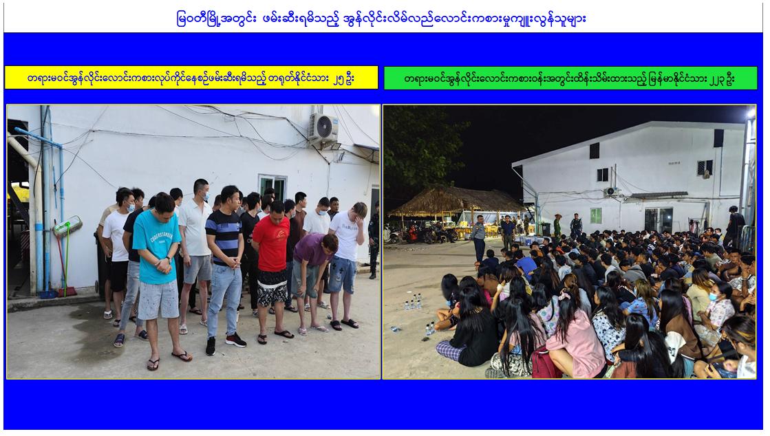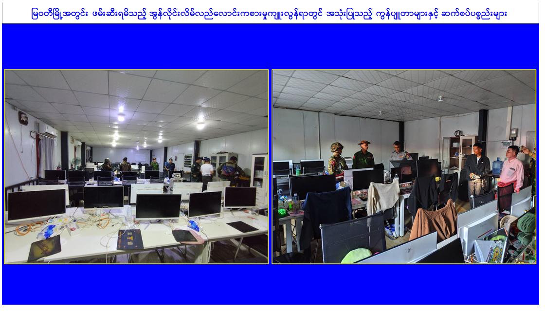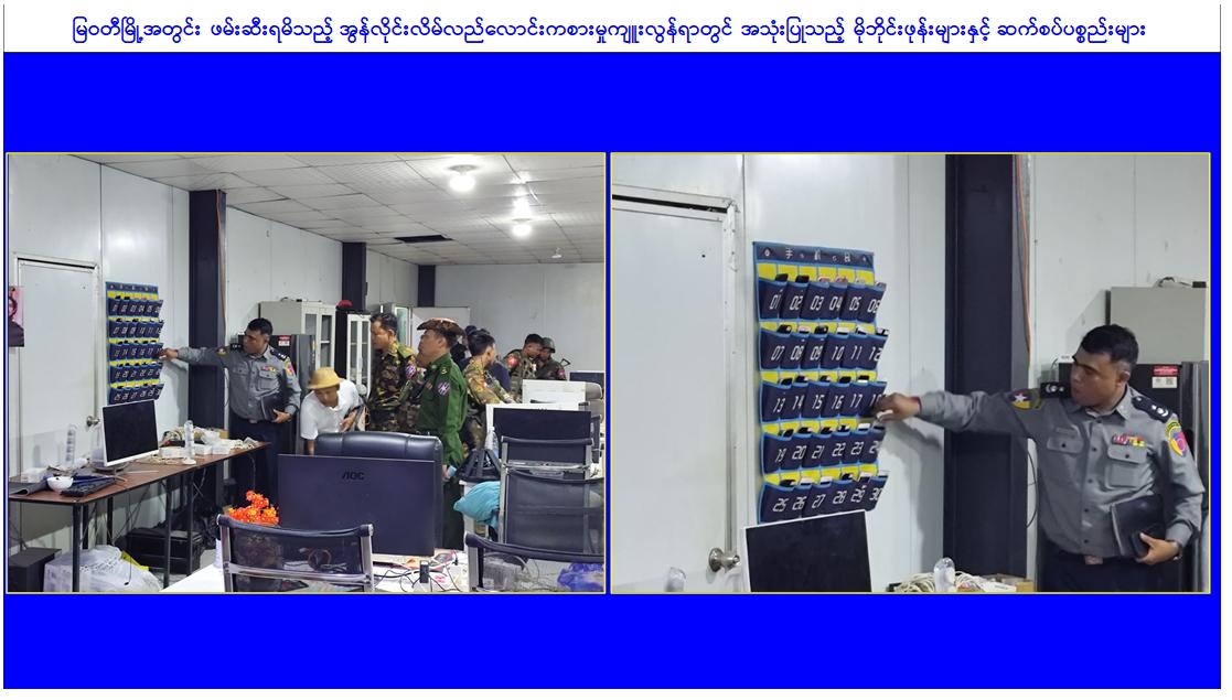အွန်လိုင်းလောင်းကစားမှုများ၊ အွန်လိုင်းလိမ်လည်မှုများ အပါအဝင် ဒုစရိုက်မှုများ ကျူးလွန်ခဲ့ကြသူများအား အင်တိုက်အားတိုက်ဖြင့် ကျယ်ကျယ်ပြန့်ပြန့်ရှာဖွေဖမ်းဆီး အရေး ယူခြင်းများ ဆောင်ရွက်လျက်ရှိရာ ယနေ့တွင် မြဝတီမြို့ရှိ လုံခြုံရေးပူးပေါင်းအဖွဲ့များ က သတင်းအရ မြဝတီမြို့ဝန်းကျင်တွင် ရှောင်တခင်စစ်ဆေးခြင်းများ ဆောင်ရွက်ခဲ့ရာ အမှတ်(၃) ရပ်ကွက်တွင် တရားမဝင် အွန်လိုင်းလောင်းကစားမှုများ၊ အွန်လိုင်းလိမ်လည် မှုများကျူး လွန်လျက်ရှိကြသည့် တရုတ်နိုင်ငံသား ၂၅ ဦး၊ မြန်မာနိုင်ငံသား ၂၂၃ ဦး စုစုပေါင်း ၂၄၈ ဦးအား တရားမဝင်အွန်လိုင်းလောင်းကစားနှင့် ငွေကြေးလိမ်လည်မှုများတွင် အသုံးပြု သည့် ကွန်ပျူတာမျိုးစုံ ၈၂ လုံး၊ မိုဘိုင်းဖုန်း ၉၂ လုံးနှင့် ဆက်စပ်ပစ္စည်းများနှင့် အတူဖမ်းဆီးရမိခဲ့ပြီး အဆိုပါဖမ်းဆီးရမိသူများအား ဉပဒေလုပ်ထုံး လုပ်နည်းများနှင့်အညီ စနစ်တကျ အရေးယူဆောင်ရွက်သွားမည်ဖြစ်သည်။ ထို့ပြင် အွန်လိုင်းလိမ်လည်မှုနှင့် လောင်းကစားမှုလုပ်ငန်းများ နေထိုင်လုပ်ကိုင်ခဲ့ကြသည့် ၃ ထပ် အဆောက်အအုံ ၅ လုံး၊ ၁ ထပ် အဆောက်အအုံ ၃ လုံး၊ စုစုပေါင်း ၈ လုံးတို့အား စစ်ဆေးတွေ့ရှိခဲ့ရပြီး ပြန်လည် အသုံးချမှုမရှိစေရေးအတွက် ၃ ထပ်အဆောက်အအုံ ၁ လုံးကို ယနေ့တွင် စတင်၍ စနစ်တကျဖြိုချဖျက်ဆီးခဲ့ကြောင်း သိရှိရသည်။