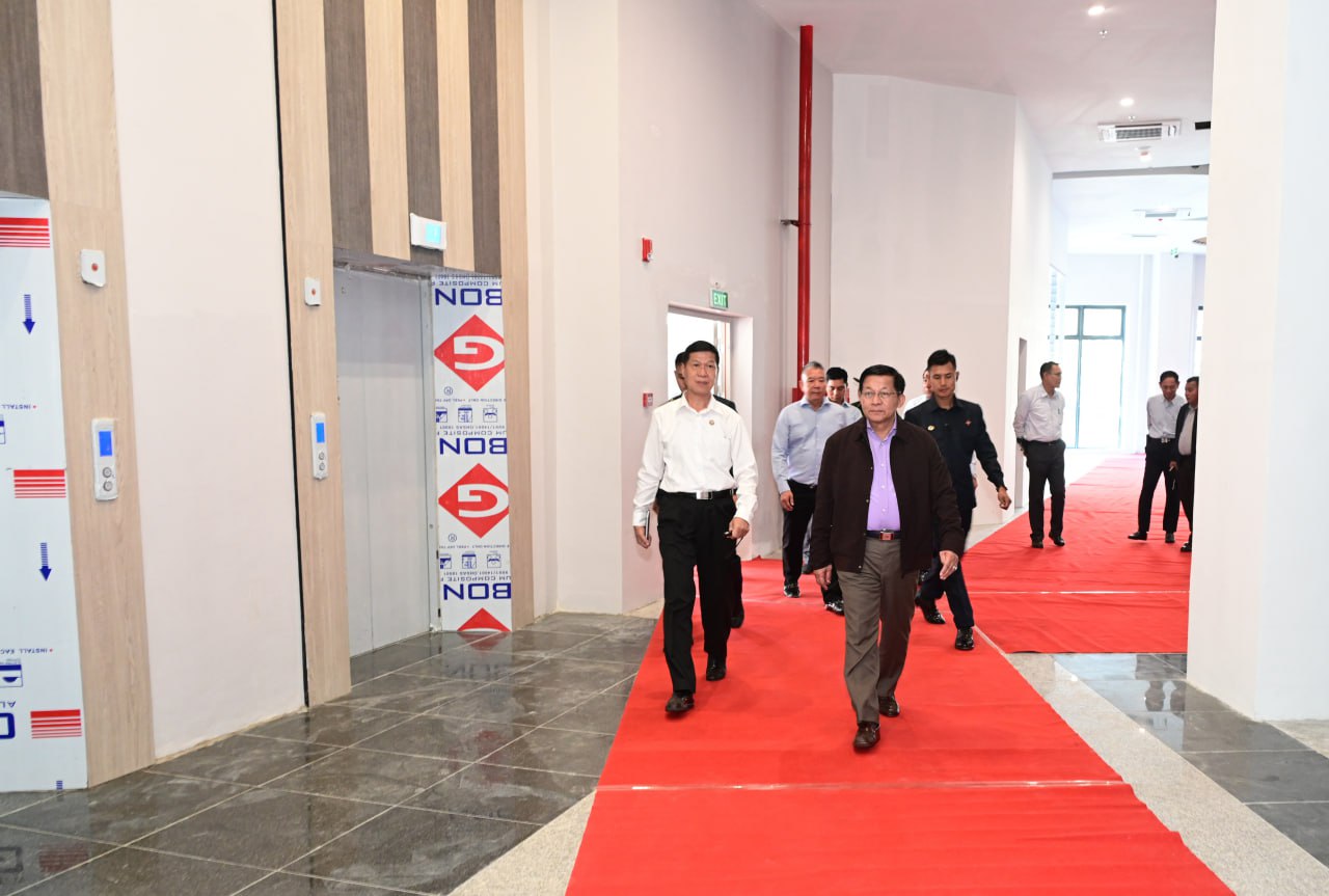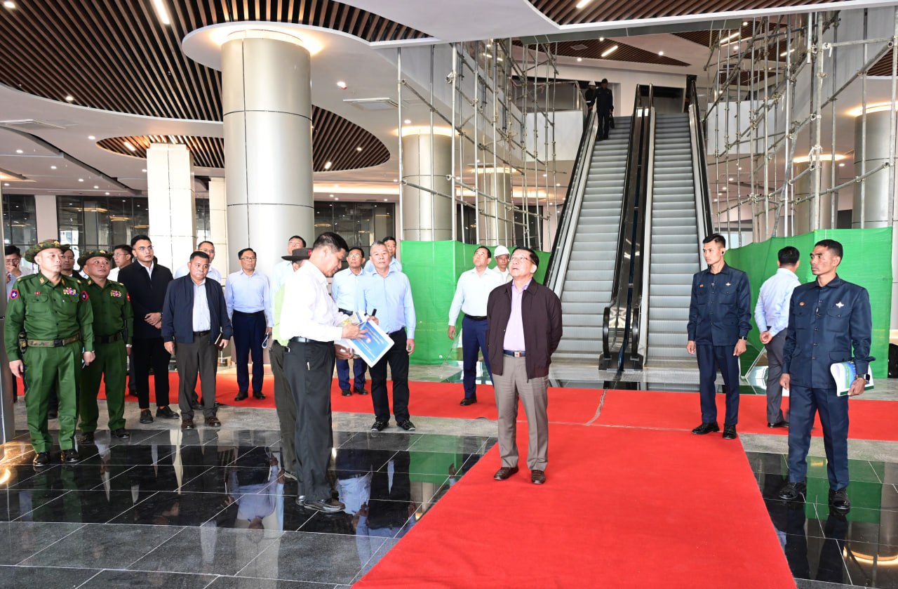 ထို့နောက် နိုင်ငံတော်ယာယီသမ္မတ နိုင်ငံတော်လုံခြုံရေးနှင့် အေးချမ်းသာယာရေး ကော်မရှင် ဥက္ကဋ္ဌ နှင့် အဖွဲ့ဝင်များသည် ပြင်ဦးလွင်မြို့၊ သုမင်္ဂလာဈေး(ညံတောဈေး) အဆင့်မြင့်ဈေးသစ်တည်ဆောက်ရေးစီမံကိန်းသို့ သွားရောက်ကြည့်ရှုစစ်ဆေးရာ မန္တလေး တိုင်းဒေသကြီး ဝန်ကြီးချုပ် ဦးမျိုးအောင်က အဆင့်မြင့်ဈေးသစ် တည်ဆောက်ရေး စီမံကိန်းလုပ်ငန်းအဆင့်ဆင့်အလိုက် ဆောင်ရွက်ပြီးစီးမှုနှင့် ဆက်လက် ဆောင်ရွက်လျက် ရှိမှု၊ အထပ်အလိုက်ဆိုင်ခန်းများဖွင့်လှစ်နိုင်ရေး လျာထားဆောင်ရွက် လျက်ရှိမှု၊ မြန်မာ ပြည်တွင်အကြီးဆုံး Curved LED Display နှင့် အဆောက်အဦ မျက်နှာစာများ လုပ်ငန်း ဆောင်ရွက်ပြီးစီးမှု၊ အလှမီးဆိုင်းများ ထည့်သွင်းထားရှိမှု၊ ယာဉ်ရပ်နားသည့်နေရာများ ဆောင်ရွက်ထားရှိမှု၊ Solar System ဖြင့် စီမံကိန်းတစ်ခုလုံး၏ လျှပ်စစ် ဓာတ်အားလိုအပ် ချက်ကို Air Condition System မှလွဲ၍ ကျန်လျှပ်စစ်ဓာတ်အားလိုအပ်ချက်အား ၆ နာရီကြာ ပံ့ပိုးပေးနိုင်အောင် ထည့်သွင်းဆောင်ရွက်ထားရှိမှု၊ ရေဝင်ရေထွက်ကောင်းမွန် စေရေးနှင့် ရေဆိုးစွန့်ထုတ်မှုတို့အတွက် တွက်ချက်ဆောင်ရွက်ထားရှိမှုနှင့် စီမံကိန်းအား သတ်မှတ်ကာလအတွင်းပြီးစီးနိုင်ရေးနှင့် ဆောက်လုပ်မှု စံချိန်စံညွှန်းများနှင့် ကိုက်ညီမှု ရှိစေရေး ကြပ်မတ်ဆောင်ရွက်လျက်ရှိမှုတို့နှင့်ပတ်သက်၍ ရှင်းလင်းတင်ပြသည်။