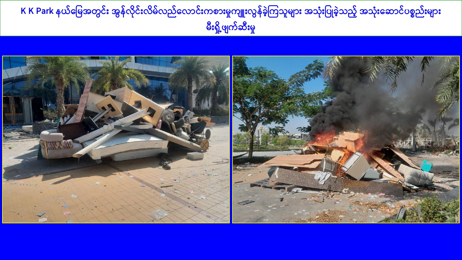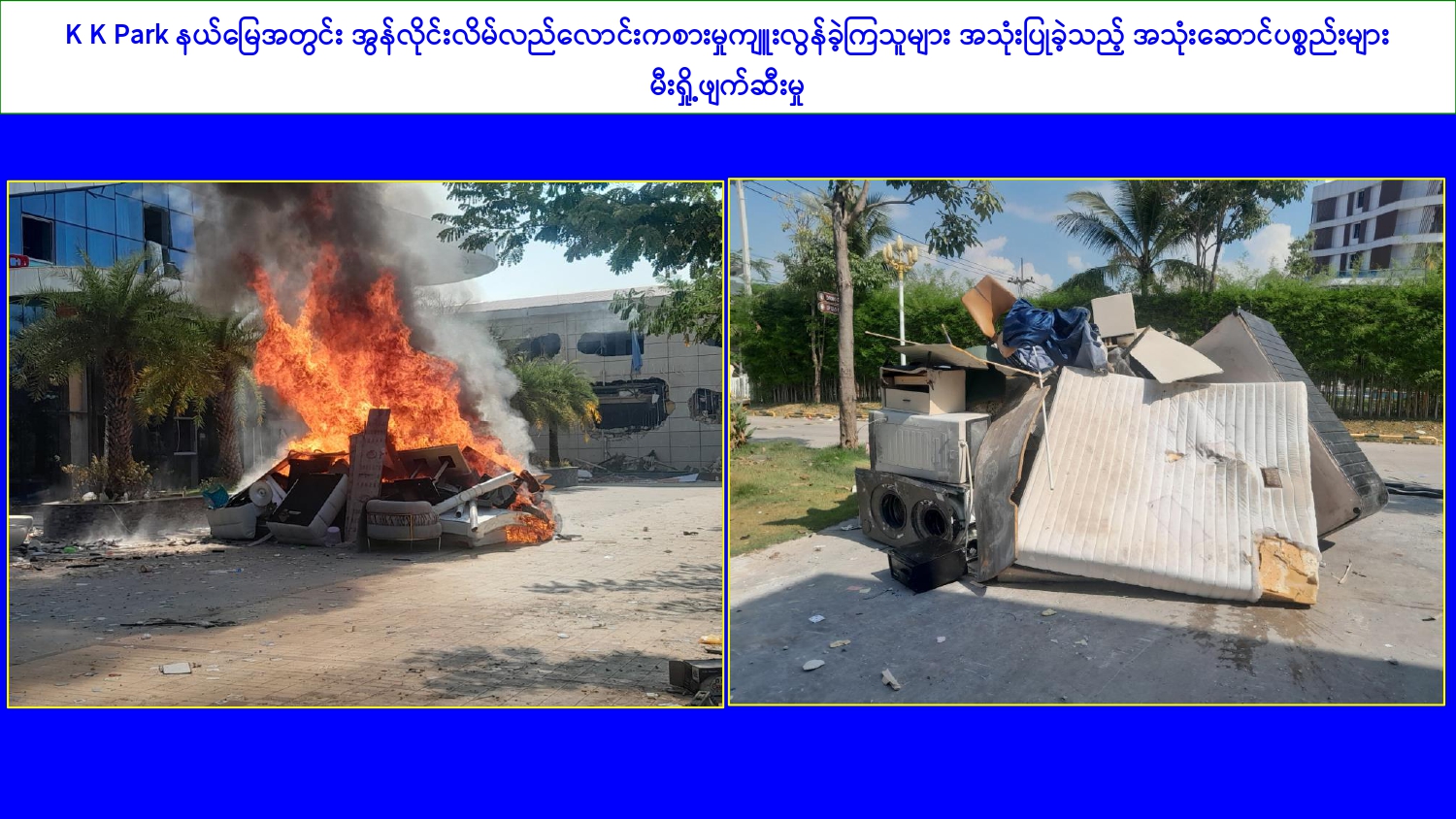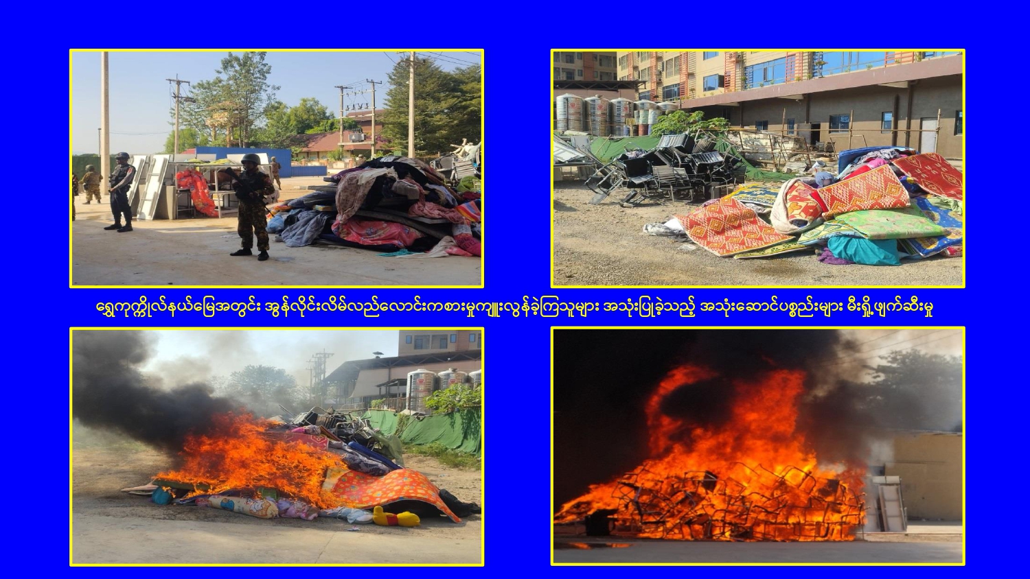 ၎င်းအပြင် မြဝတီမြို့နယ်အတွင်းရှိ KK Park နယ်မြေနှင့် ရွှေကုက္ကိုလ်နယ်မြေတို့၌ အွန်လိုင်းလိမ်လည်လောင်းကစားမှုကျူးလွန်ရာတွင် အသုံးပြုသည့်ပစ္စည်းများအား ထပ်မံ ၍ အသုံးပြုနိုင်ခြင်းမရှိစေရန်အတွက်ယနေ့တွင်လည်း စနစ်တကျ မီးရှို့ဖျက်ဆီးခဲ့ကြောင်း သိရှိရသည်။
