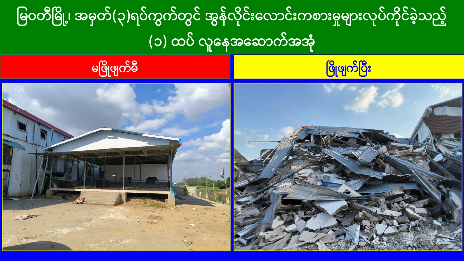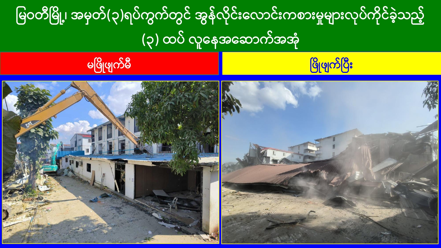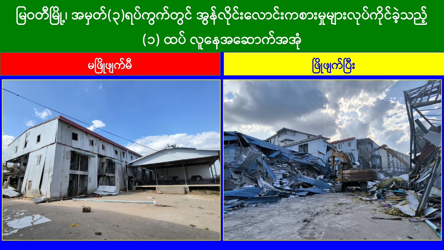 အွန်လိုင်းလောင်းကစားမှုများ၊ အွန်လိုင်းလိမ်လည်မှုများ အပါအဝင် ဒုစရိုက်မှုများ ကျူးလွန်ခဲ့ကြသူများအား အင်တိုက်အားတိုက်ဖြင့် ကျယ်ကျယ်ပြန့်ပြန့်ရှာဖွေဖမ်းဆီး အရေး ယူခြင်းများ ဆောင်ရွက်လျက်ရှိရာ ယနေ့တွင် မြဝတီမြို့ရှိ လုံခြုံရေးပူးပေါင်းအဖွဲ့များ က သတင်းအရ မြဝတီမြို့ဝန်းကျင်တွင် ရှောင်တခင်စစ်ဆေးခြင်းများ ဆောင်ရွက်ခဲ့ရာ မဲ့ထော် သလေးကျေးရွာအနီးတွင် တရားမဝင်အွန်လိုင်းလောင်းကစားမှုများ၊ အွန်လိုင်း လိမ်လည် မှုများ ကျူးလွန်ခဲ့ကြသည့် တရုတ်နိုင်ငံသား ၉၆ ဦးတို့အား ဖော်ထုတ် ဖမ်းဆီးရမိခဲ့သည်။ ထို့ပြင် မြဝတီမြို့၊ အမှတ်(၃)ရပ်ကွက်အတွင်းရှိ အွန်လိုင်းလိမ်လည်မှုနှင့် လောင်းကစား လုပ်ငန်းများလုပ်ကိုင်ရာတွင် အသုံးပြုနေထိုင်လုပ်ကိုင်ခဲ့ကြသည့် ၃ ထပ် အဆောက်အအုံ ၅ လုံး၊ ၁ ထပ် အဆောက်အအုံ ၃ လုံး၊ စုစုပေါင်း ၈ လုံး တို့အား စစ်ဆေးတွေ့ရှိခဲ့ရပြီး ၎င်းတို့အား ပြန်လည်အသုံးချမှုမရှိစေရေးအတွက် ဖြိုချဖျက်ဆီးခြင်းများကို ဆောင်ရွက် ခဲ့ရာ ယနေ့တွင်လည်း ၃ ထပ်အဆောက်အအုံ ၁ လုံး၊ ၁ ထပ်အဆောက်အအုံ ၂ လုံးကို ထပ်မံဖြိုချဖျက်ဆီးနိုင်ခဲ့သဖြင့် စုစုပေါင်း ၅ လုံး ဖြိုချဖျက်ဆီးပြီးဖြစ်ကြောင်း သိရှိရသည်။