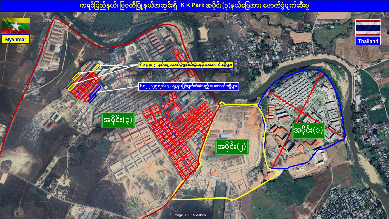 KK Park နယ်မြေအတွင်းရှိ အွန်လိုင်းလိမ်လည်မှုနှင့် လောင်းကစားမှုများကျူးလွန်ရာတွင် အသုံးပြုသည့် အဆောက်အအုံများ ဆက်လက်ဖြိုချဖျက်ဆီး၊ မြဝတီမြို့၊ မဲ့ထော်သလေးကျေးရွာအနီး တရားမဝင်အွန်လိုင်းလောင်းကစားမှုကျူးလွန်သူ ၉၆ ဦး ထပ်မံဖမ်းဆီးရမိ နေပြည်တော်၊ ၂၀၂၅ ဒီဇင်ဘာ ၆
