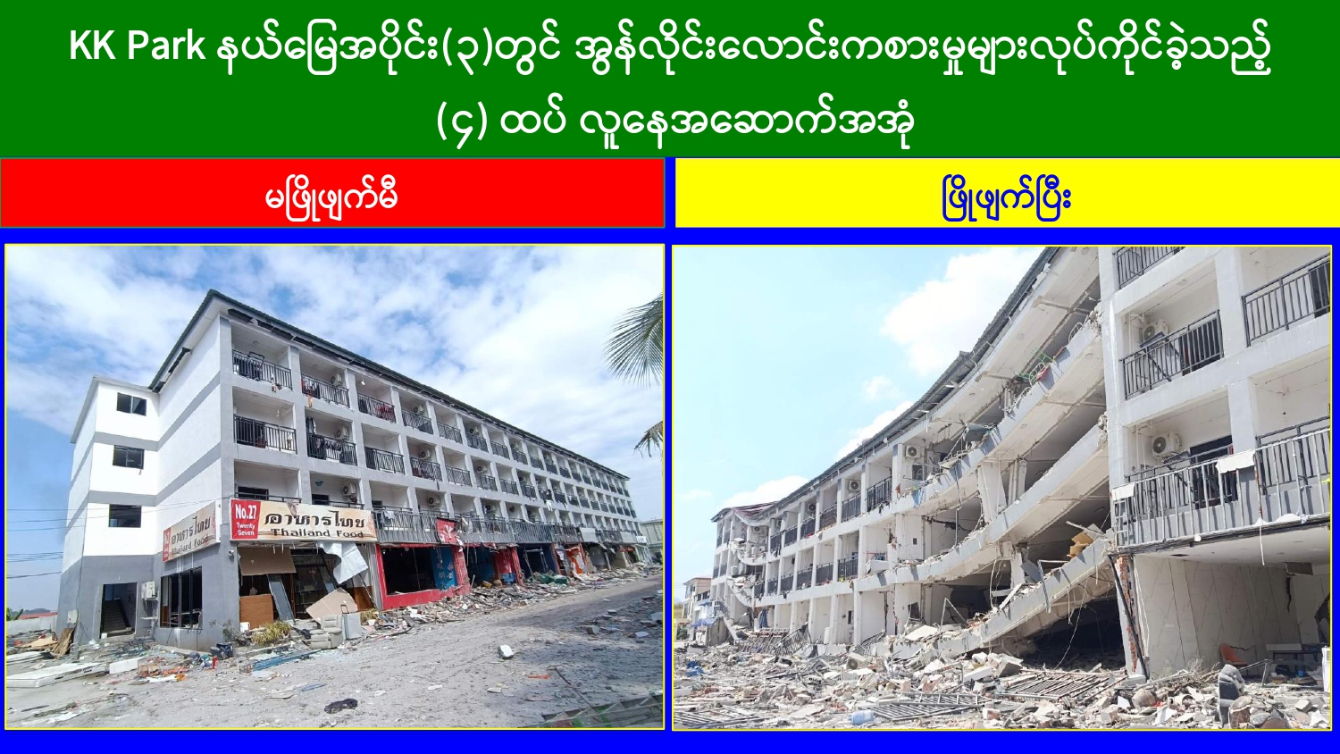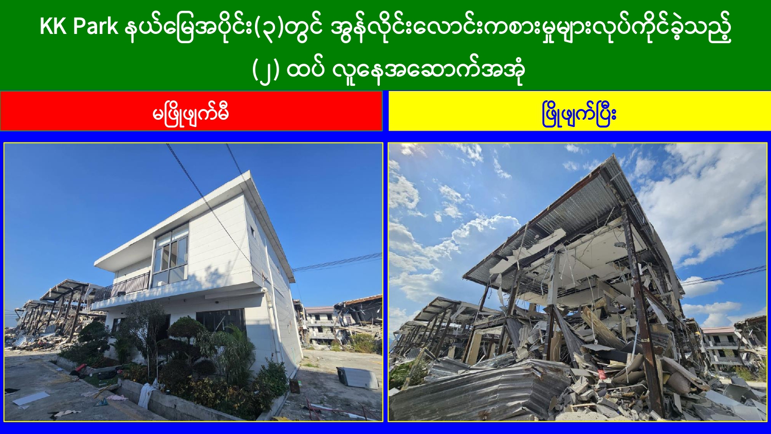 ယနေ့တွင် မြဝတီ-မဲထော်သလေး (KK Park) အပိုင်း (၃) နယ်မြေအတွင်းရှိ တရား မဝင်အဆောက်အအုံများဖြစ်သော ၂ ထပ်အဆောက်အအုံ ၁၀ လုံး၊ ၄ ထပ်အဆောက် အအုံ ၃ လုံး၊ စုစုပေါင်း တရားမဝင်အဆောက်အအုံ ၁၃ လုံးကို ထပ်မံဖြိုချဖျက်ဆီးခဲ့သဖြင့် အပိုင်း(၃)နယ်မြေအတွင်းရှိ အဆောက်အအုံ ၄၂၅ လုံးအနက် ယနေ့အထိ ၁၇၃ လုံး ဖြိုချဖျက်ဆီးခဲ့ကြောင်းနှင့် KK Park နယ်မြေအတွင်းရှိ တရားမဝင် အဆောက်အအုံ စုစုပေါင်း ၆၃၅ လုံး အနက် ၃၂၁ လုံးကို ဖြိုချဖျက်ဆီးပြီးဖြစ်ကြောင်း သိရှိရသည်။