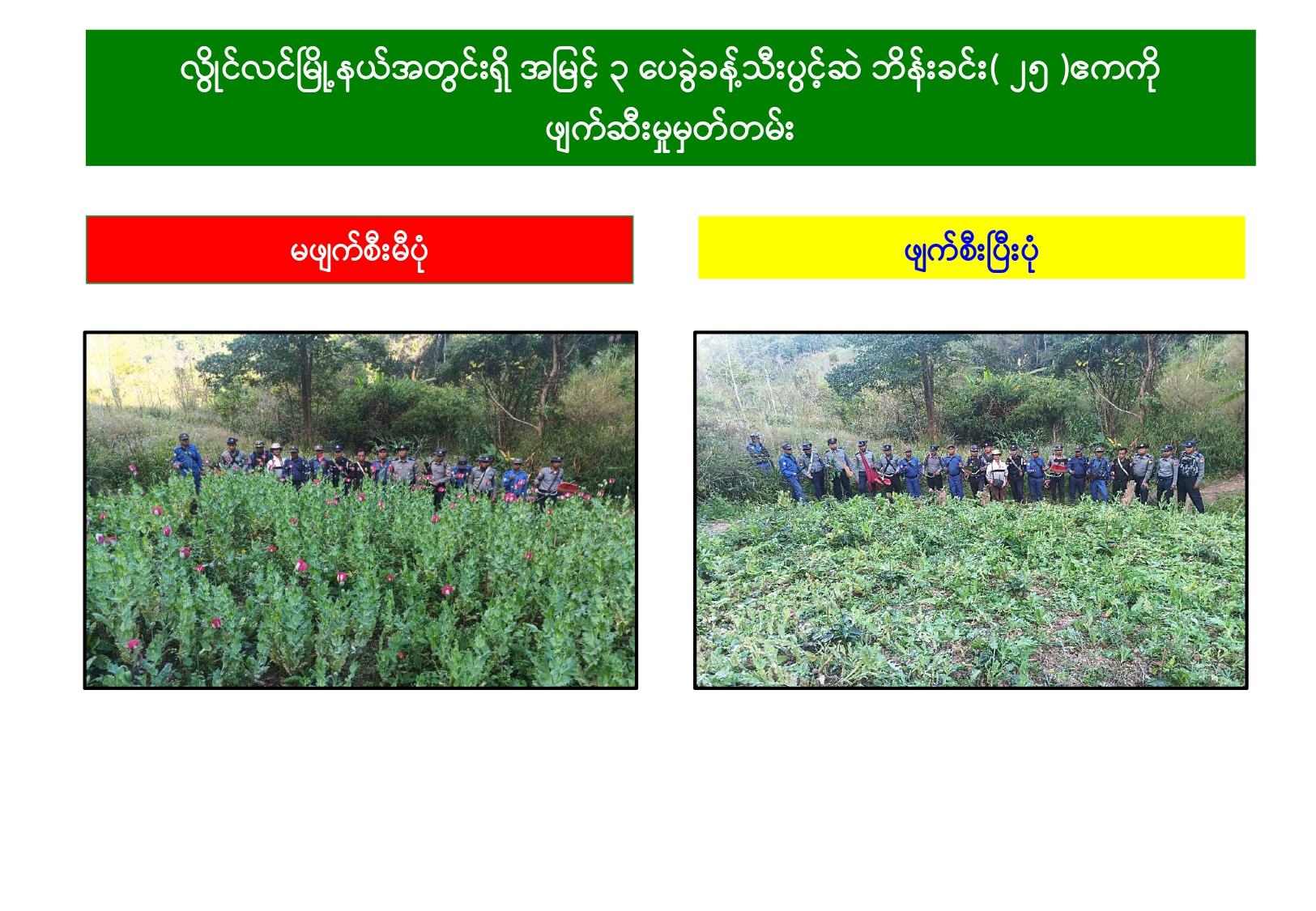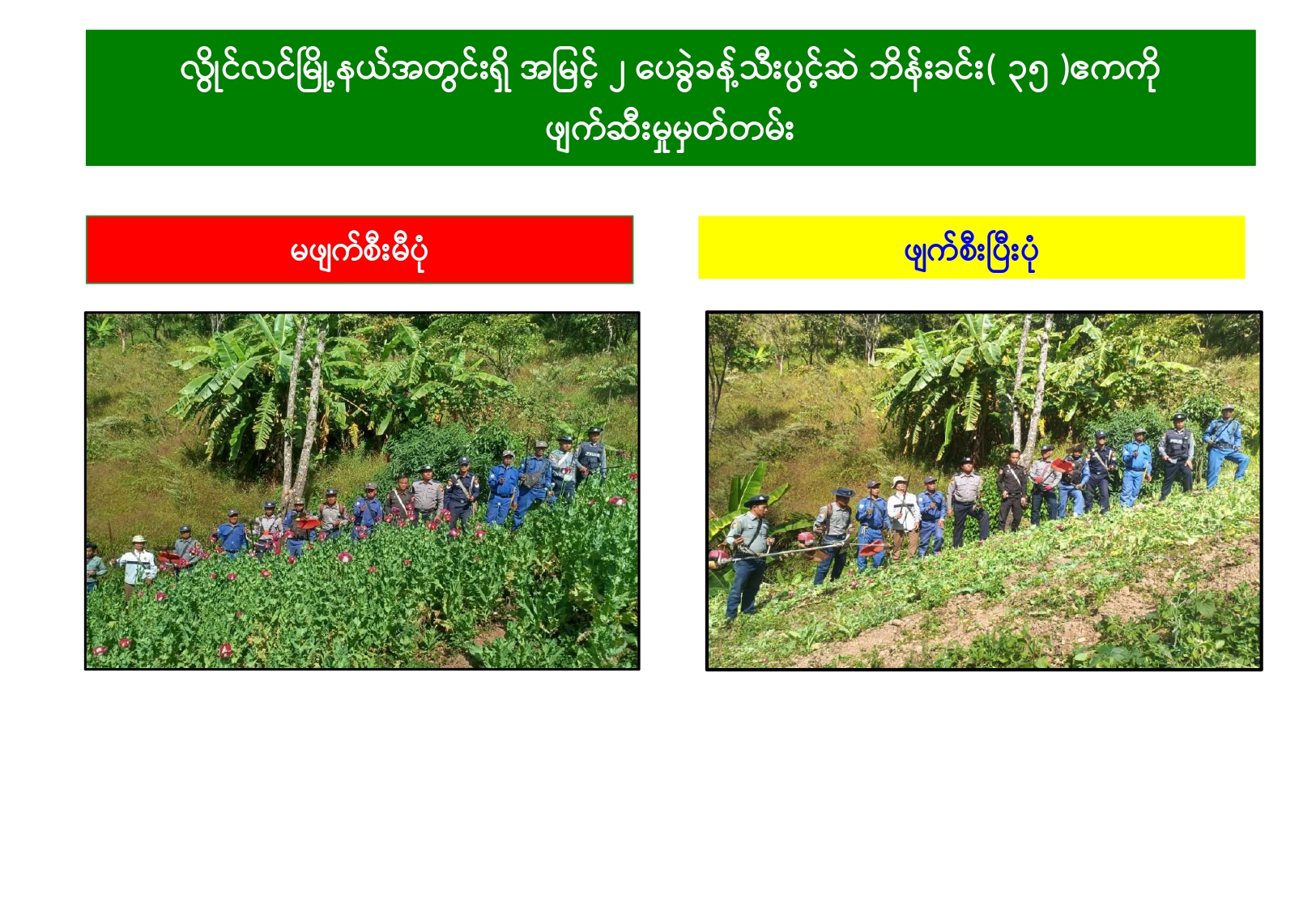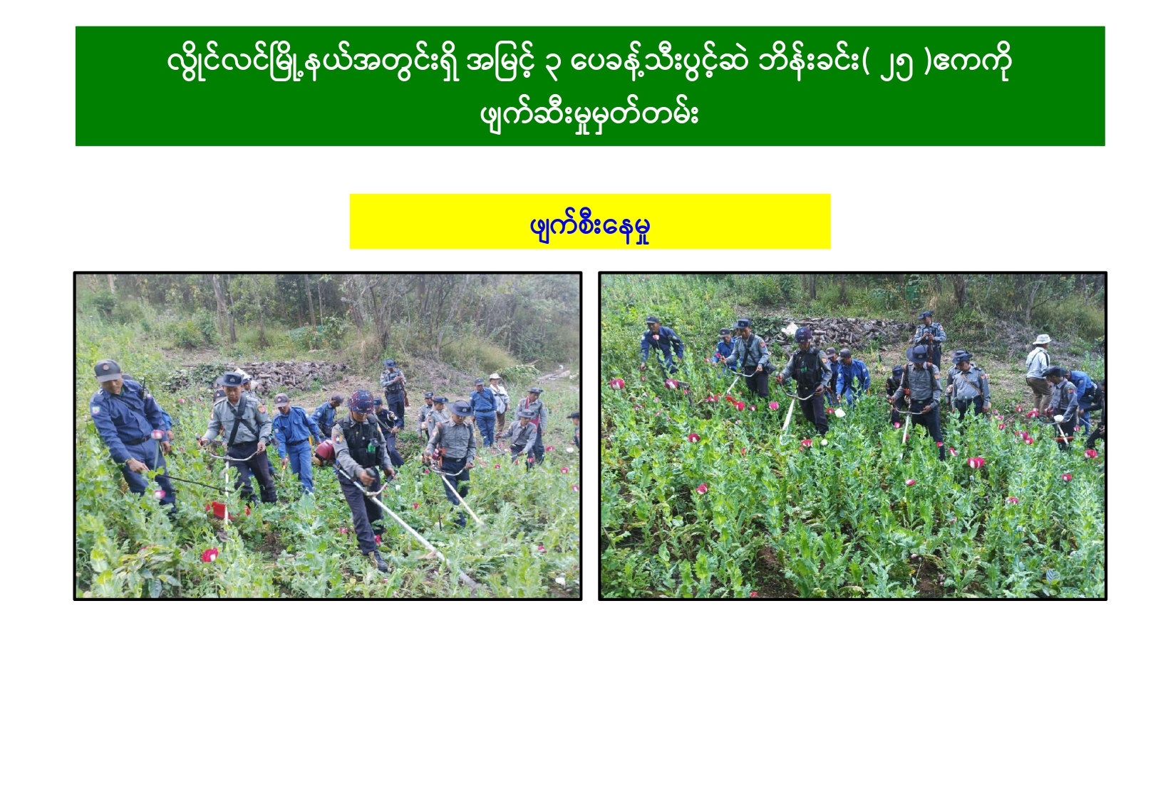 ထိုသို့ ဆောင်ရွက်လျက်ရှိရာ တပ်မတော်သားများ၊ မြန်မာနိုင်ငံရဲတပ်ဖွဲ့၊ အထွေထွေ အုပ်ချုပ်ရေးဦးစီးဌာန၊ သစ်တောဦးစီးဌာန၊ လယ်ယာမြေစီမံခန့်ခွဲရေးနှင့် စာရင်းအင်းဦးစီး ဌာနတို့အပါအဝင် ဆက်စပ်ဦးစီးဌာနများပါဝင်သော ပူးပေါင်းအဖွဲ့များ၊ နယ်မြေခံ ပြည်သူ့စစ်အဖွဲ့ဝင်များနှင့် ဒေသခံတိုင်းရင်းသားပြည်သူများပါဝင်သော ပူးပေါင်းအဖွဲ့ သည် ဒီဇင်ဘာ ၉ ရက်နှင့် ယနေ့တို့တွင်လည်း ရှမ်းပြည်နယ်(တောင်ပိုင်း)၊ လွိုင်လင် မြို့နယ်၊ ဆင်ခြေဖုံးကျေးရွာအုပ်စု၊ လုံအောင်ကျေးရွာ၏ အနောက်တောင်ဘက် ၂ မိုင်ခန့် အကွာရှိ အမြင့် ၂ ပေခွဲ သီးပွင့်ဆဲ ဘိန်းခင်း ၃၅ ဧကအား လည်းကောင်း၊ စံဖူးကျေးရွာ၏ အနောက်တောင်ဘက် ၂ မိုင်ခန့်အကွာရှိ အမြင့် ၃ ပေခွဲ၊ သီးပွင့်ဆဲ ဘိန်းခင်း ၂၅ ဧက အားလည်းကောင်း၊ တောင်နောက်ကျေးရွာအုပ်စု၊ တောင်နောက်ကျေးရွာ၏ အနောက် တောင်ဘက် ၃ မိုင်ခန့်အကွာရှိ အမြင့် ၃ ပေ သီးပွင့်ဆဲ ဘိန်းခင်း ၃၀ ဧကနှင့် ကျေးရွာ၏ အနောက်ဘက် ၃ မိုင် ၄ ဖာလုံခန့်အကွာရှိ အမြင့် ၃ ပေ သီးပွင့်ဆဲ ဘိန်းခင်း ၂၅ ဧက အားလည်းကောင်း၊ စုစုပေါင်းဘိန်းခင်း ၁၁၅ ဧကတို့အား သွားရောက်ဖျက်ဆီးခဲ့ကြောင်း နှင့် ဘိန်းခင်း ဖျက်ဆီးမှုများကို ဆက်လက်ဆောင်ရွက်သွားမည်ဖြစ်ကြောင်း သတင်းရရှိ သည်။