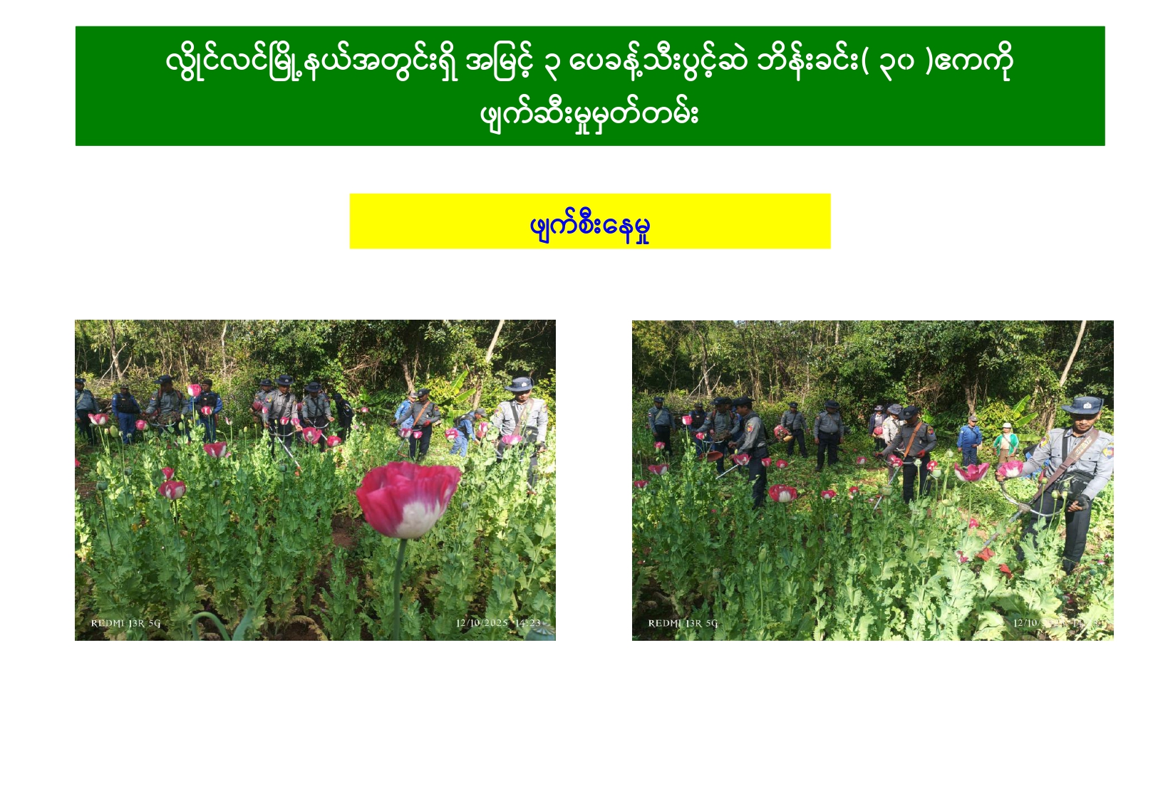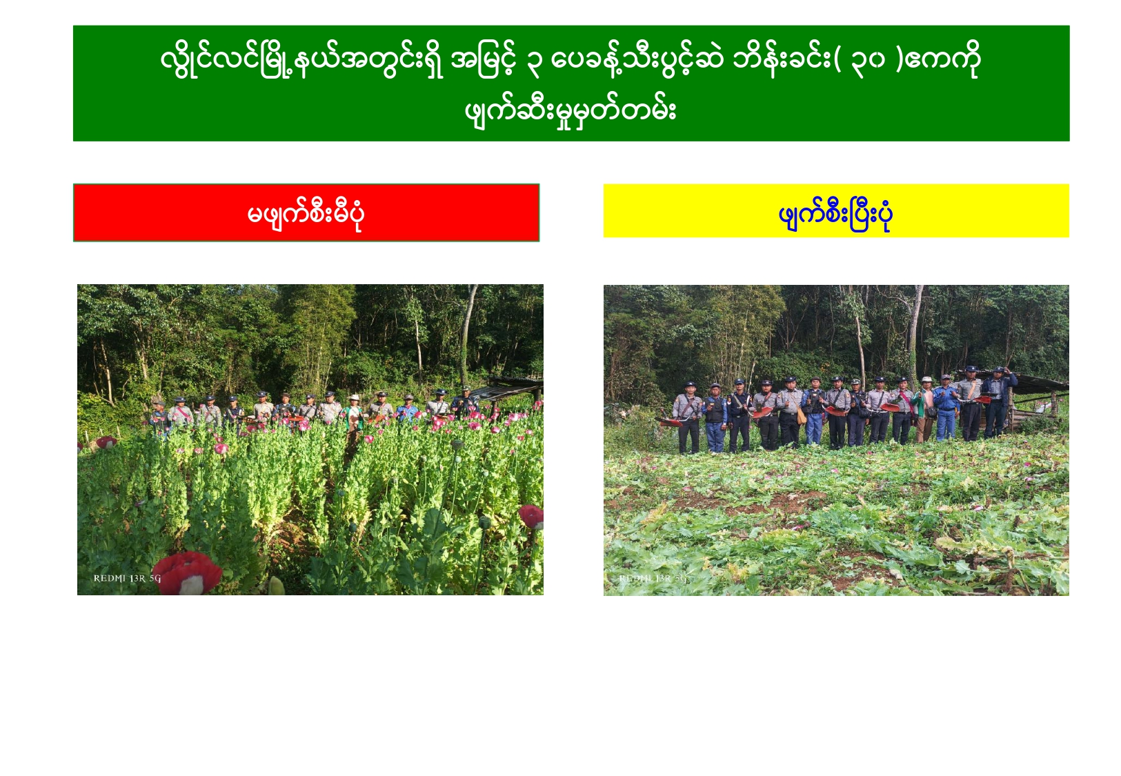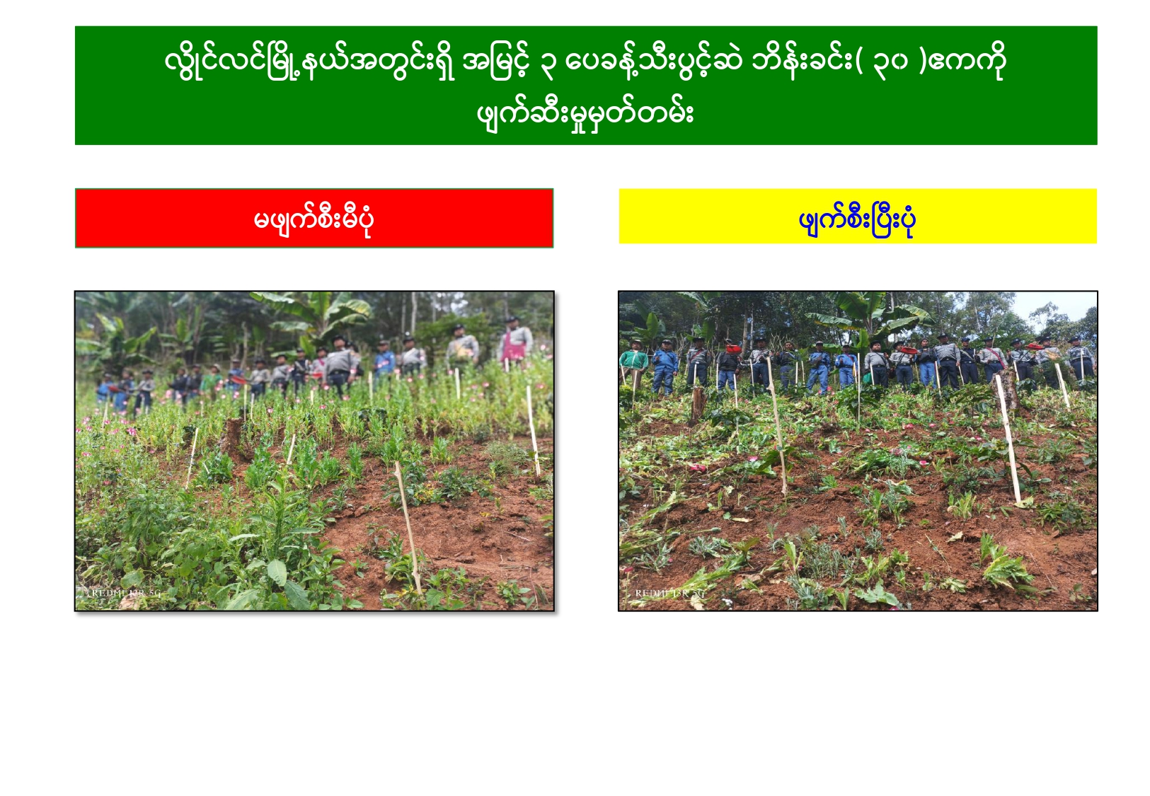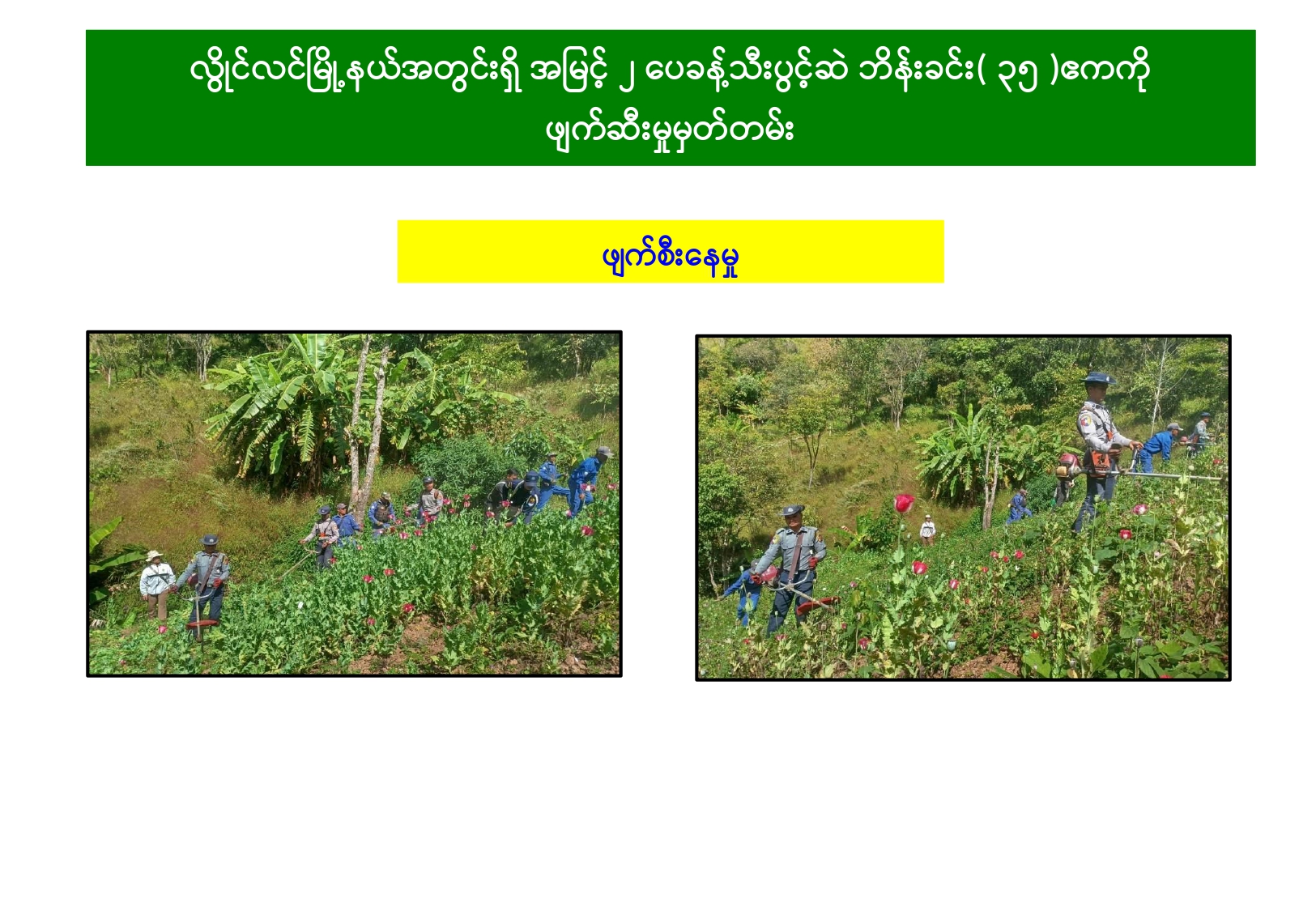 ထိုသို့ ဆောင်ရွက်လျက်ရှိရာ တပ်မတော်သားများ၊ မြန်မာနိုင်ငံရဲတပ်ဖွဲ့၊ အထွေထွေ အုပ်ချုပ်ရေးဦးစီးဌာန၊ သစ်တောဦးစီးဌာန၊ လယ်ယာမြေစီမံခန့်ခွဲရေးနှင့် စာရင်းအင်းဦးစီး ဌာနတို့အပါအဝင် ဆက်စပ်ဦးစီးဌာနများပါဝင်သော ပူးပေါင်းအဖွဲ့များ၊ နယ်မြေခံ ပြည်သူ့စစ်အဖွဲ့ဝင်များနှင့် ဒေသခံတိုင်းရင်းသားပြည်သူများပါဝင်သော ပူးပေါင်းအဖွဲ့ သည် ဒီဇင်ဘာ ၉ ရက်နှင့် ယနေ့တို့တွင်လည်း ရှမ်းပြည်နယ်(တောင်ပိုင်း)၊ လွိုင်လင် မြို့နယ်၊ ဆင်ခြေဖုံးကျေးရွာအုပ်စု၊ လုံအောင်ကျေးရွာ၏ အနောက်တောင်ဘက် ၂ မိုင်ခန့် အကွာရှိ အမြင့် ၂ ပေခွဲ သီးပွင့်ဆဲ ဘိန်းခင်း ၃၅ ဧကအား လည်းကောင်း၊ စံဖူးကျေးရွာ၏ အနောက်တောင်ဘက် ၂ မိုင်ခန့်အကွာရှိ အမြင့် ၃ ပေခွဲ၊ သီးပွင့်ဆဲ ဘိန်းခင်း ၂၅ ဧက အားလည်းကောင်း၊ တောင်နောက်ကျေးရွာအုပ်စု၊ တောင်နောက်ကျေးရွာ၏ အနောက် တောင်ဘက် ၃ မိုင်ခန့်အကွာရှိ အမြင့် ၃ ပေ သီးပွင့်ဆဲ ဘိန်းခင်း ၃၀ ဧကနှင့် ကျေးရွာ၏ အနောက်ဘက် ၃ မိုင် ၄ ဖာလုံခန့်အကွာရှိ အမြင့် ၃ ပေ သီးပွင့်ဆဲ ဘိန်းခင်း ၂၅ ဧက အားလည်းကောင်း၊ စုစုပေါင်းဘိန်းခင်း ၁၁၅ ဧကတို့အား သွားရောက်ဖျက်ဆီးခဲ့ကြောင်း နှင့် ဘိန်းခင်း ဖျက်ဆီးမှုများကို ဆက်လက်ဆောင်ရွက်သွားမည်ဖြစ်ကြောင်း သတင်းရရှိ သည်။