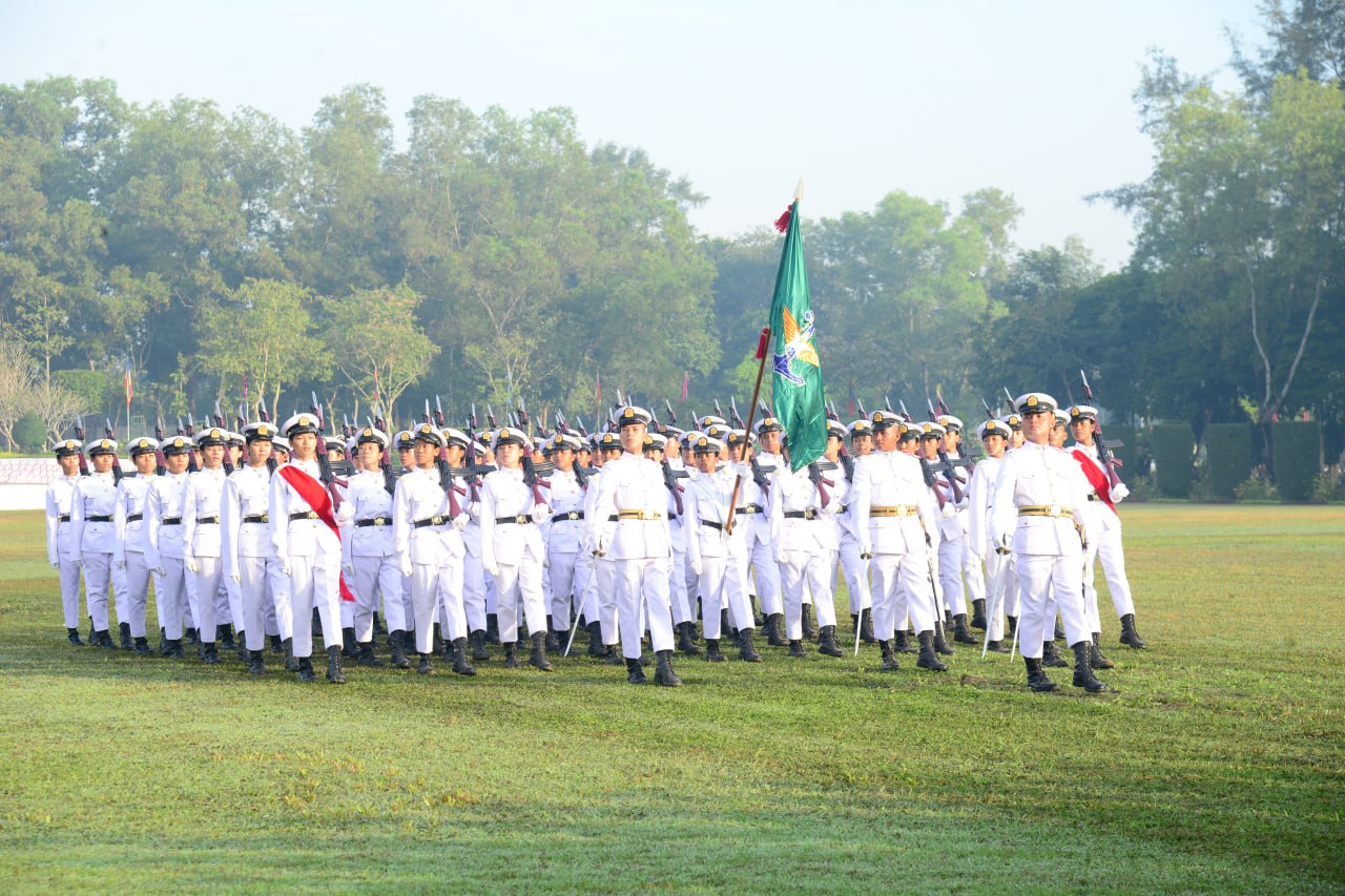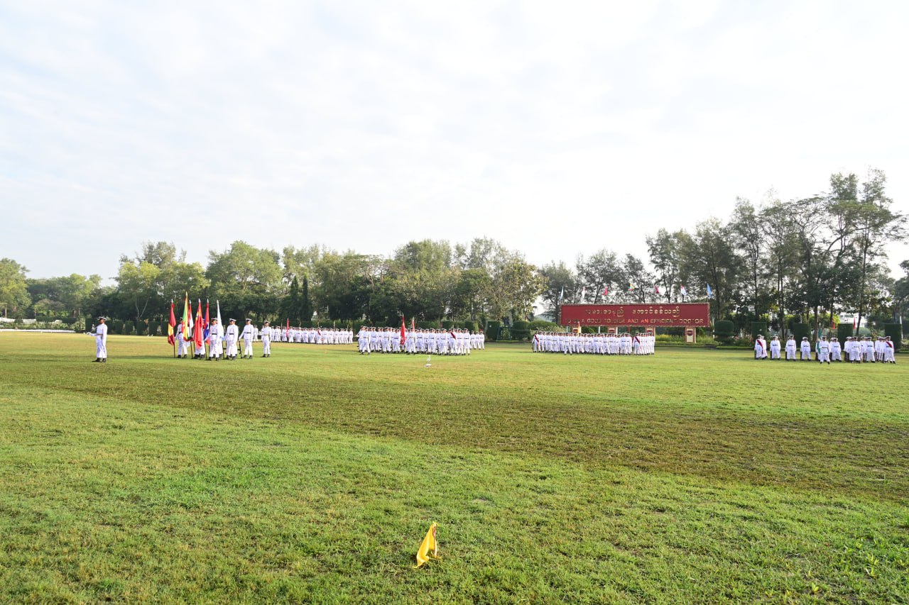 ဦးစွာ နိုင်ငံတော်လုံခြုံရေးနှင့် အေးချမ်းသာယာရေးကော်မရှင် ဥက္ကဋ္ဌ တပ်မတော် ကာကွယ်ရေးဦးစီးချုပ် ဗိုလ်ချုပ်မှူးကြီး သတိုးမဟာသရေစည်သူ သတိုးသီရိသုဓမ္မ မင်းအောင်လှိုင် က ဗိုလ်လောင်းတပ်ရင်းများ၏ အလေးပြုခြင်းကိုခံယူပြီး ကျောင်းဆင်း ဗိုလ်လောင်းတပ်ခွဲအား စစ်ဆေးသည်။ ထို့နောက် ဗိုလ်လောင်းတပ်ခွဲများက နိုင်ငံတော် လုံခြုံရေးနှင့် အေးချမ်းသာယာရေးကော်မရှင်ဥက္ကဋ္ဌ တပ်မတော်ကာကွယ်ရေးဦးစီးချုပ် ဗိုလ်ချုပ်မှူးကြီး သတိုးမဟာသရေစည်သူ သတိုးသီရိသုဓမ္မ မင်းအောင်လှိုင် အား အနှေး လျှောက်၊ အမြန်လျှောက်ဖြင့် ချီတက်အလေးပြုကြသည်။