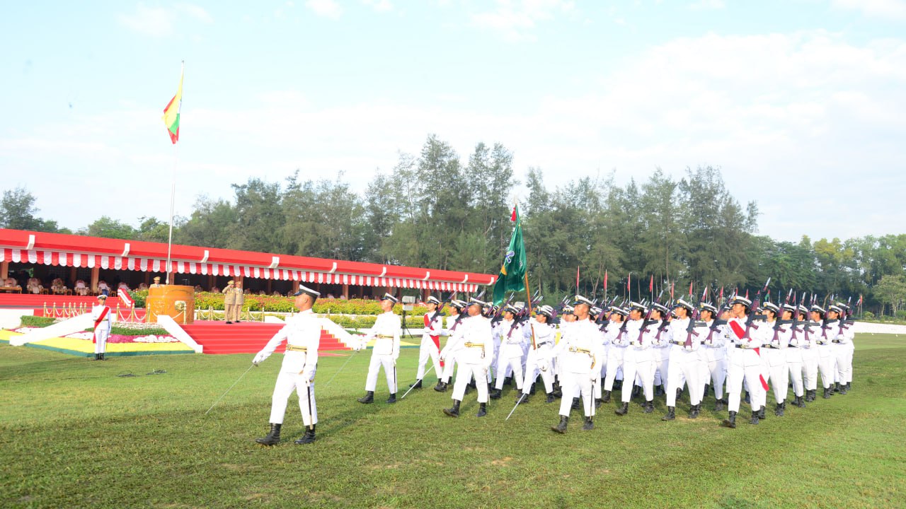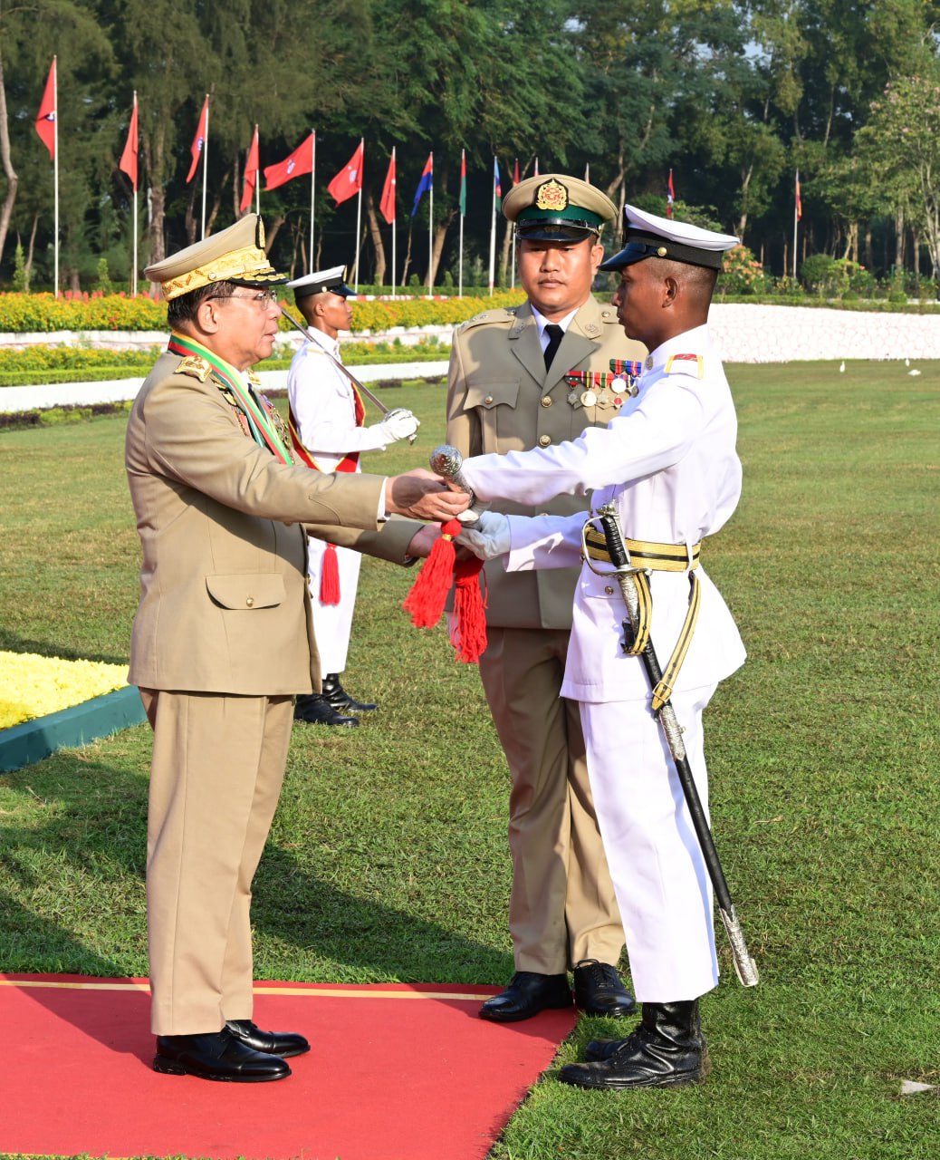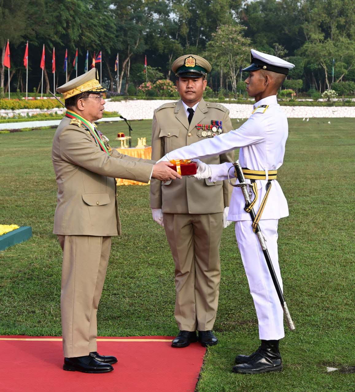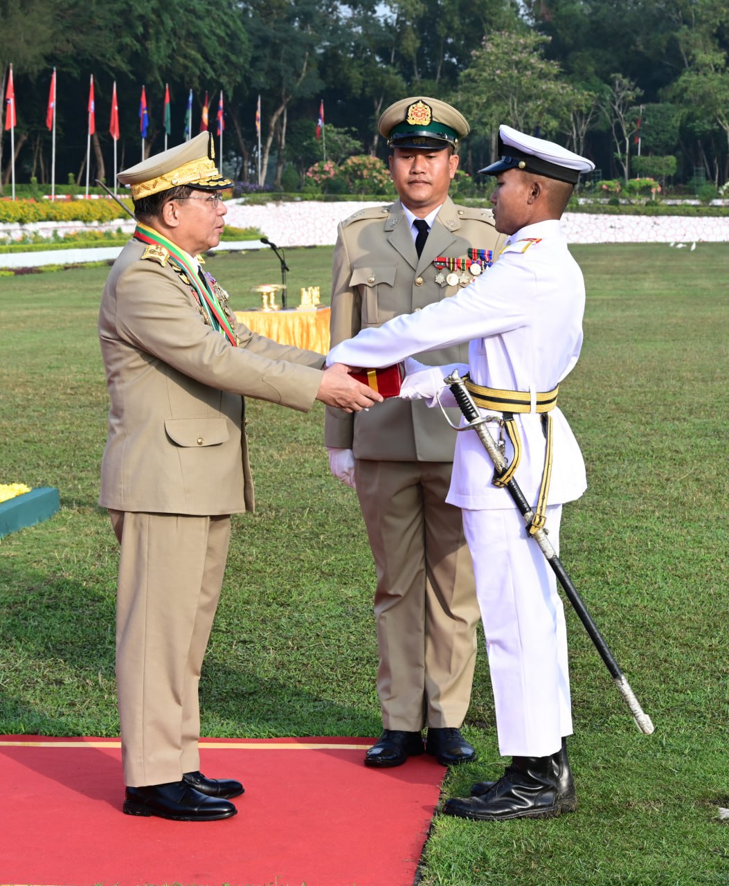 ယင်းနောက် နိုင်ငံတော်လုံခြုံရေးနှင့် အေးချမ်းသာယာရေးကော်မရှင် ဥက္ကဋ္ဌ တပ်မတော်ကာကွယ်ရေးဦးစီးချုပ် ဗိုလ်ချုပ်မှူးကြီး သတိုးမဟာသရေစည်သူ သတိုးသီရိ သုဓမ္မ မင်းအောင်လှိုင် သည် ဗိုလ်လောင်းတပ်ခွဲများ၏ အလေးပြုခြင်းကိုခံယူပြီး စစ်ရေးပြ အခမ်းအနားမှ ပြန်လည်ထွက်ခွာသည်။