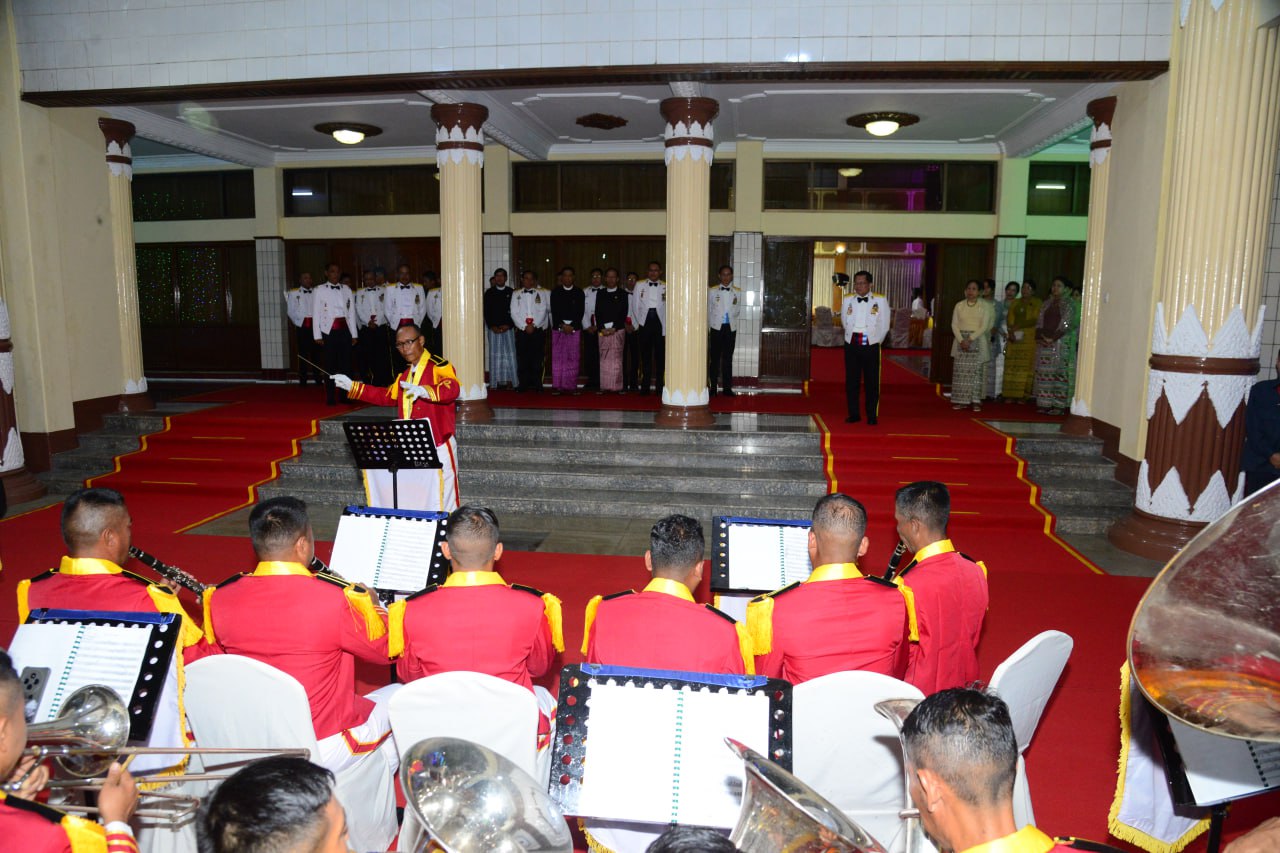 ညစာသုံးဆောင်အပြီးတွင် နိုင်ငံတော်လုံခြုံရေးနှင့် အေးချမ်းသာယာရေးကော်မရှင် ဥက္ကဋ္ဌ တပ်မတော်ကာကွယ်ရေးဦးစီးချုပ် ဗိုလ်ချုပ်မှူးကြီး မင်းအောင်လှိုင် နှင့် အဖွဲ့ဝင် များသည် တပ်မတော်ဆေးတက္ကသိုလ် ဂုဏ်ပြုစစ်တီးဝိုင်းတပ်ဖွဲ့၏ ဂုဏ်ပြုတီးမှုတ်မှုအား ကြည့်ရှုအားပေးပြီး ချီးမြှင့်ငွေများ ပေးအပ်သည်။