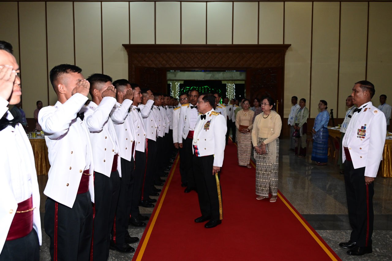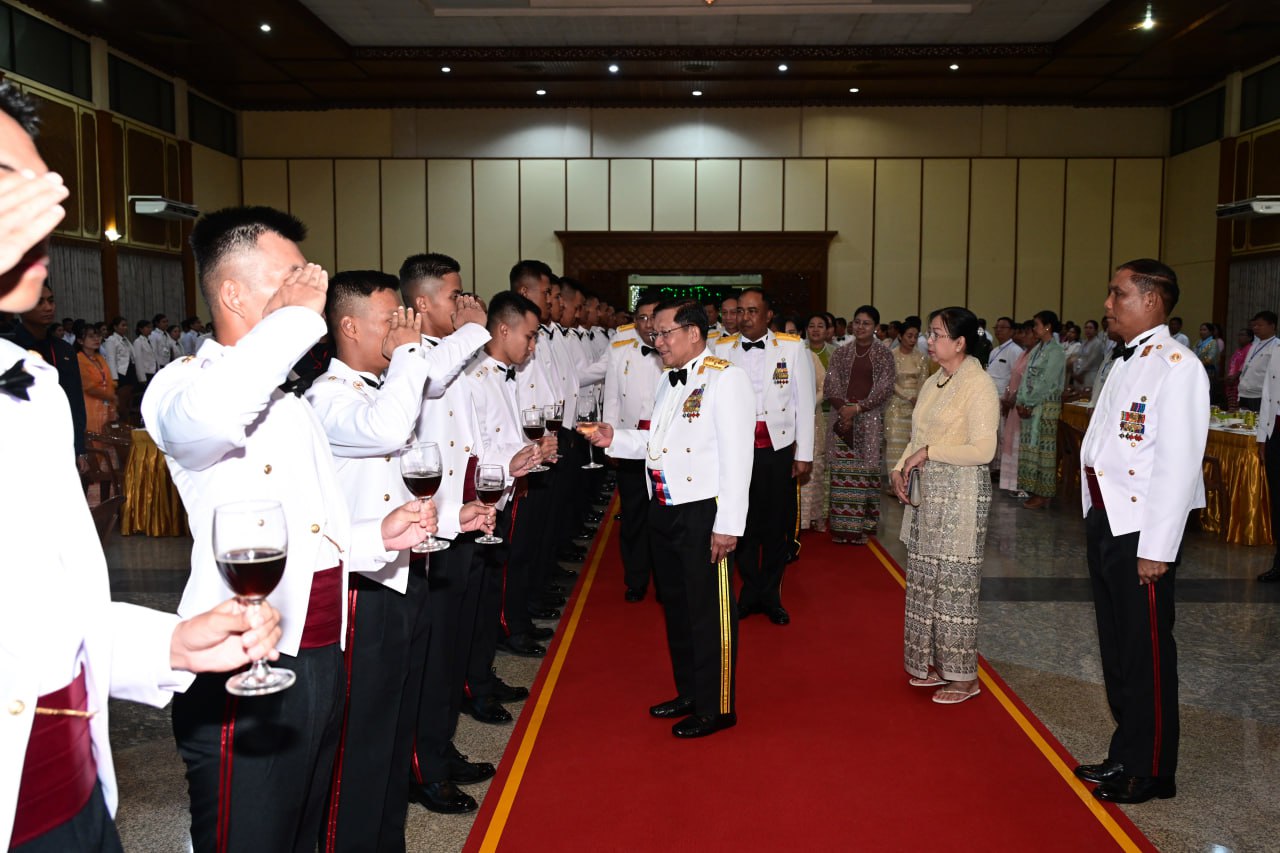 ဦးစွာ နိုင်ငံတော်လုံခြုံရေးနှင့် အေးချမ်းသာယာရေးကော်မရှင်ဥက္ကဋ္ဌ တပ်မတော် ကာကွယ်ရေးဦးစီးချုပ် ဗိုလ်ချုပ်မှူးကြီးမင်းအောင်လှိုင် က သင်တန်းဆင်းအရာရှိများအား တစ်ဦးချင်း ရင်းရင်းနှီးနှီး လိုက်လံနှုတ်ဆက်သည်။ ထို့နောက် နိုင်ငံတော်လုံခြုံရေးနှင့် အေးချမ်းသာယာရေးကော်မရှင်ဥက္ကဋ္ဌ တပ်မတော်ကာကွယ်ရေးဦးစီးချုပ် ဗိုလ်ချုပ်မှူးကြီး မင်းအောင်လှိုင်နှင့် အဖွဲ့ဝင်များသည် သင်တန်းဆင်းအရာရှိများ၊ ညစာစားပွဲ တက်ရောက် လာကြသူများ နှင့်အတူ ဂုဏ်ပြုညစာကို အတူတကွ သုံးဆောင်ကြသည်။