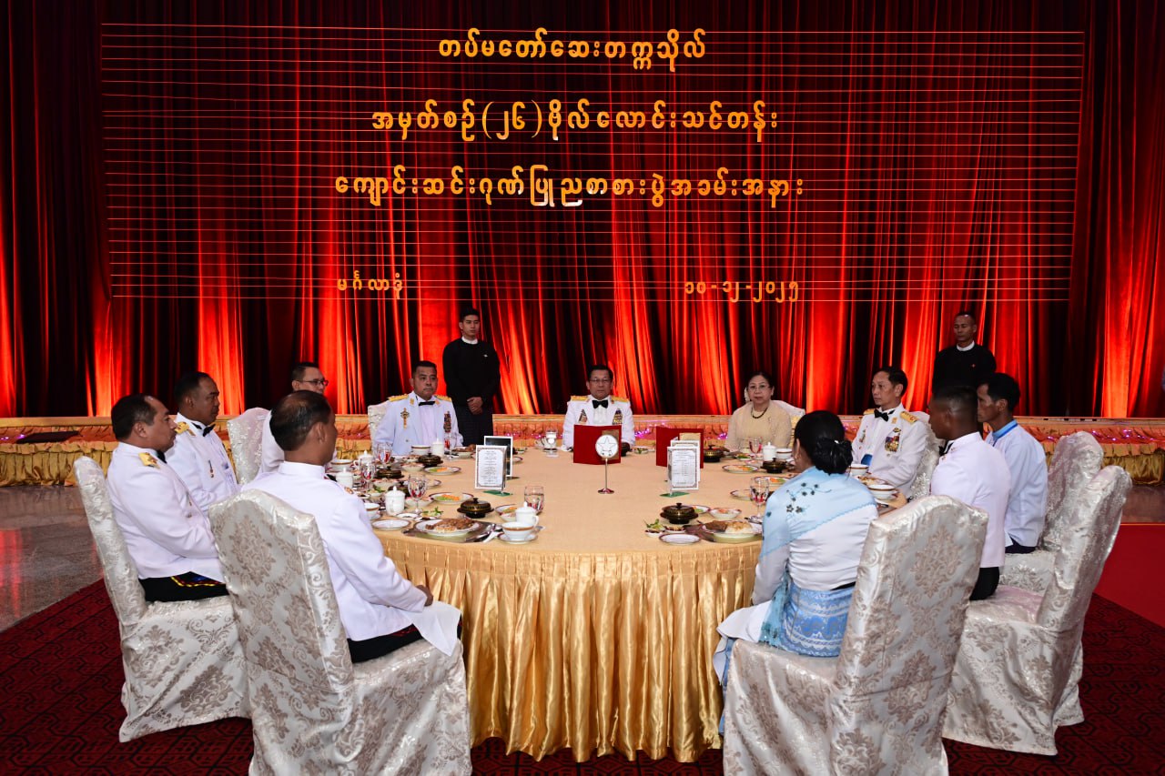 တပ်မတော်ဆေးတက္ကသိုလ်၊ ဗိုလ်လောင်းသင်တန်းအမှတ်စဉ်(၂၆) သင်တန်းဆင်း ဂုဏ်ပြု ညစာစားပွဲအခမ်းအနားကို ယနေ့ညနေပိုင်းတွင် ရန်ကုန်မြို့ရှိ တပ်မတော် ဆေးတက္ကသိုလ် ဘွဲ့နှင်းသဘင်ခန်းမဆောင်ကြီး၏ စုဝေးခန်းမ၌ ကျင်းပပြုလုပ်ရာ နိုင်ငံတော်လုံခြုံရေးနှင့် အေးချမ်းသာယာရေးကော်မရှင် ဥက္ကဋ္ဌ တပ်မတော်ကာကွယ်ရေး ဦးစီးချုပ် ဗိုလ်ချုပ်မှူးကြီး မင်းအောင်လှိုင် တက်ရောက်ချီးမြှင့်သည်။